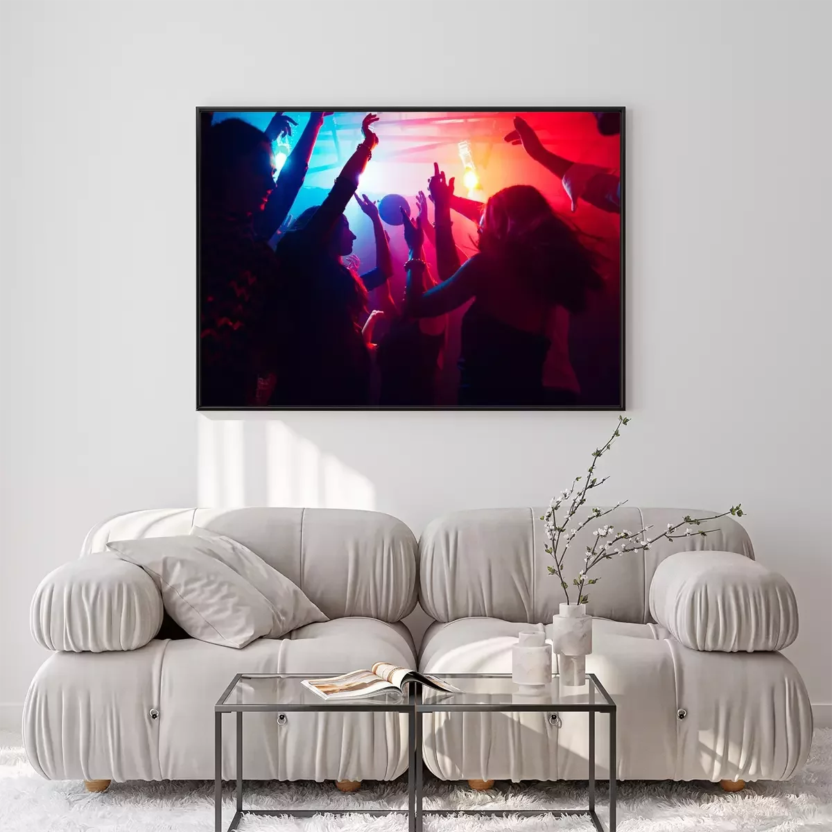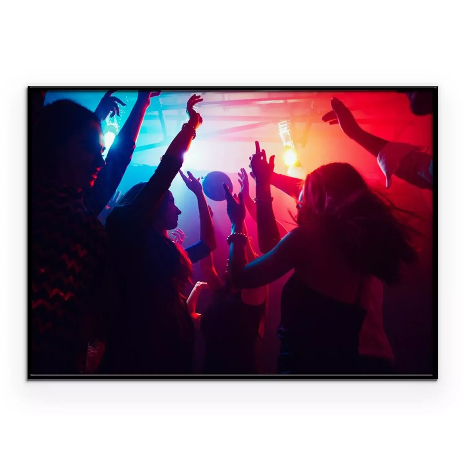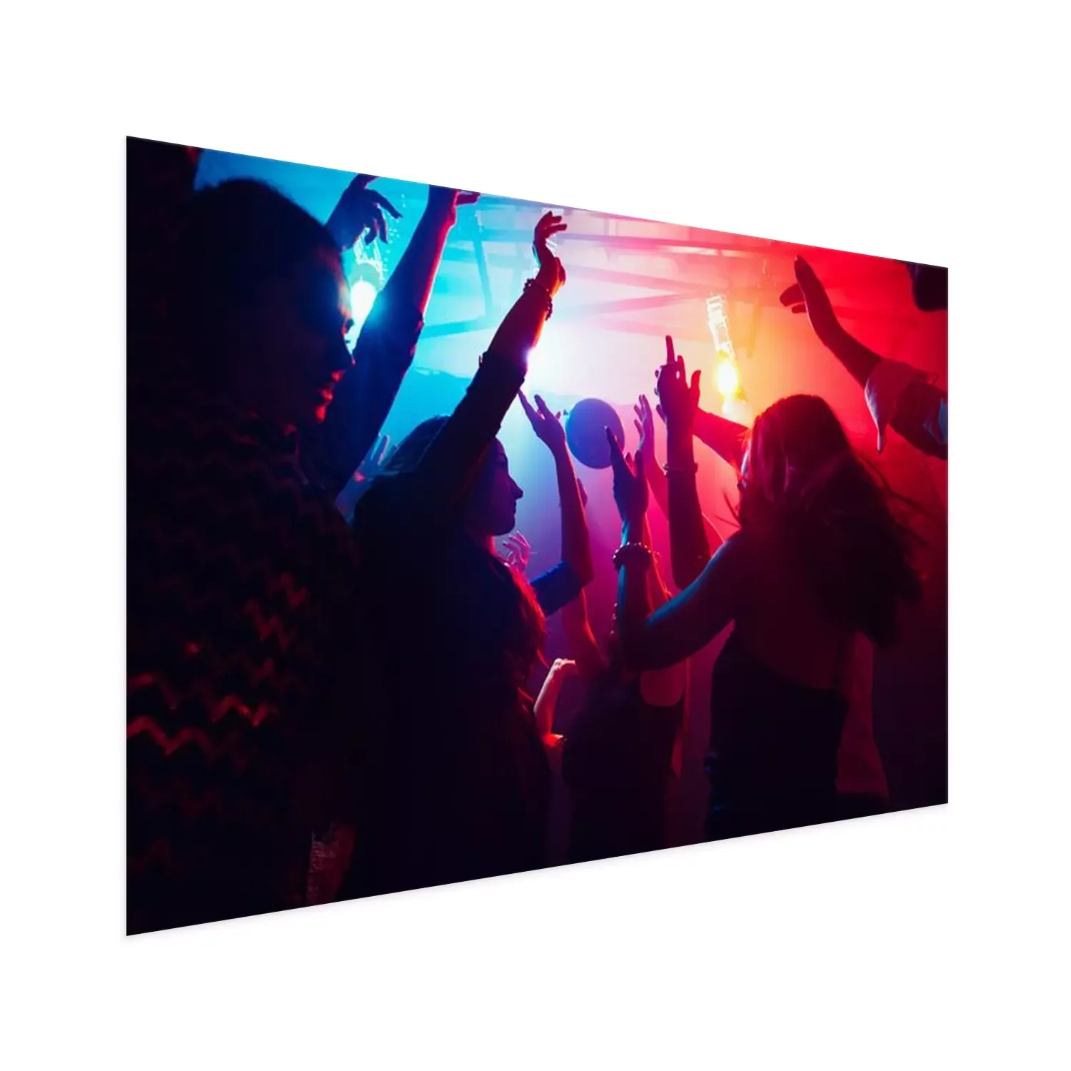 Poster  A crowd of people in silhouette raises their hands on dancefloor on neon light background. Night life, club, music, dance, motion, youth. Purple-pink colors and moving girls and boys.
