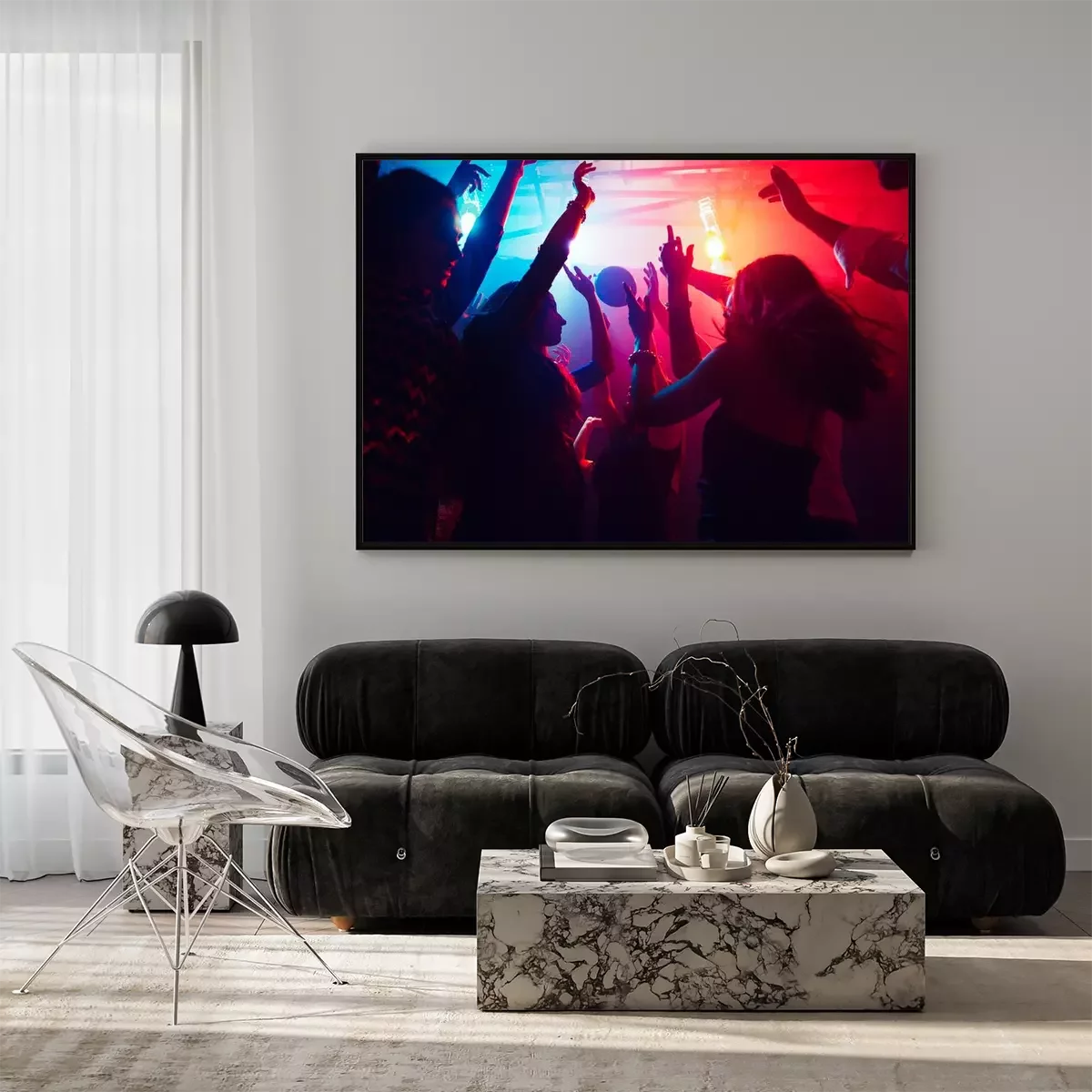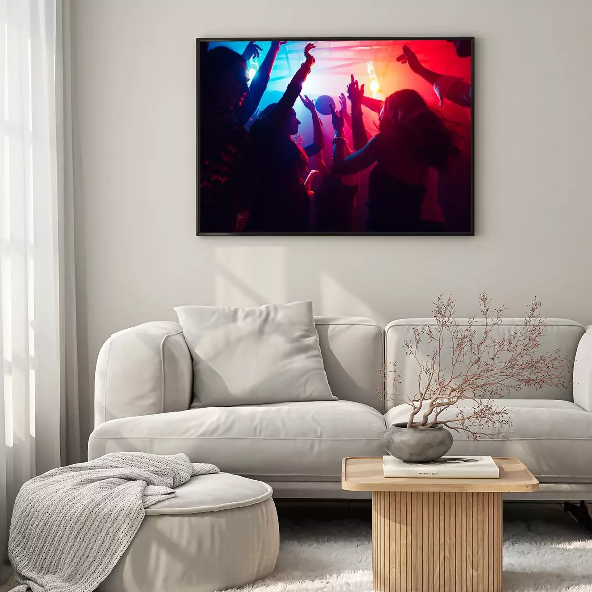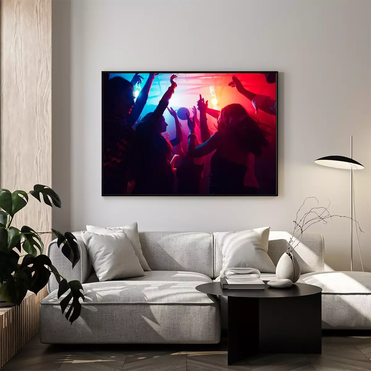Poster  A crowd of people in silhouette raises their hands on dancefloor on neon light background. Night life, club, music, dance, motion, youth. Purple-pink colors and moving girls and boys.