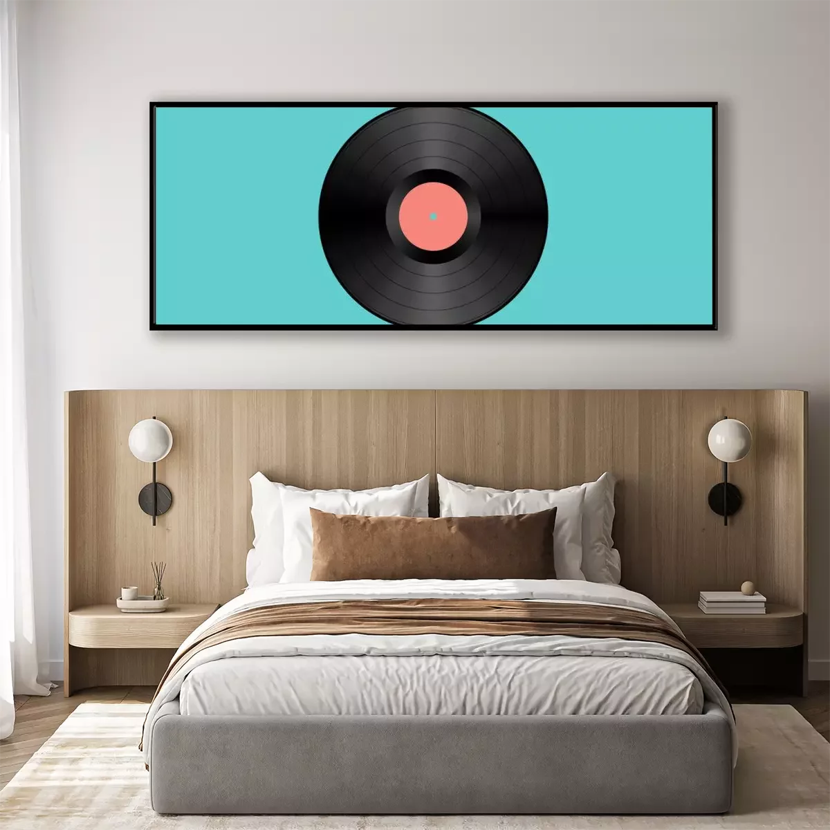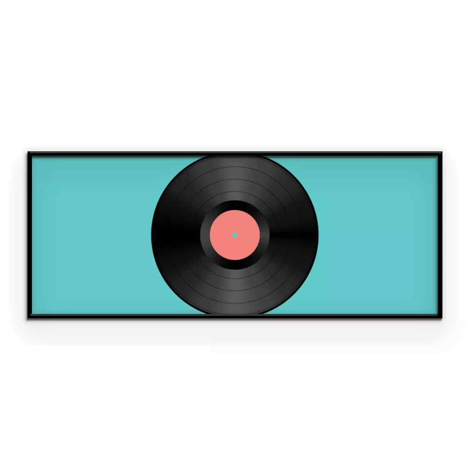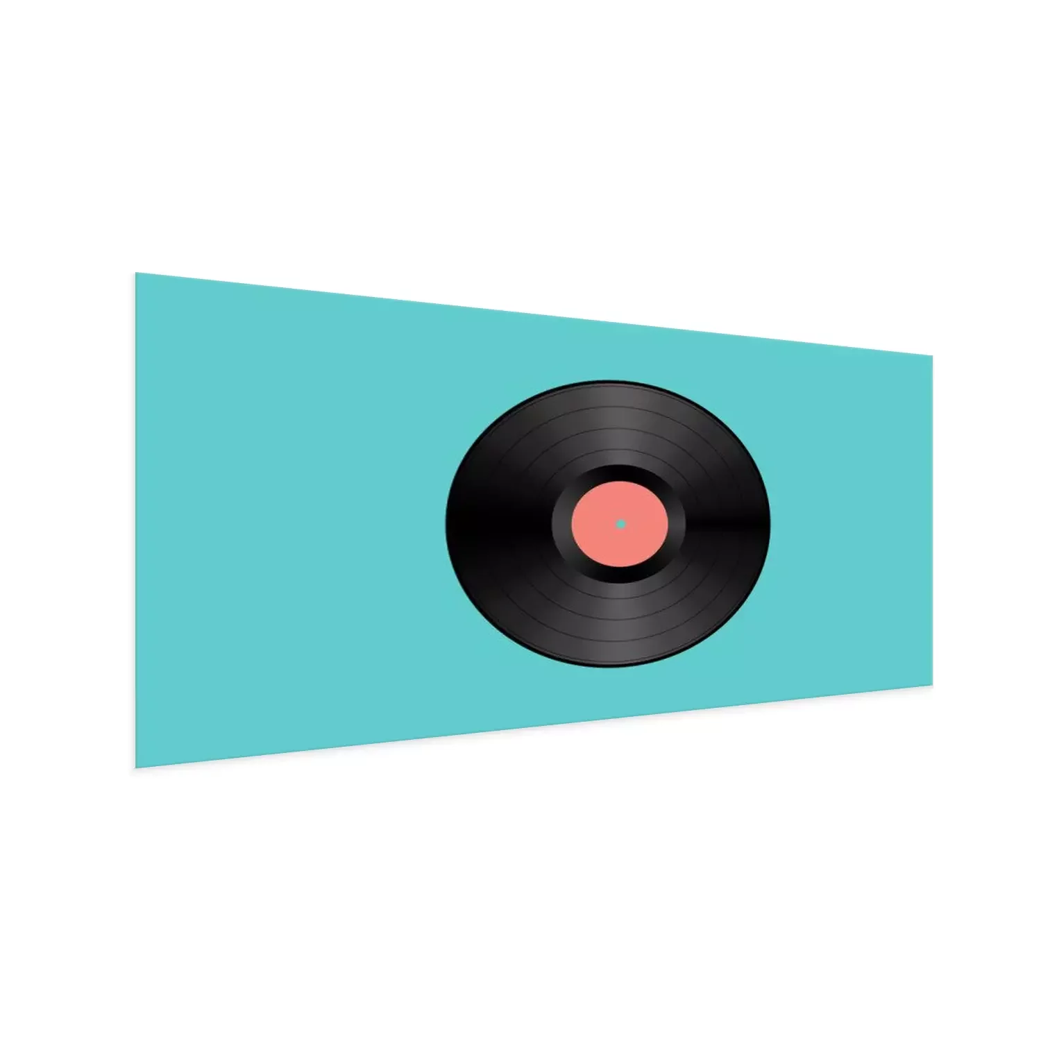 Poster  A single black retro vinyl record with a coral label against a bright teal background