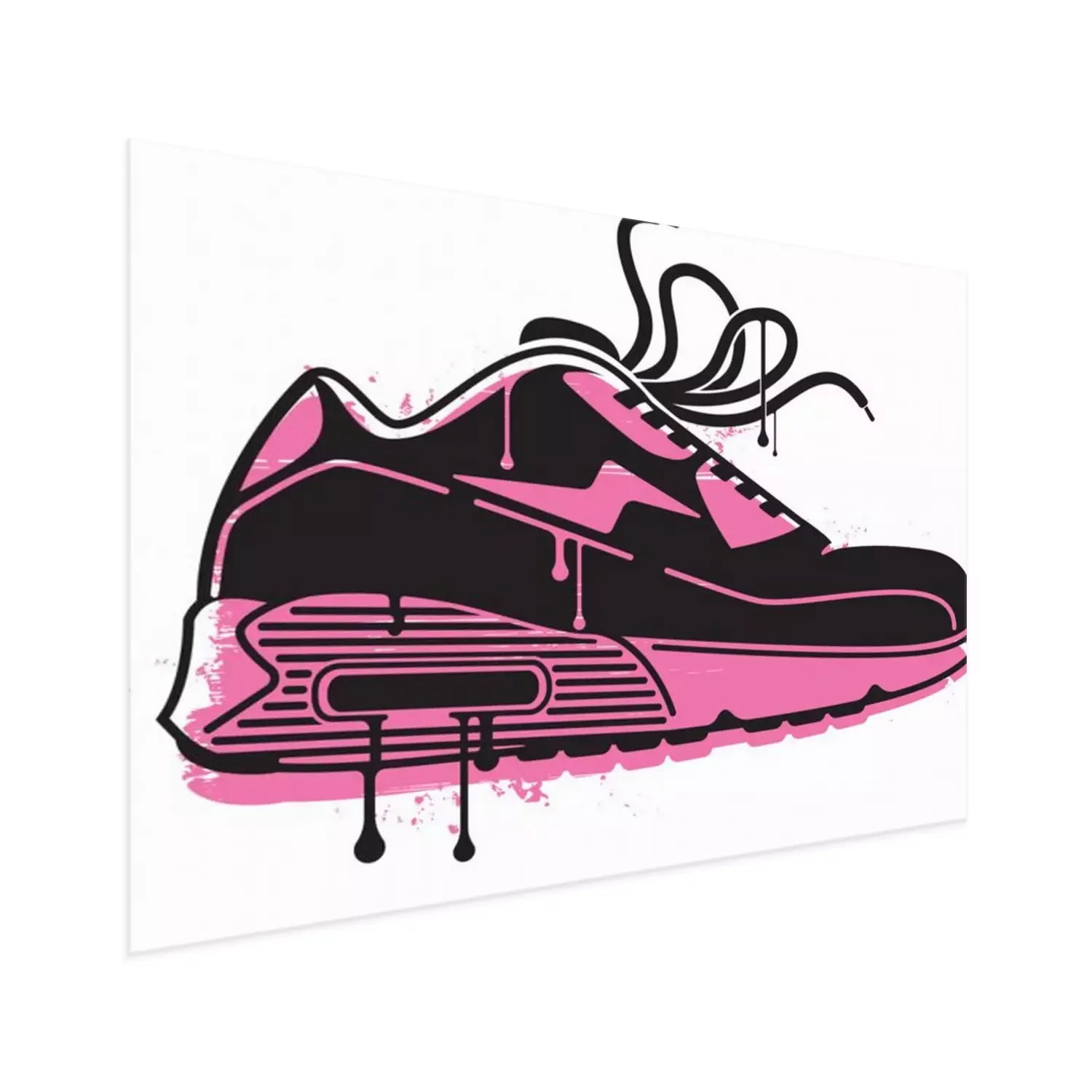 Poster  A stylised stencil image of a sneaker, with a magenta back ground layer and a black paint layer.
