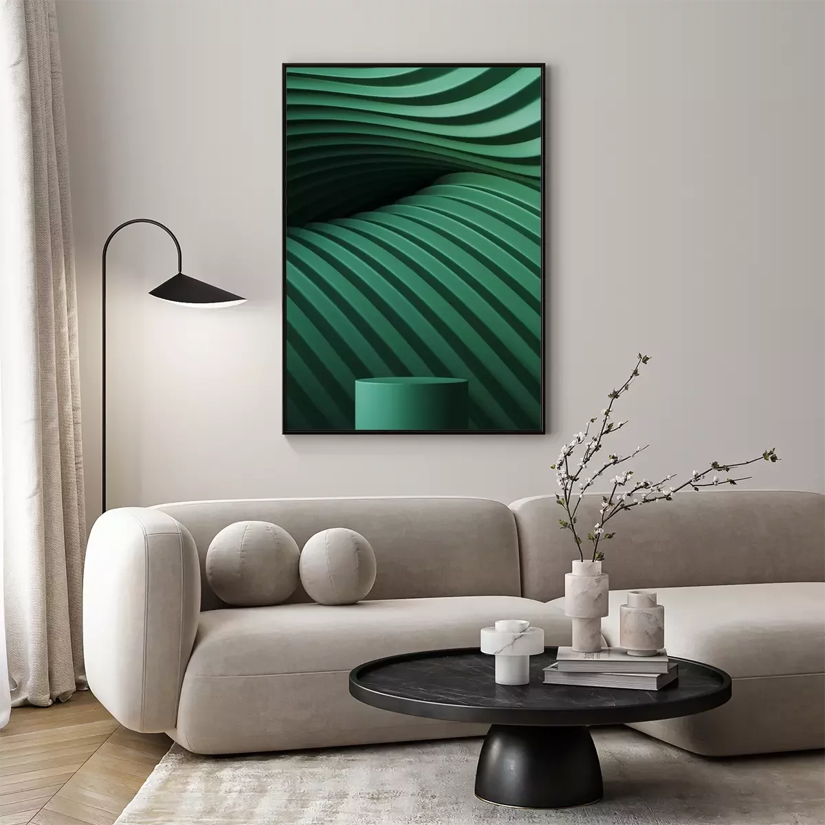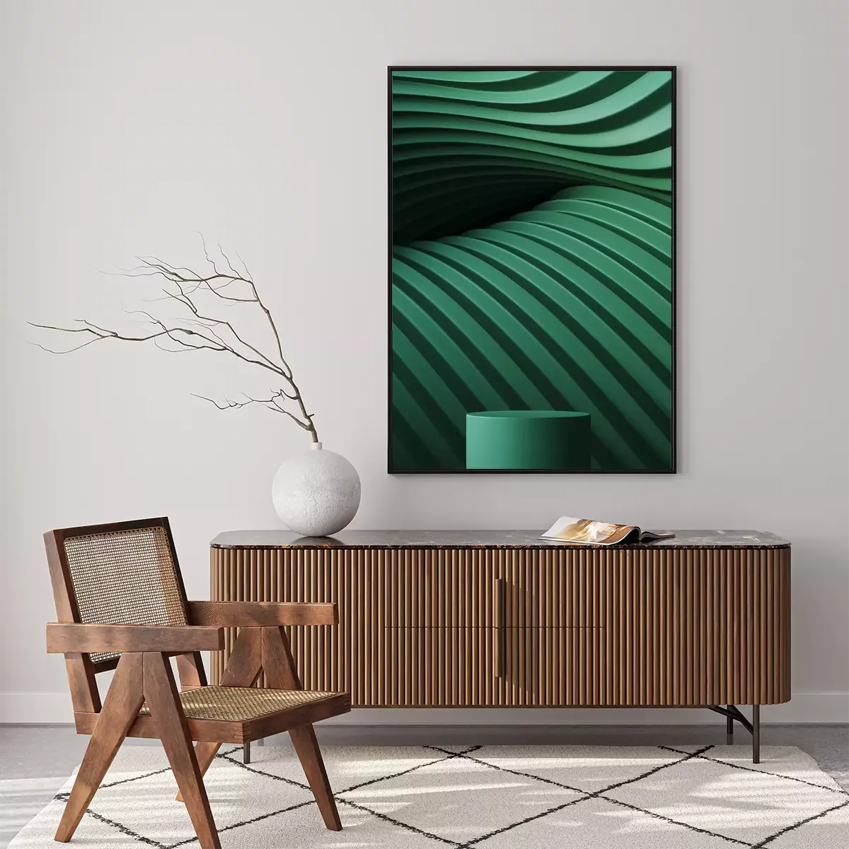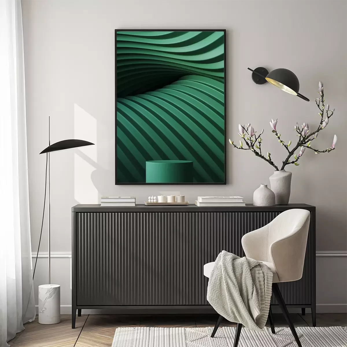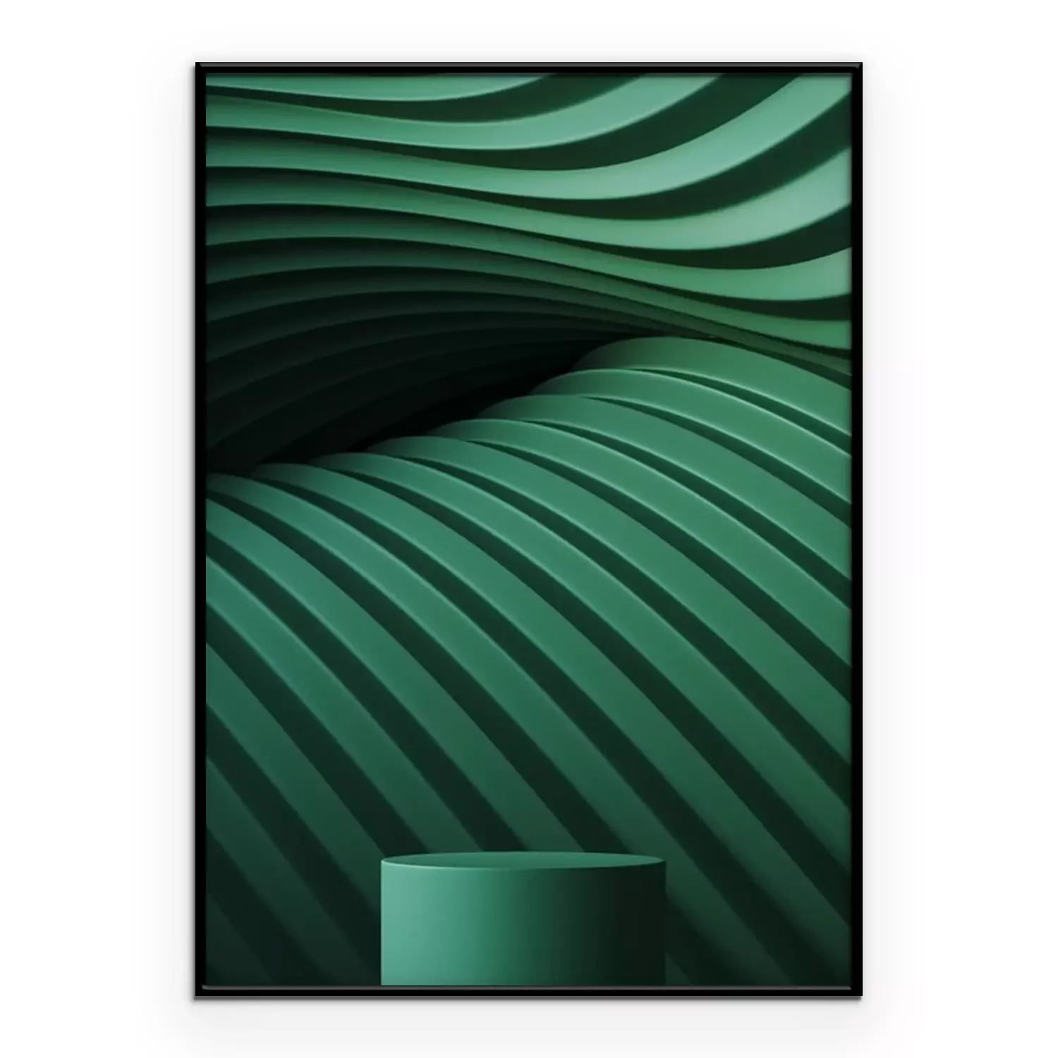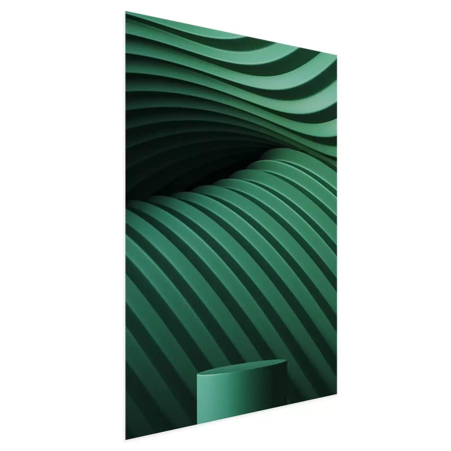 Poster : Abstract background for branding and minimal presentation. Green podium on folding paper pleated geometric background. 3d rendering illustration.
