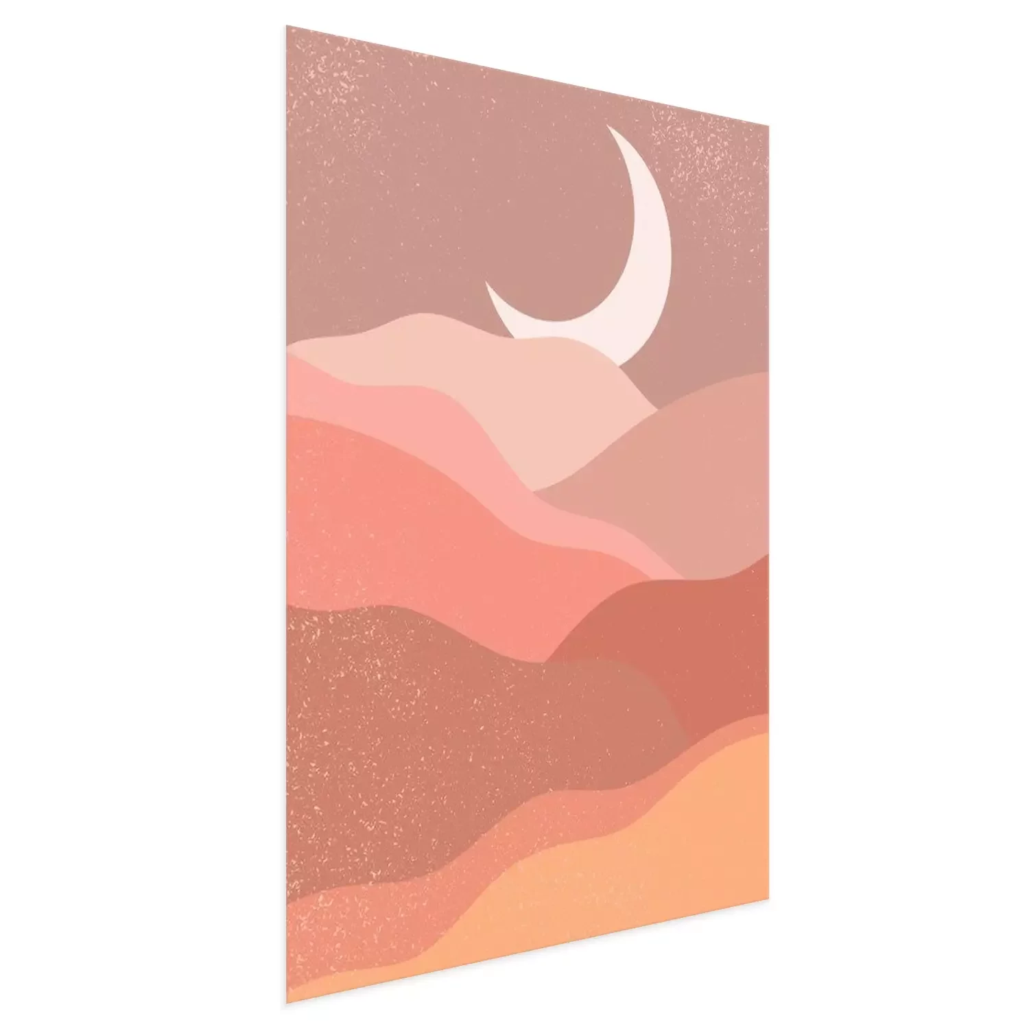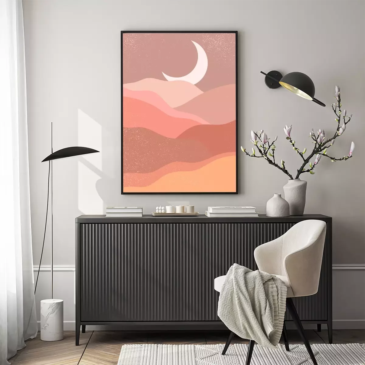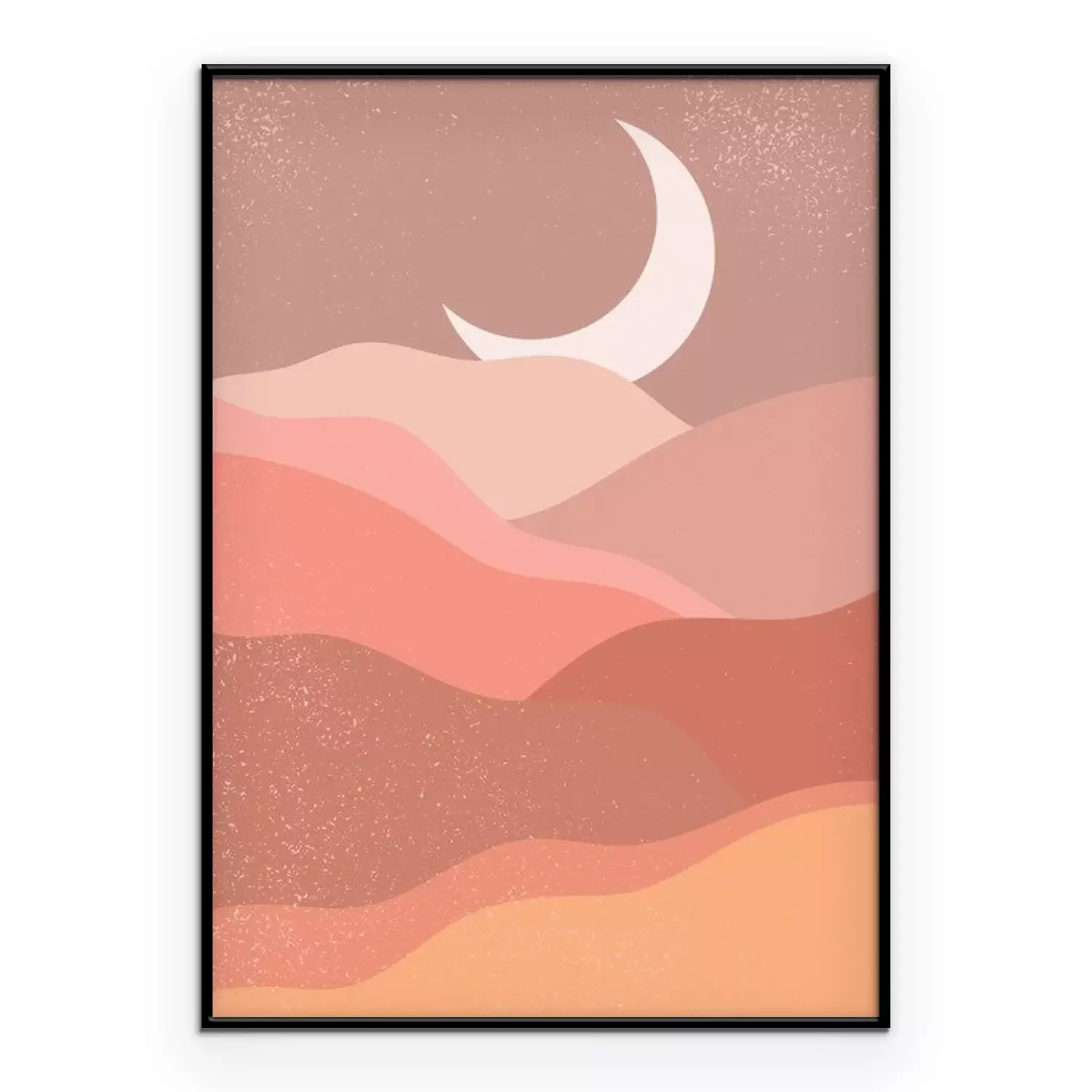 Poster  Abstract contemporary aesthetic background with landscape, desert, mountain, Moon. Earth tones, burnt orange, terracotta colors. Boho wall decor. Mid century modern minimalist art print. Organic shape