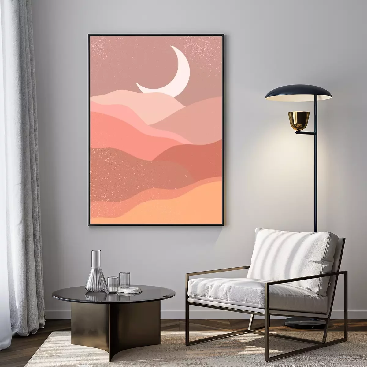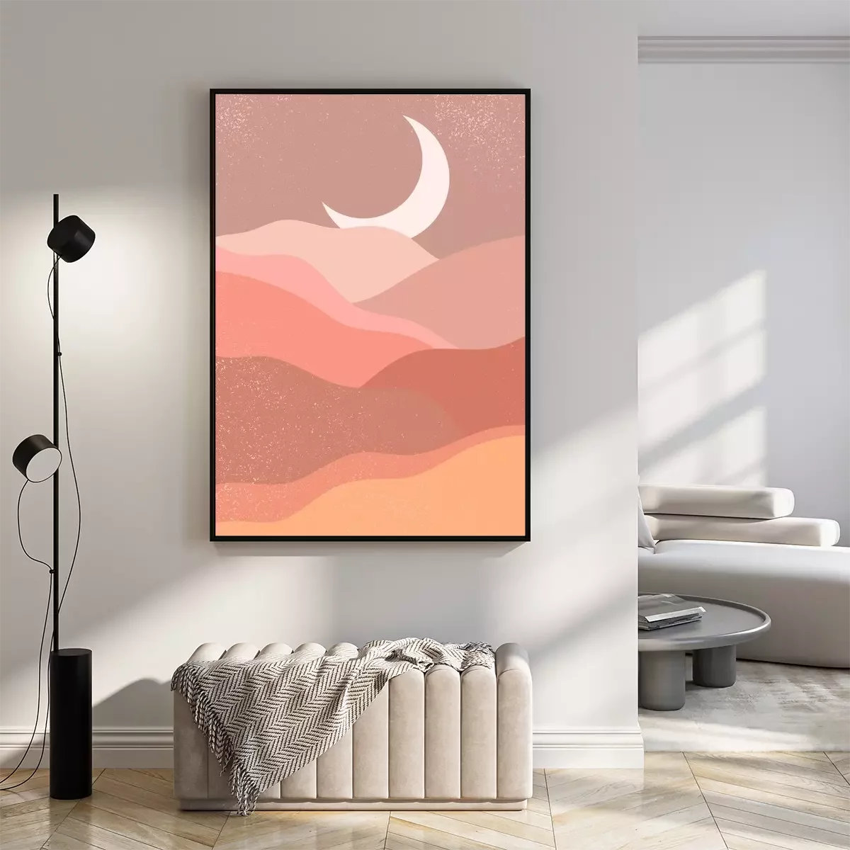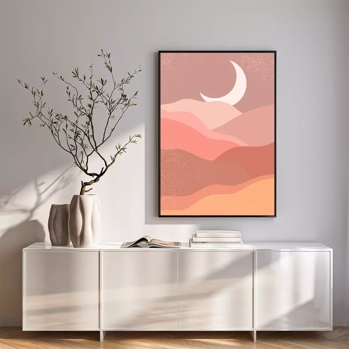 Poster  Abstract contemporary aesthetic background with landscape, desert, mountain, Moon. Earth tones, burnt orange, terracotta colors. Boho wall decor. Mid century modern minimalist art print. Organic shape