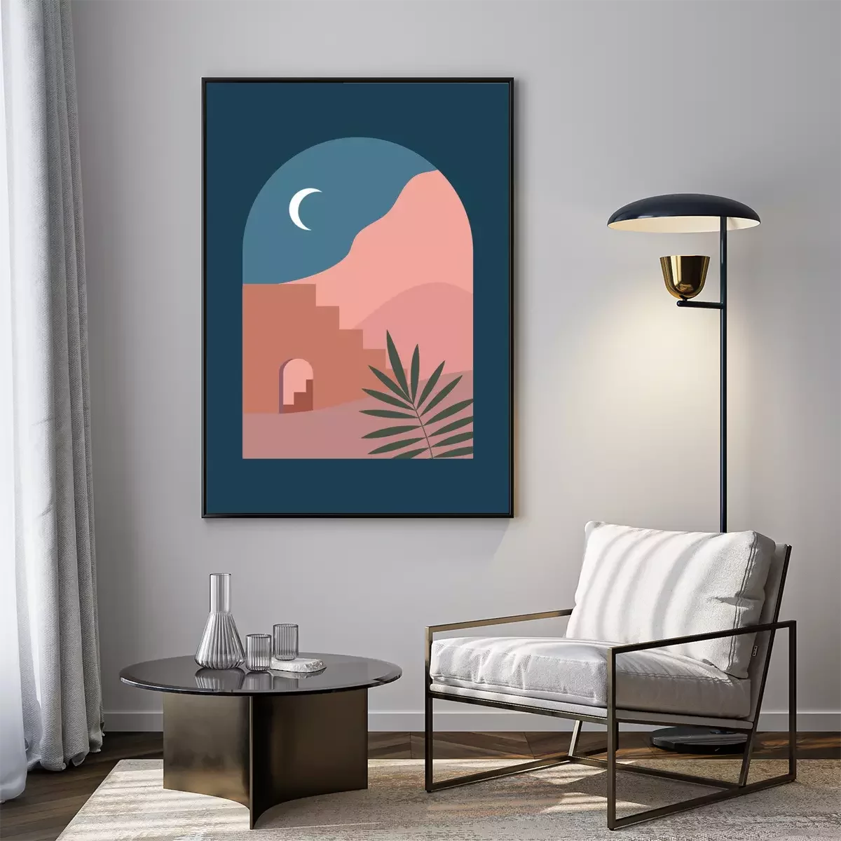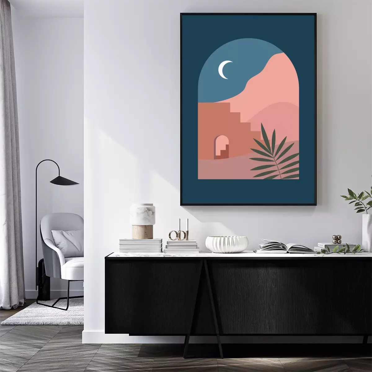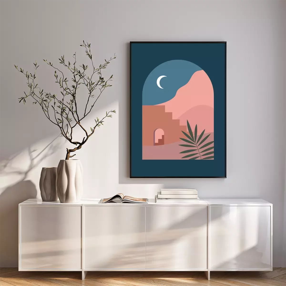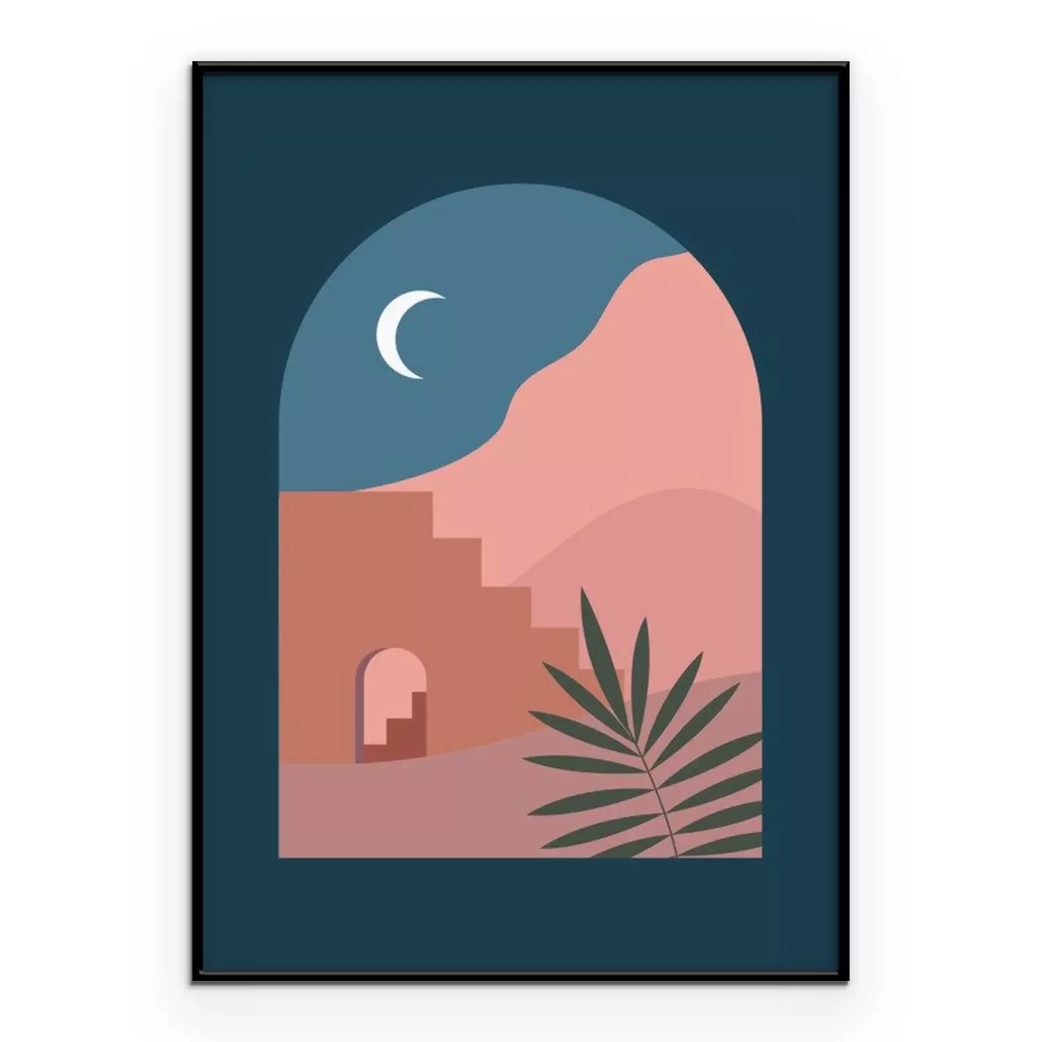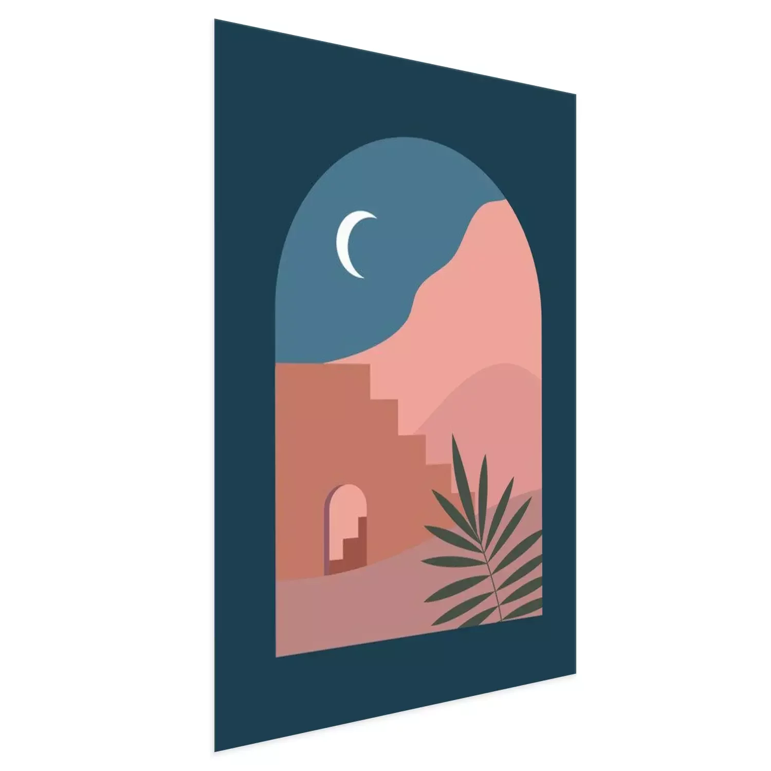 Poster : Abstract contemporary aesthetic background with night landscape, stairs, palm, vases, Moon. Earth tones, muted, terracotta colors. Boho wall decor. Mid century modern minimalist art print.