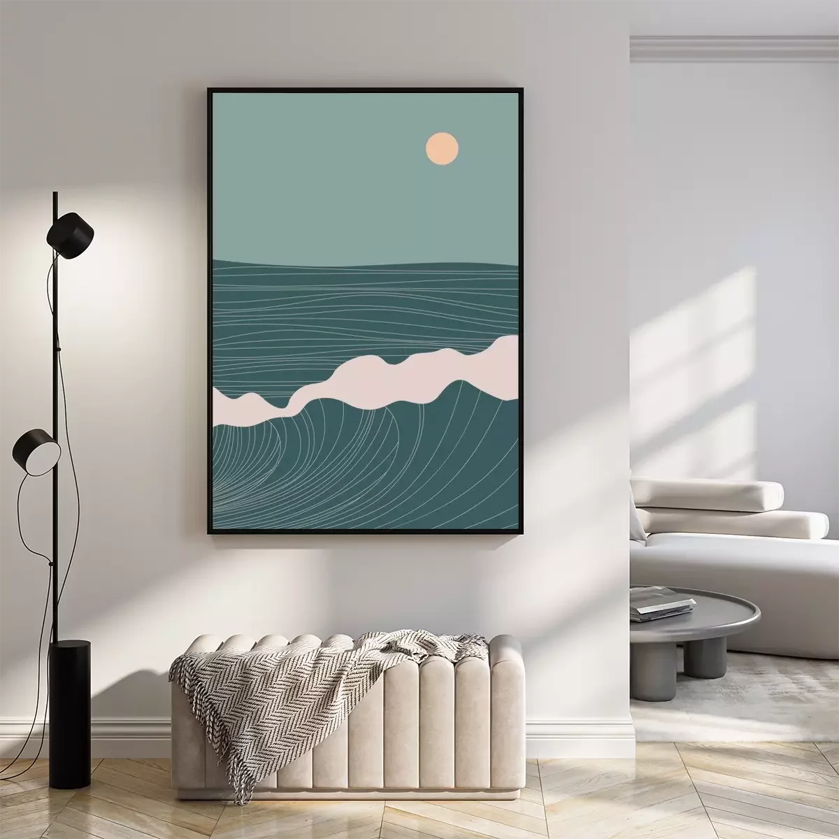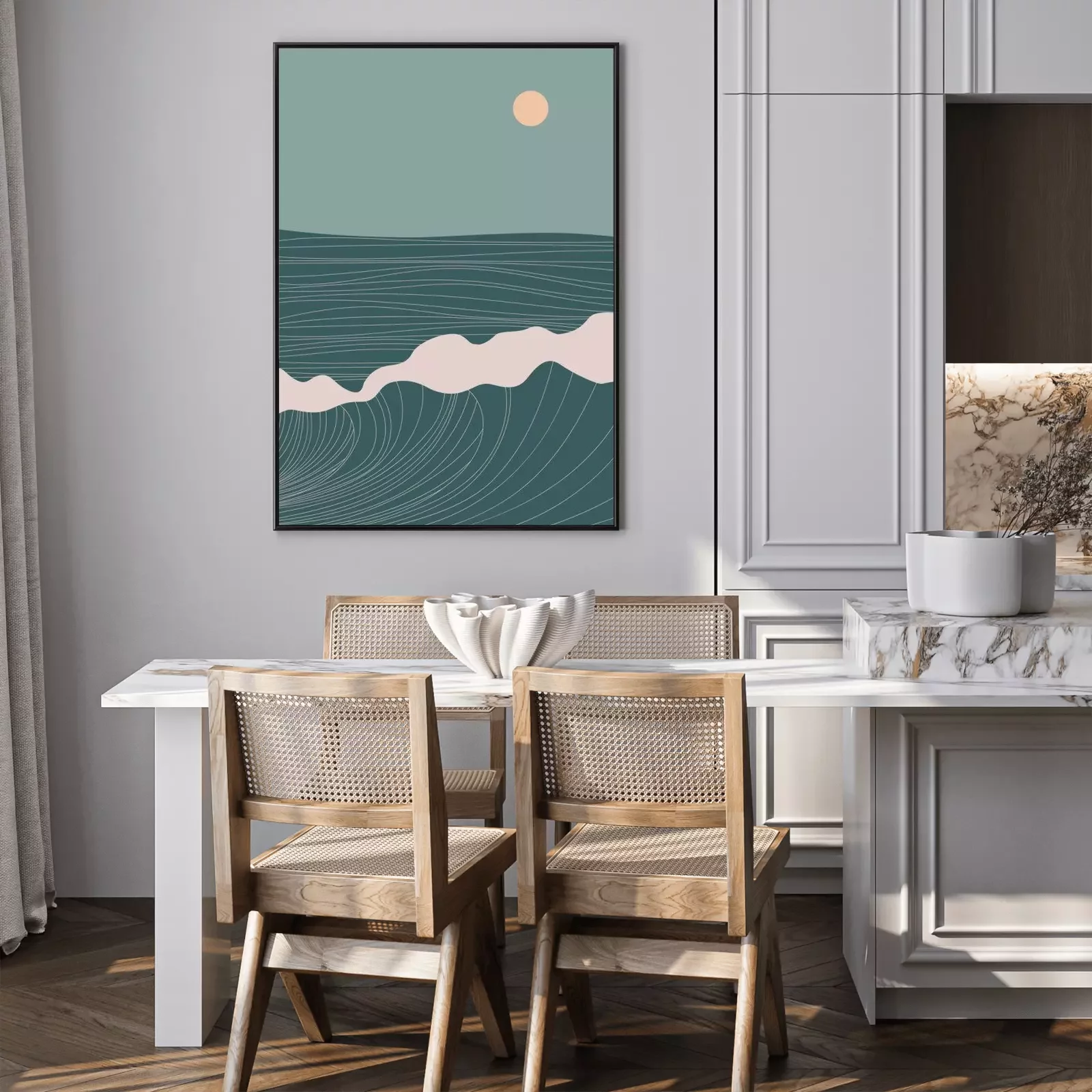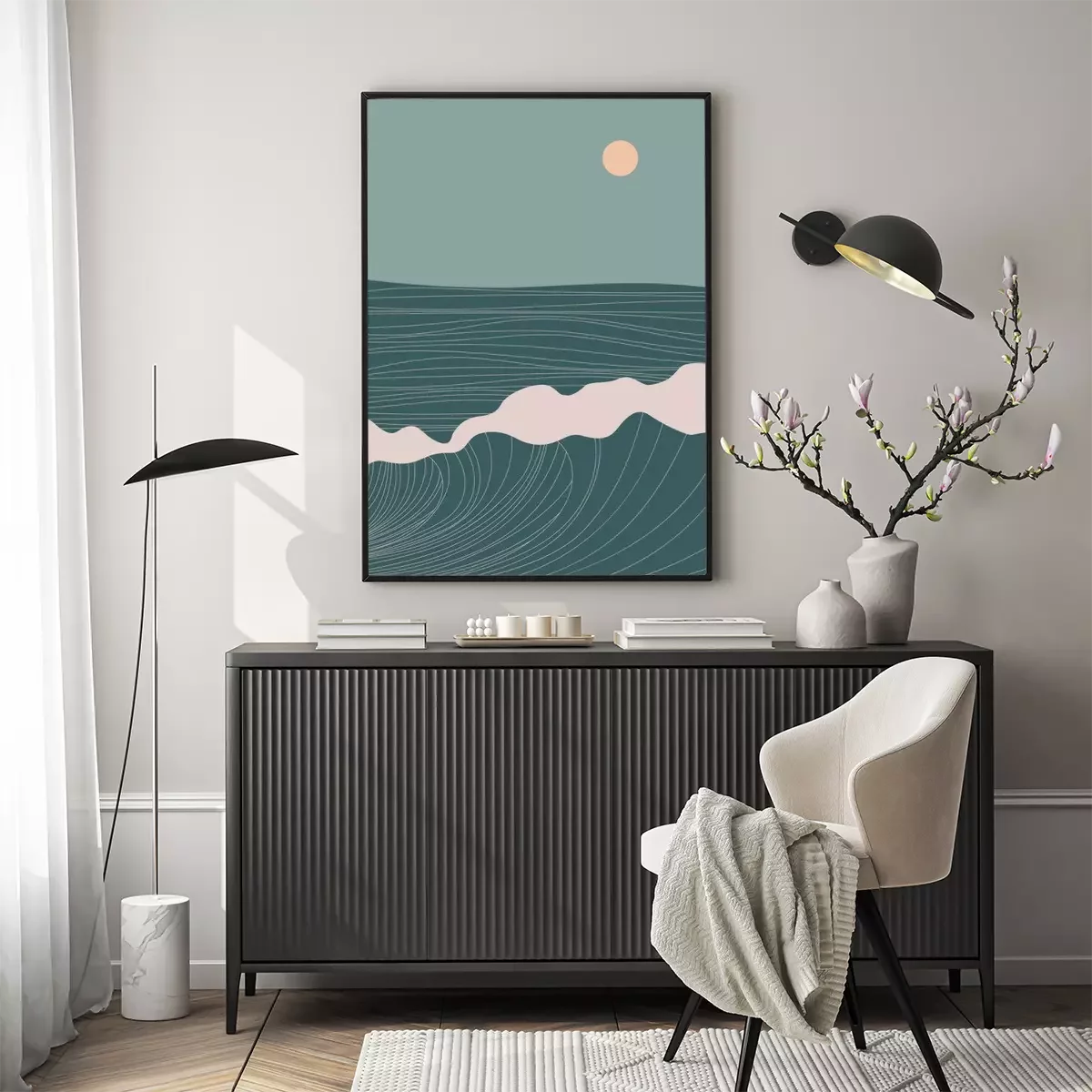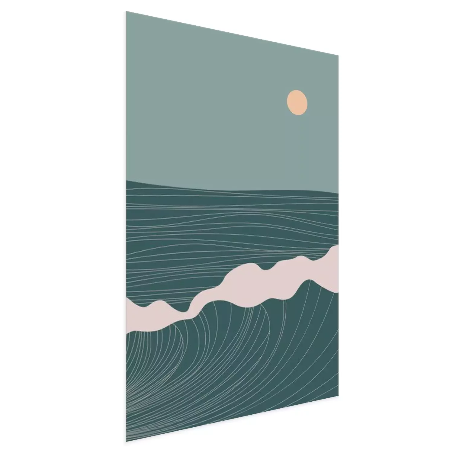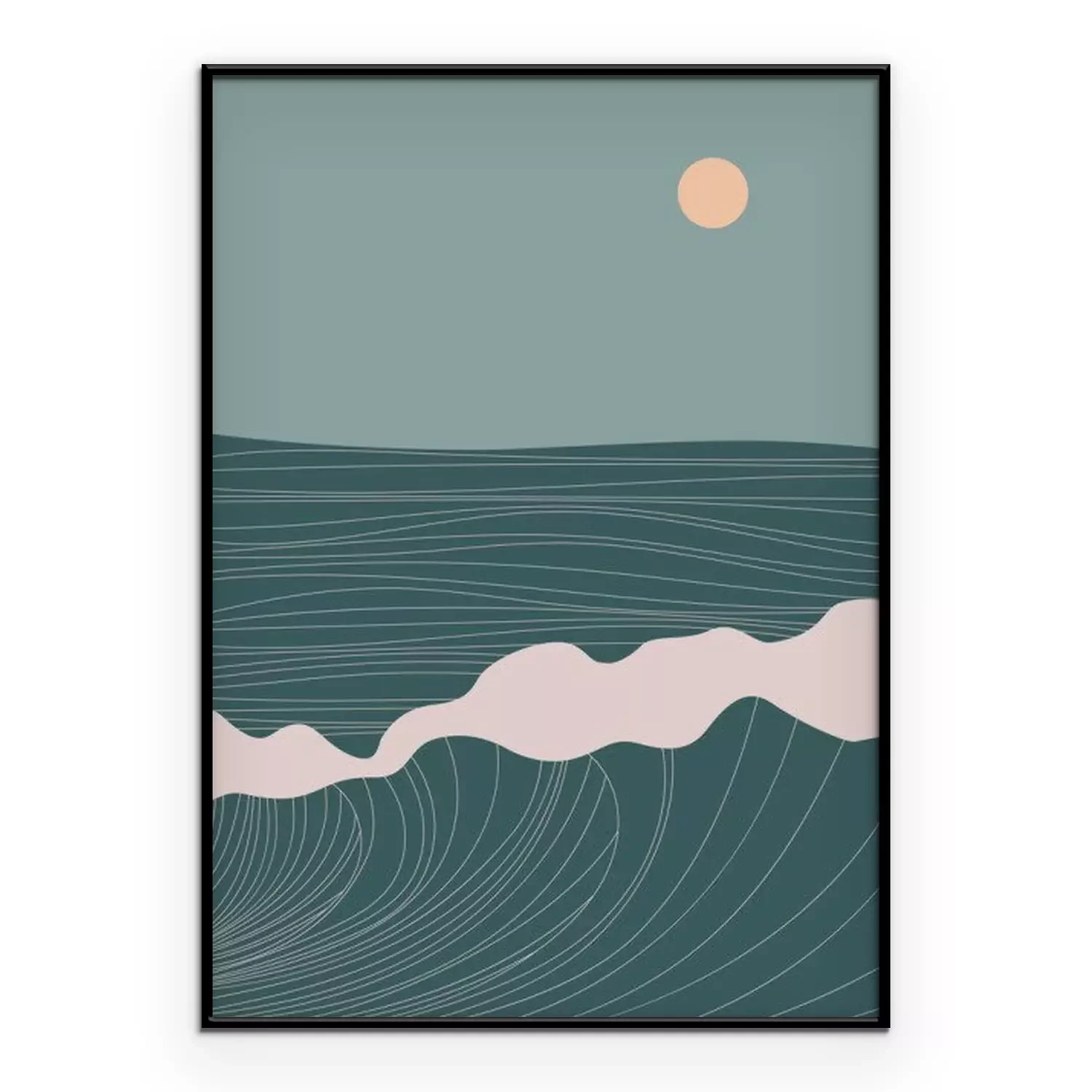 Poster : Abstract contemporary aesthetic landscape with Sun, Sea, wave, mountains. Mid century modern minimalist line art print. Background in retro asian japanese style. Vector illustrations