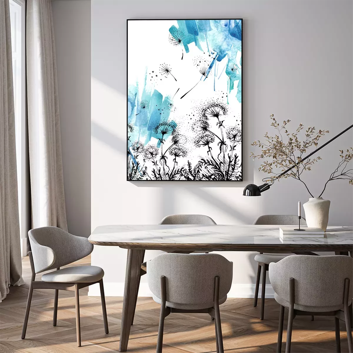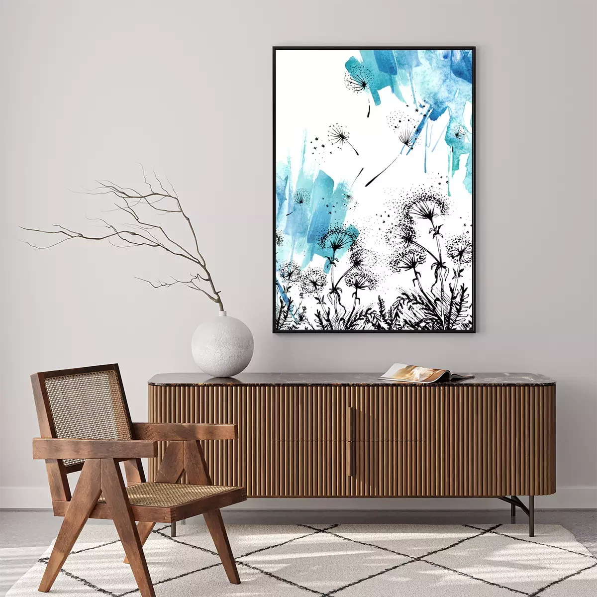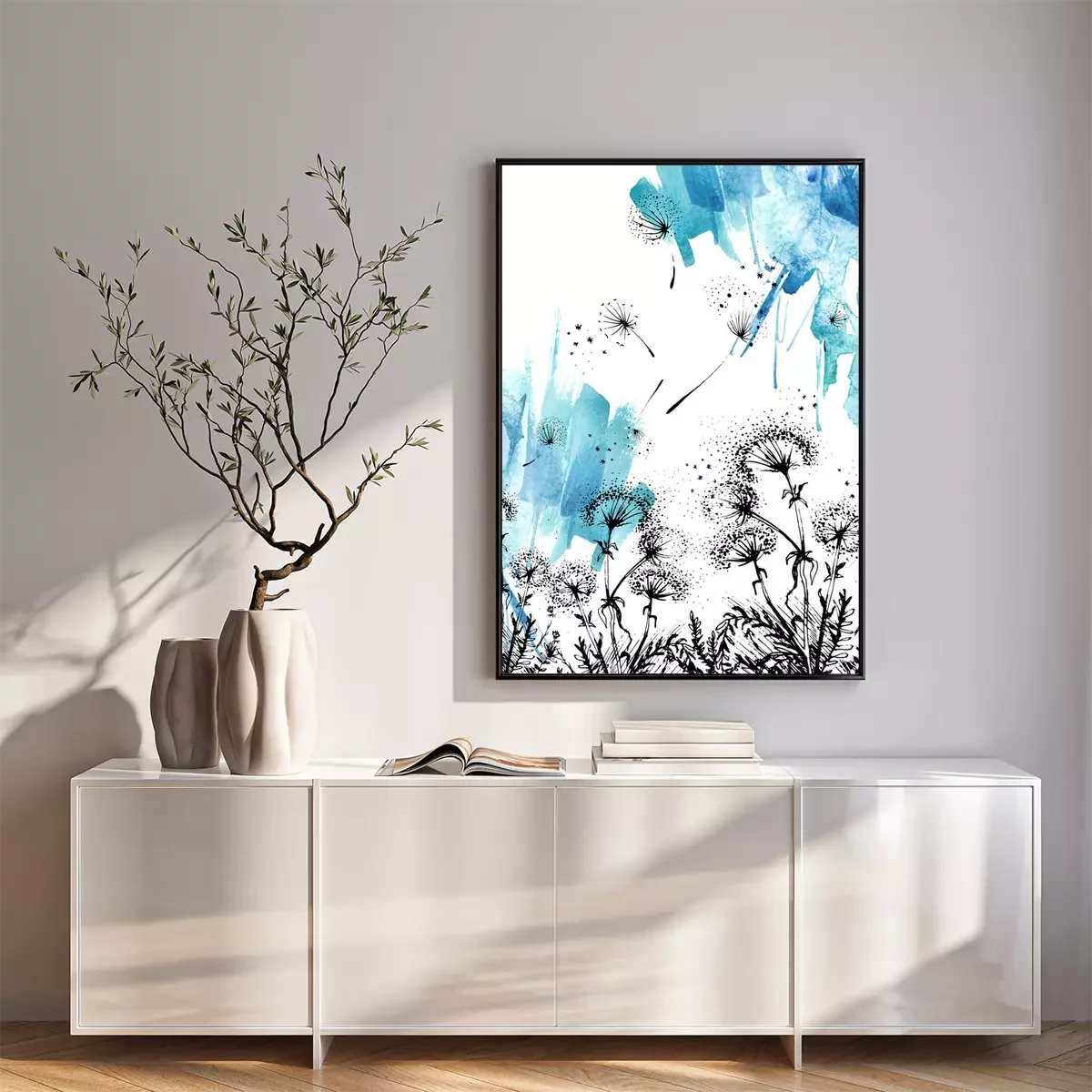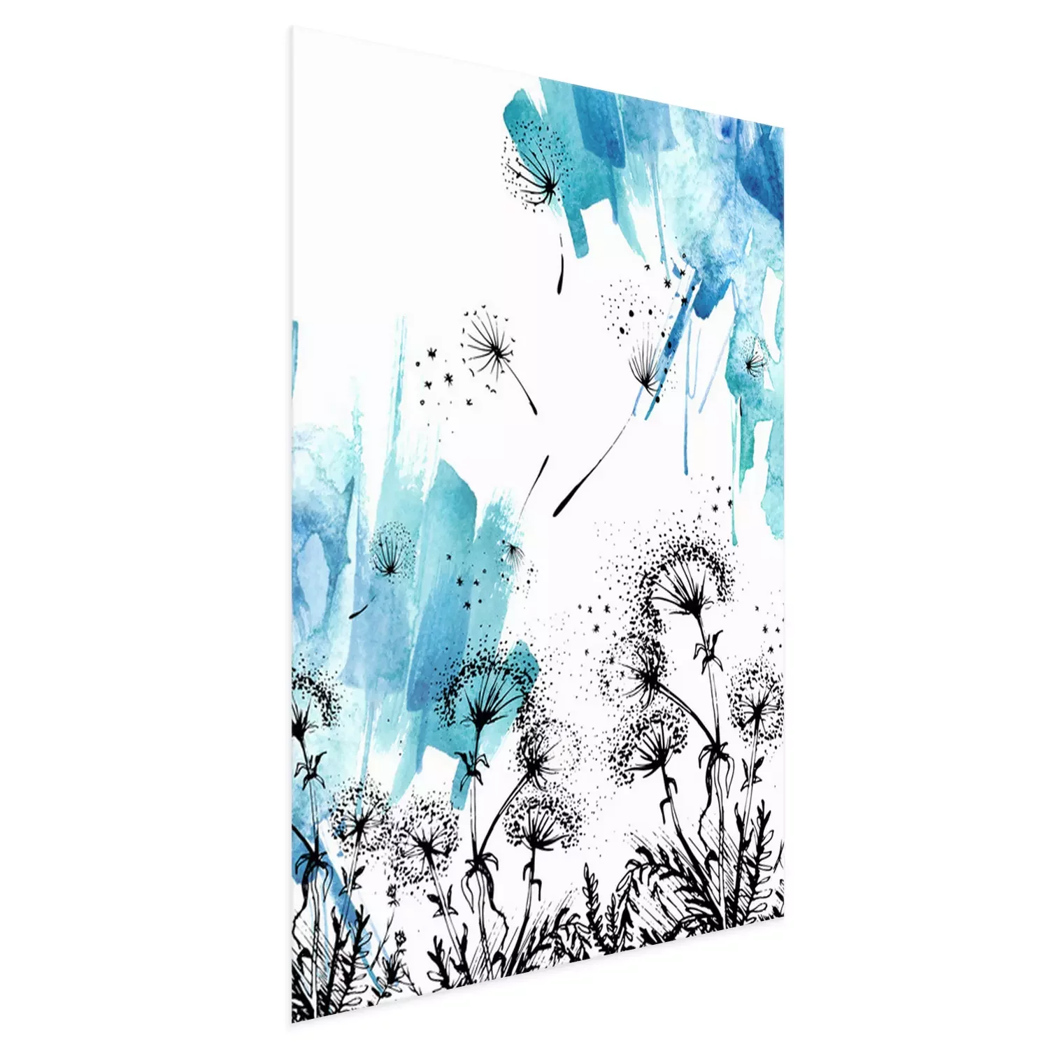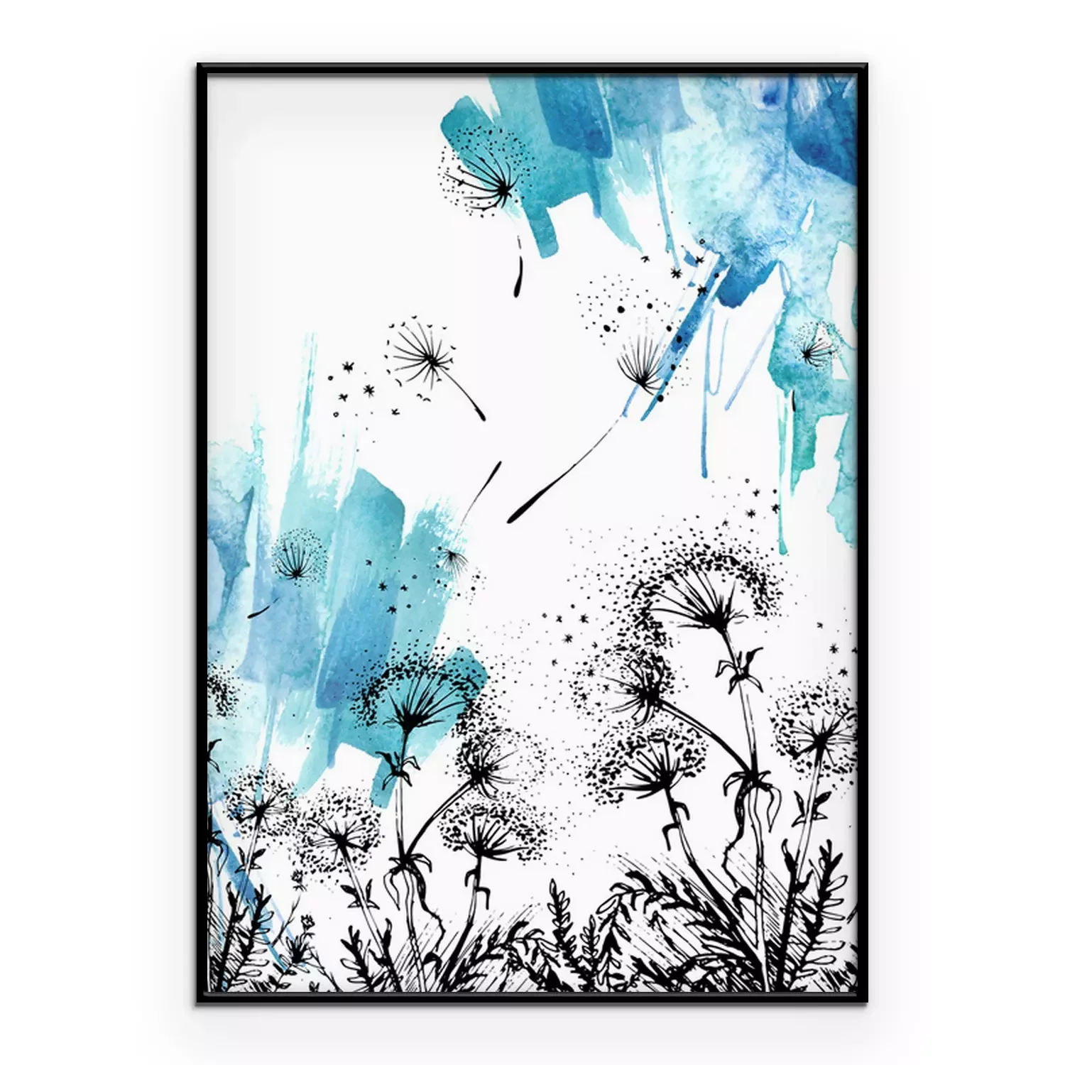 Poster  Abstract Dandelions dandelion with flying seeds. Wild flower, petals, leaves, grass. On an isolated white background. Summer, spring landaft. Seeds, pollen, allergies. Garden plants.