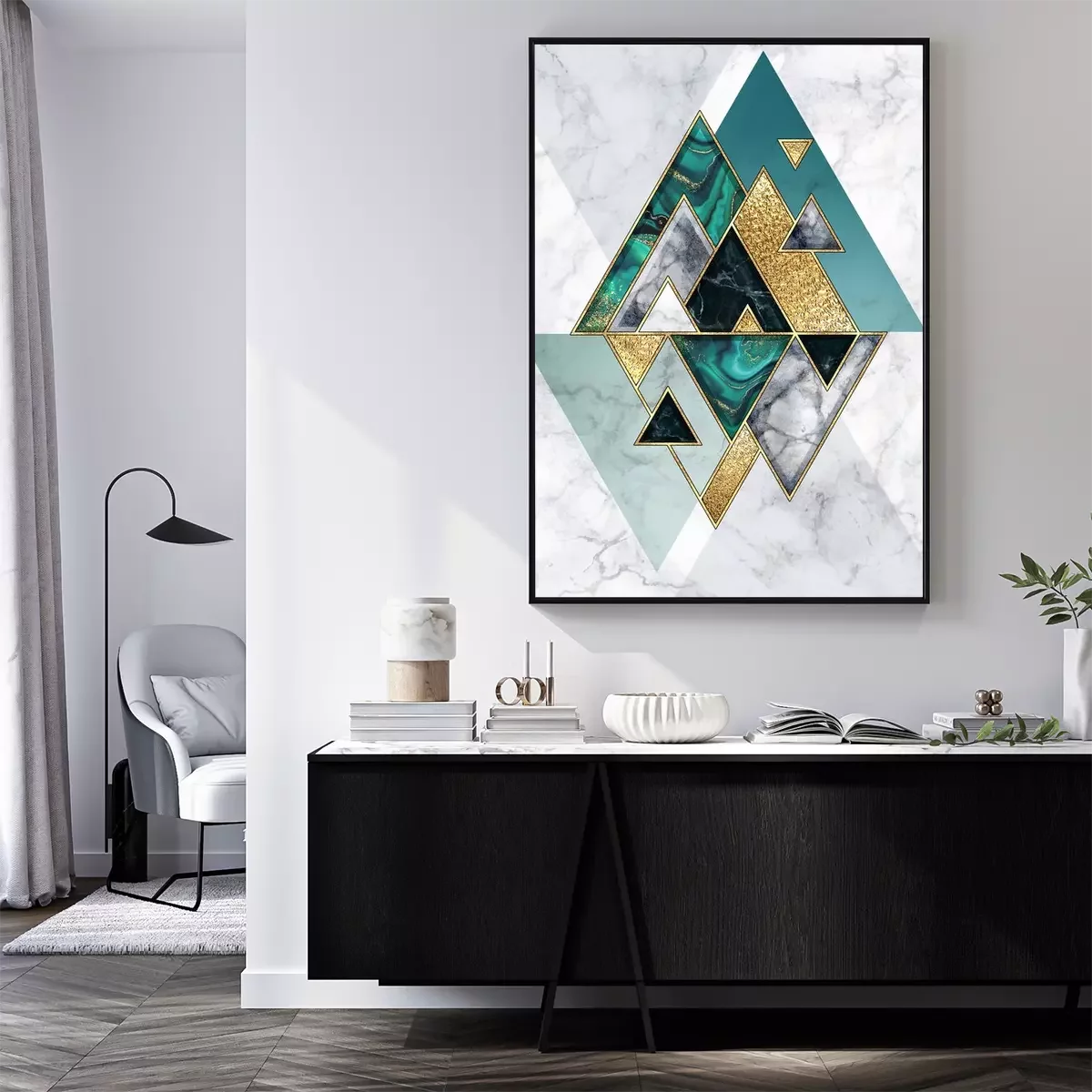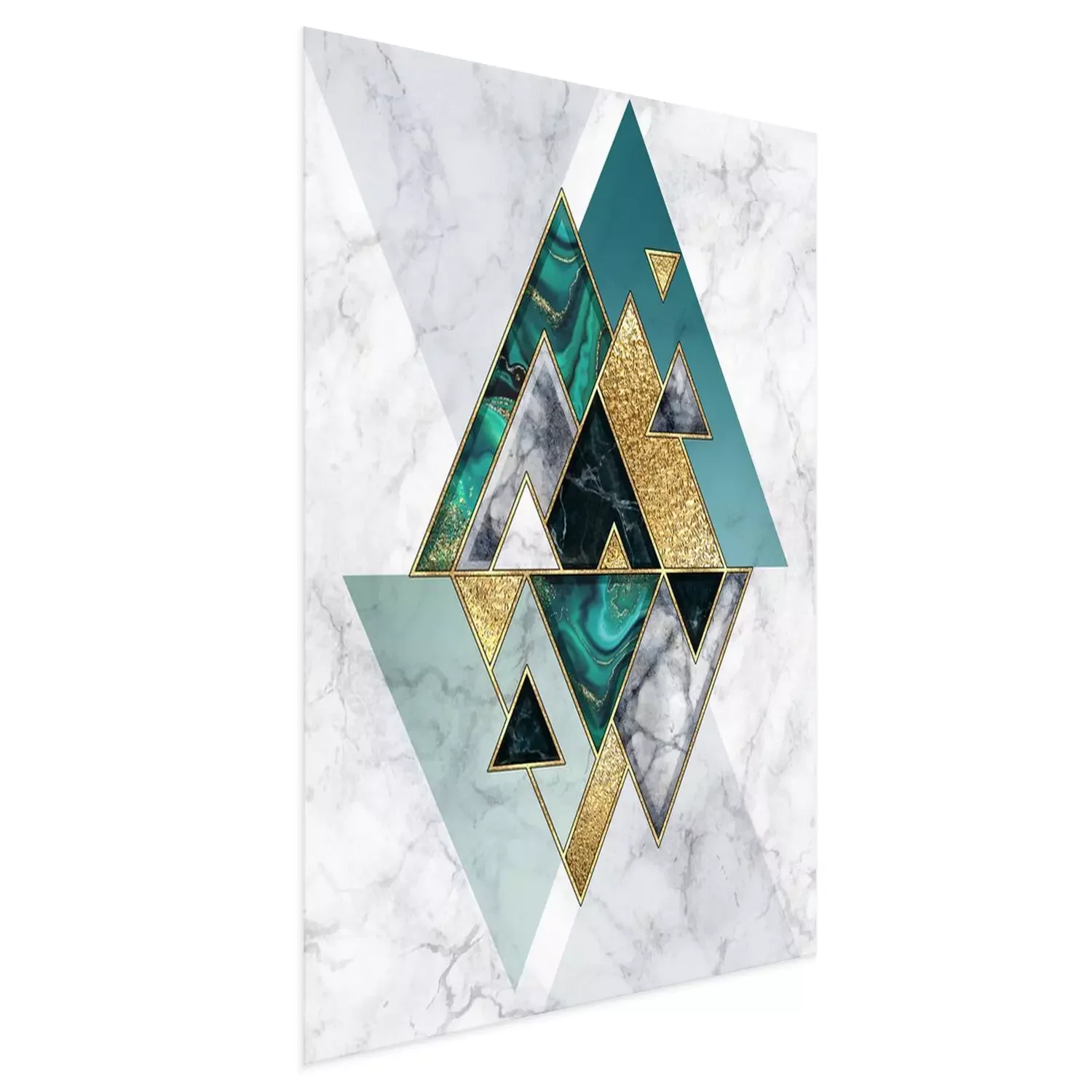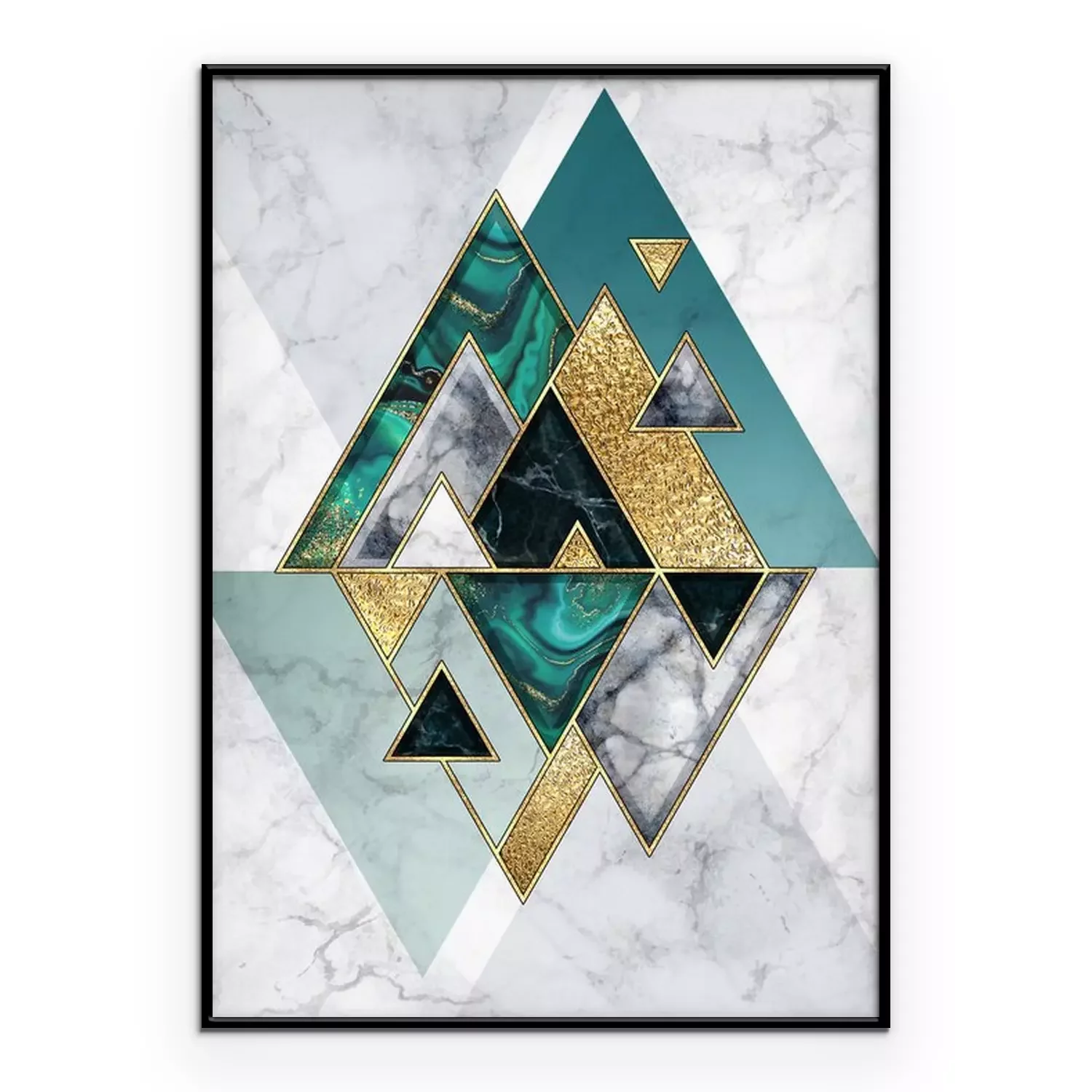 Poster : abstract geometric background, modern marble mosaic inlay, malachite green triangles, black white stone textures, golden foil. Fashion marbling illustration, art deco wallpaper