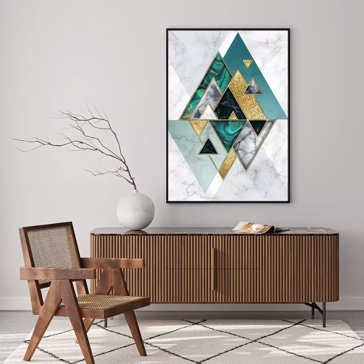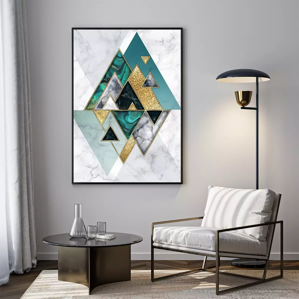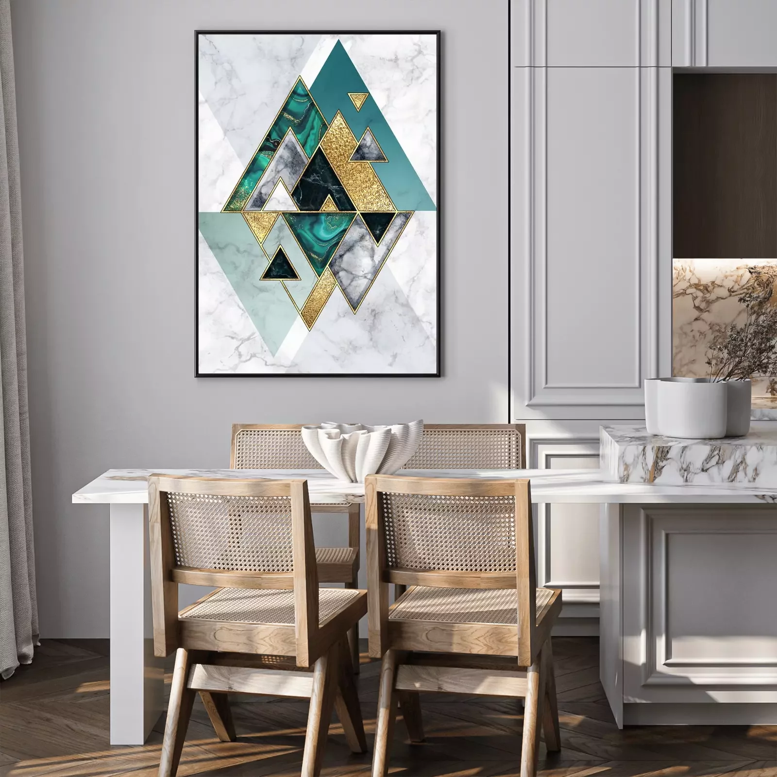 Poster : abstract geometric background, modern marble mosaic inlay, malachite green triangles, black white stone textures, golden foil. Fashion marbling illustration, art deco wallpaper