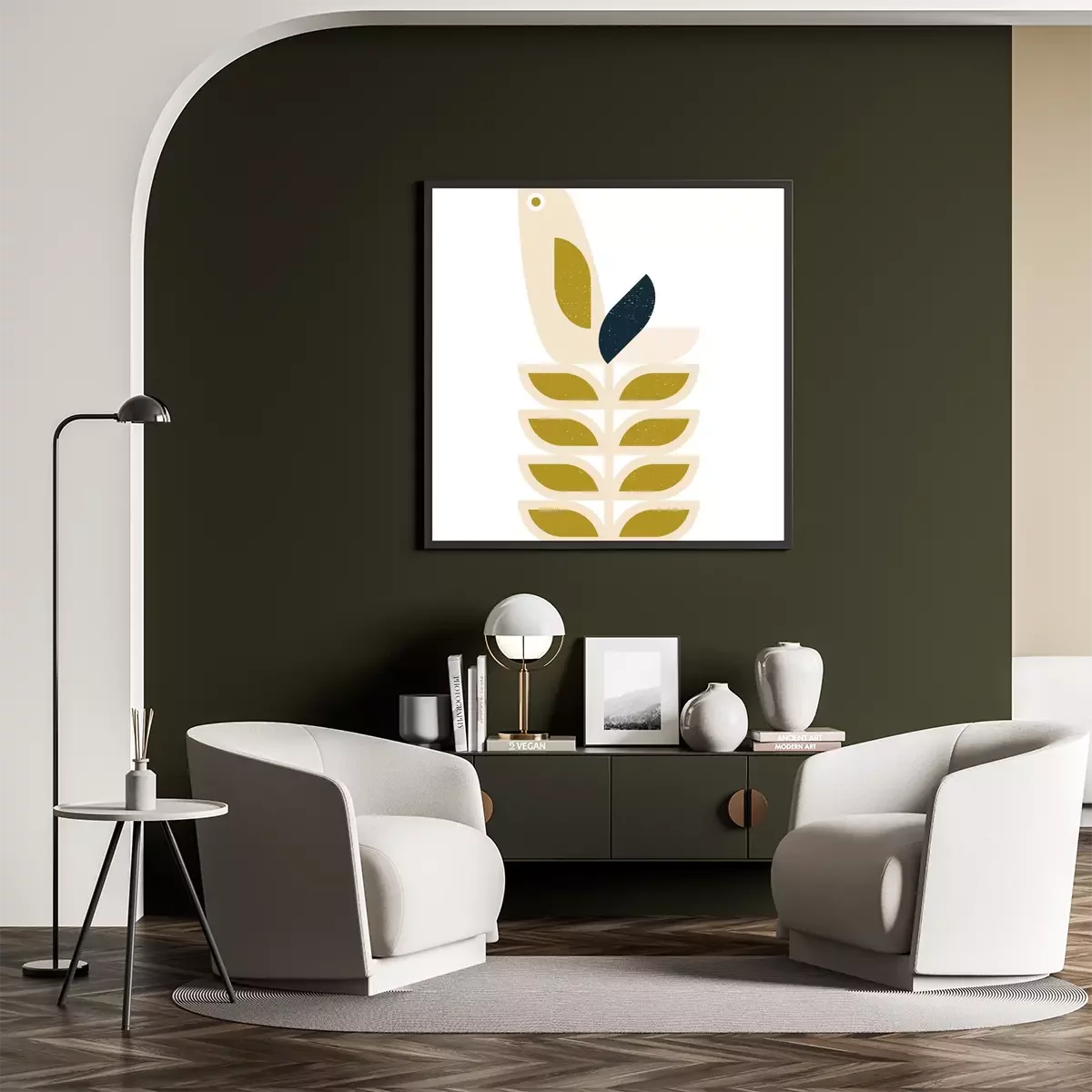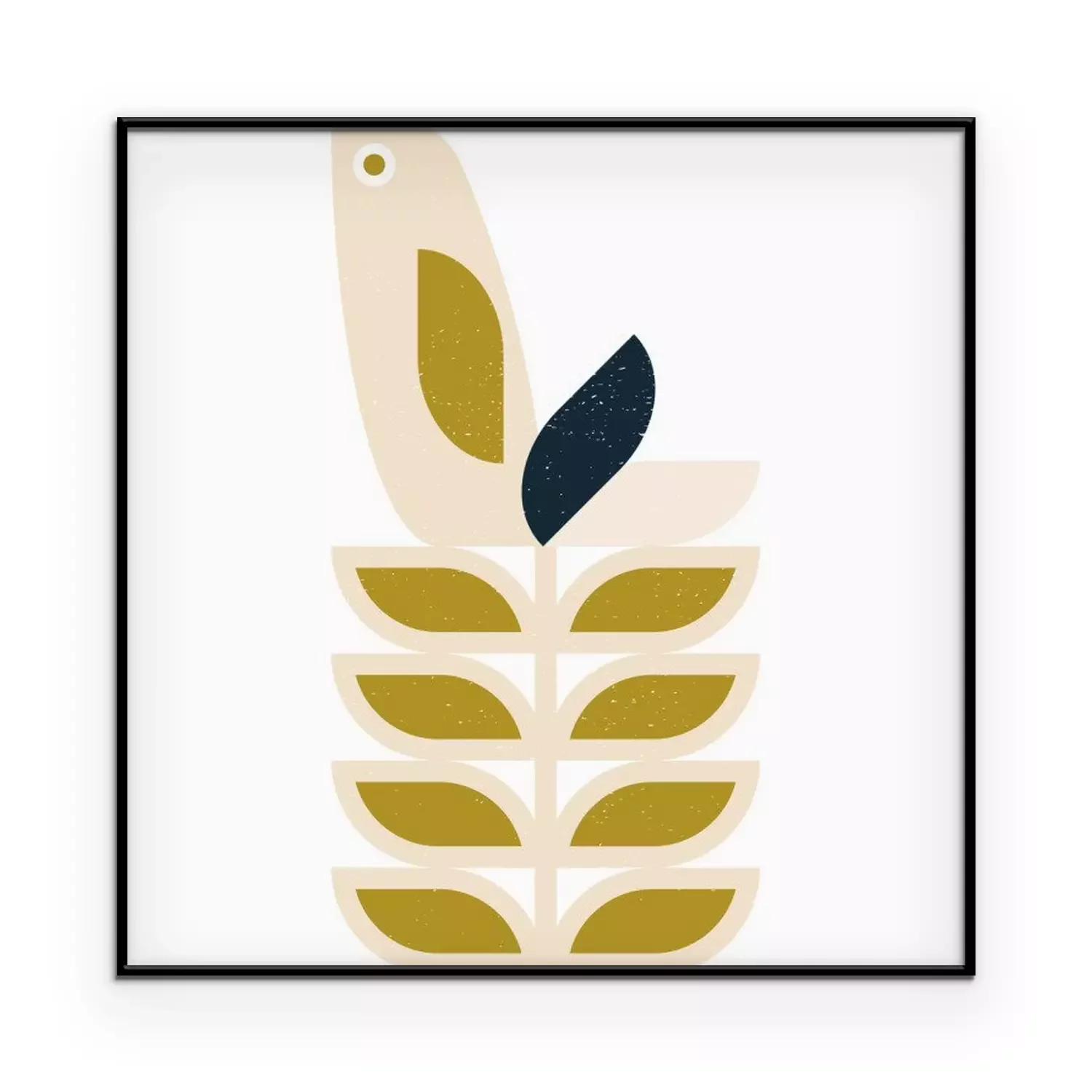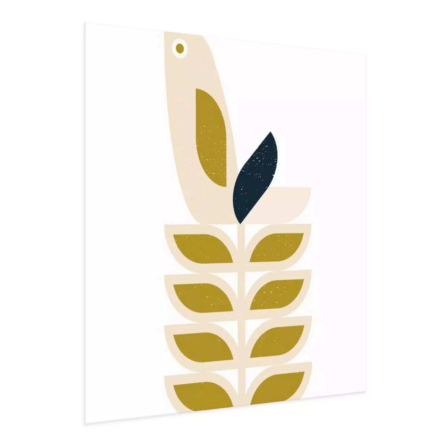 Poster  Abstract geometric retro inspired vector seamless pattern.Stylized bird, leaves and flowers in pastel colors. Simple background in traditional decorative folk art scandinavian style.Isolated texture