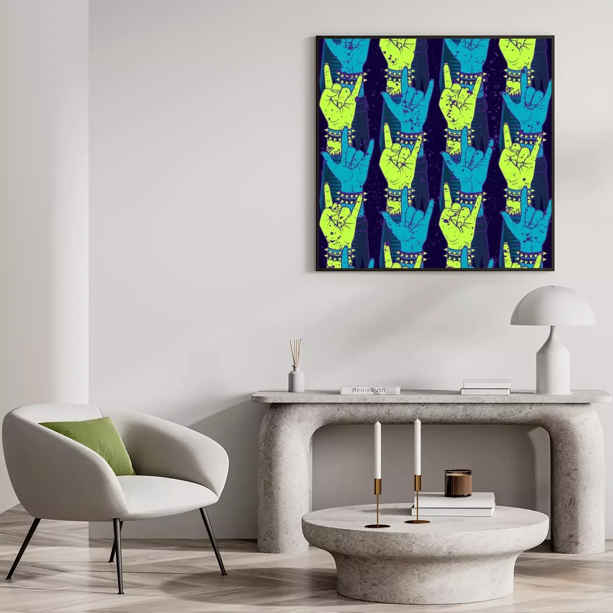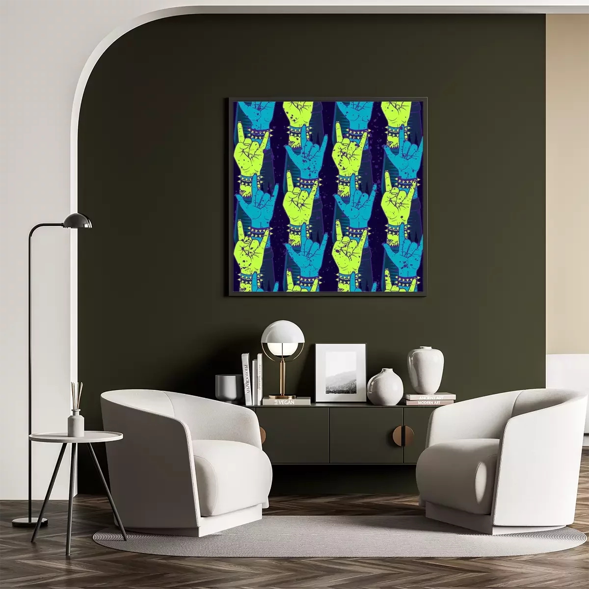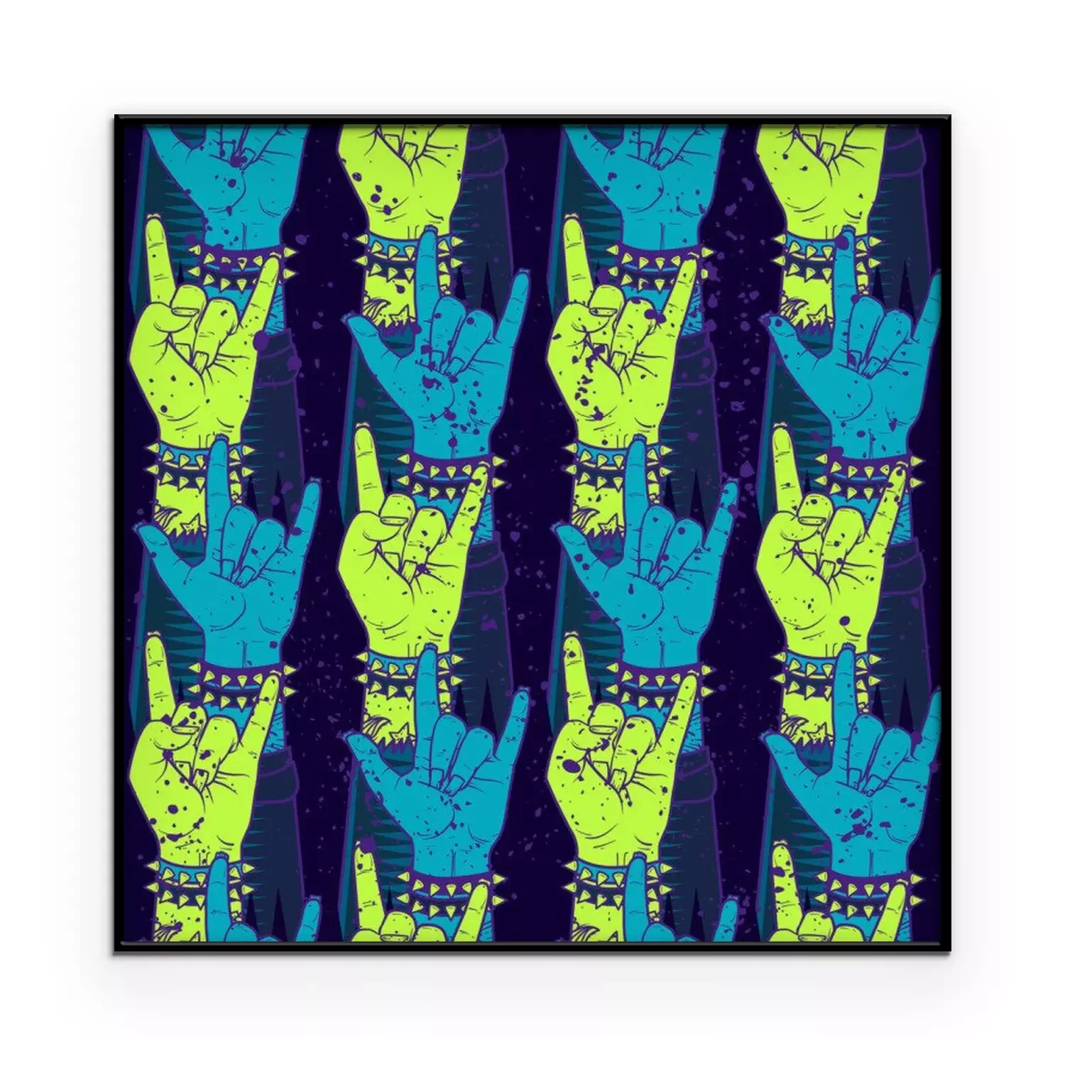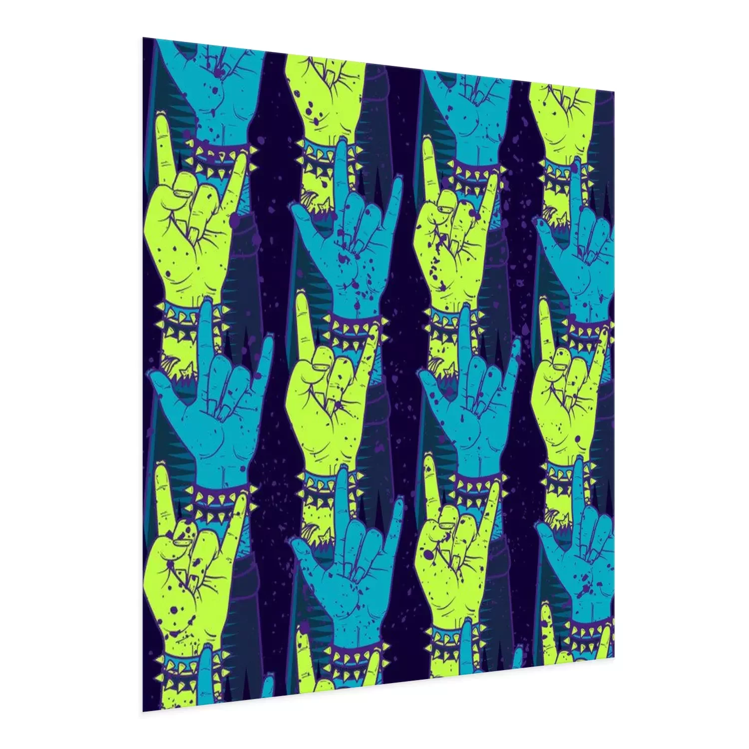 Poster  Abstract seamless vector pattern for girls, boys, clothes. Creative background with hand symbol of rock music ,Funny wallpaper for textile and fabric. Fashion style. Colorful bright