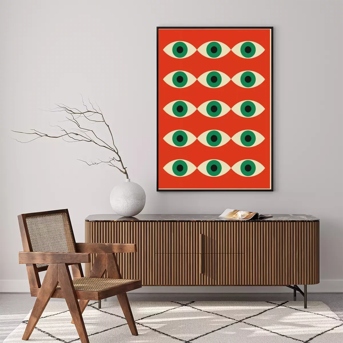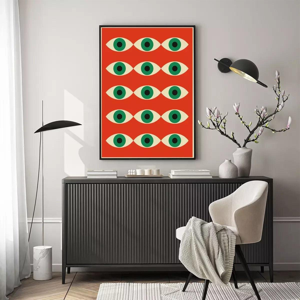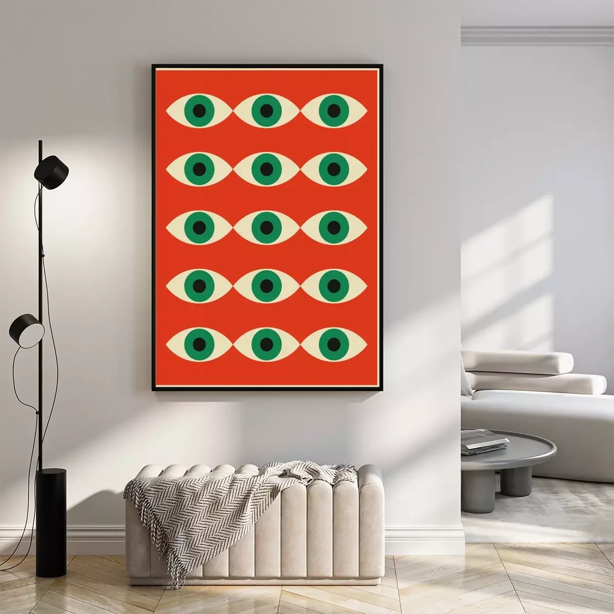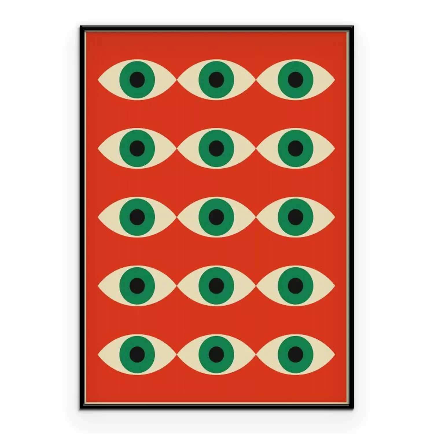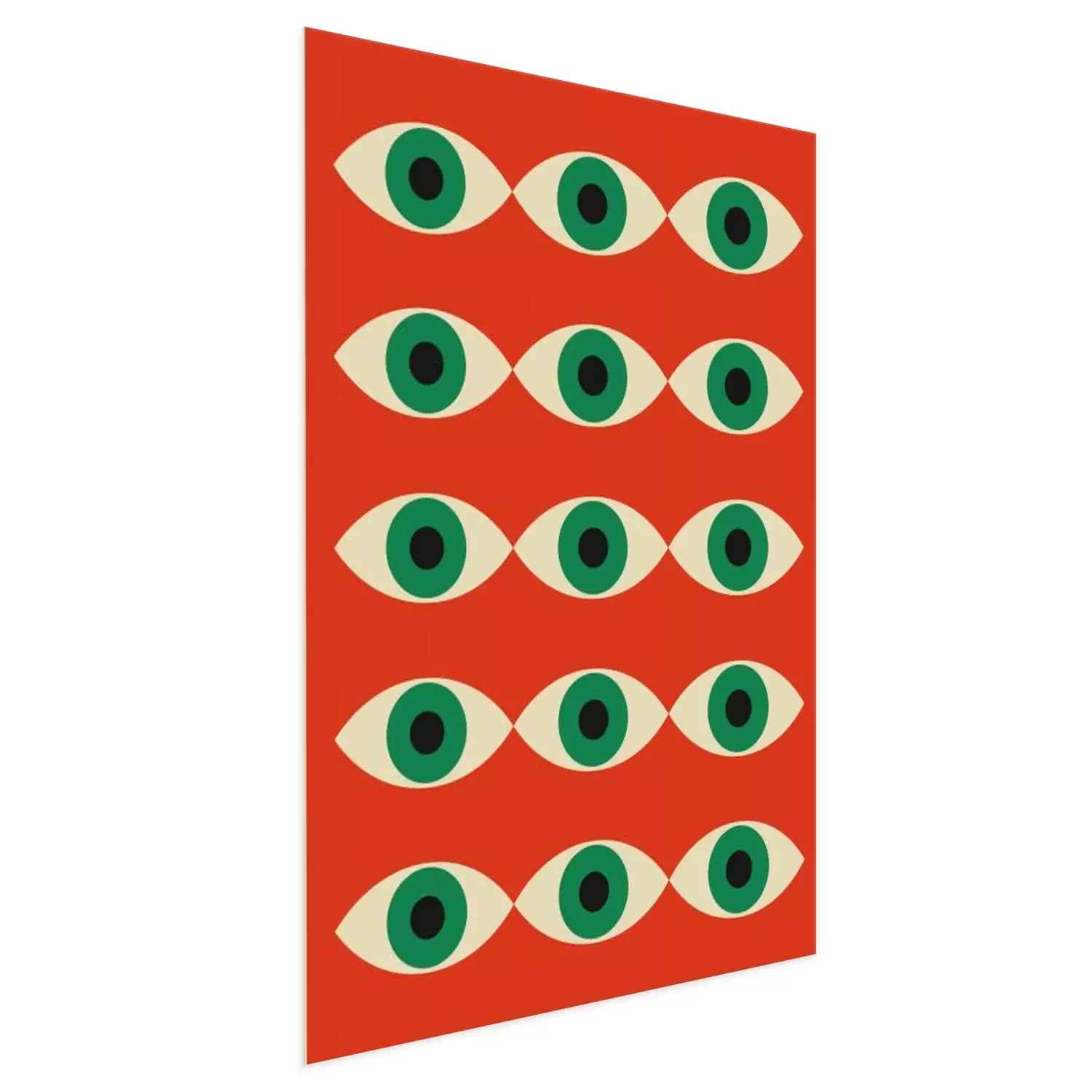 Abstraction inspirée du bauhaus avec un œil vert sur fond rouge