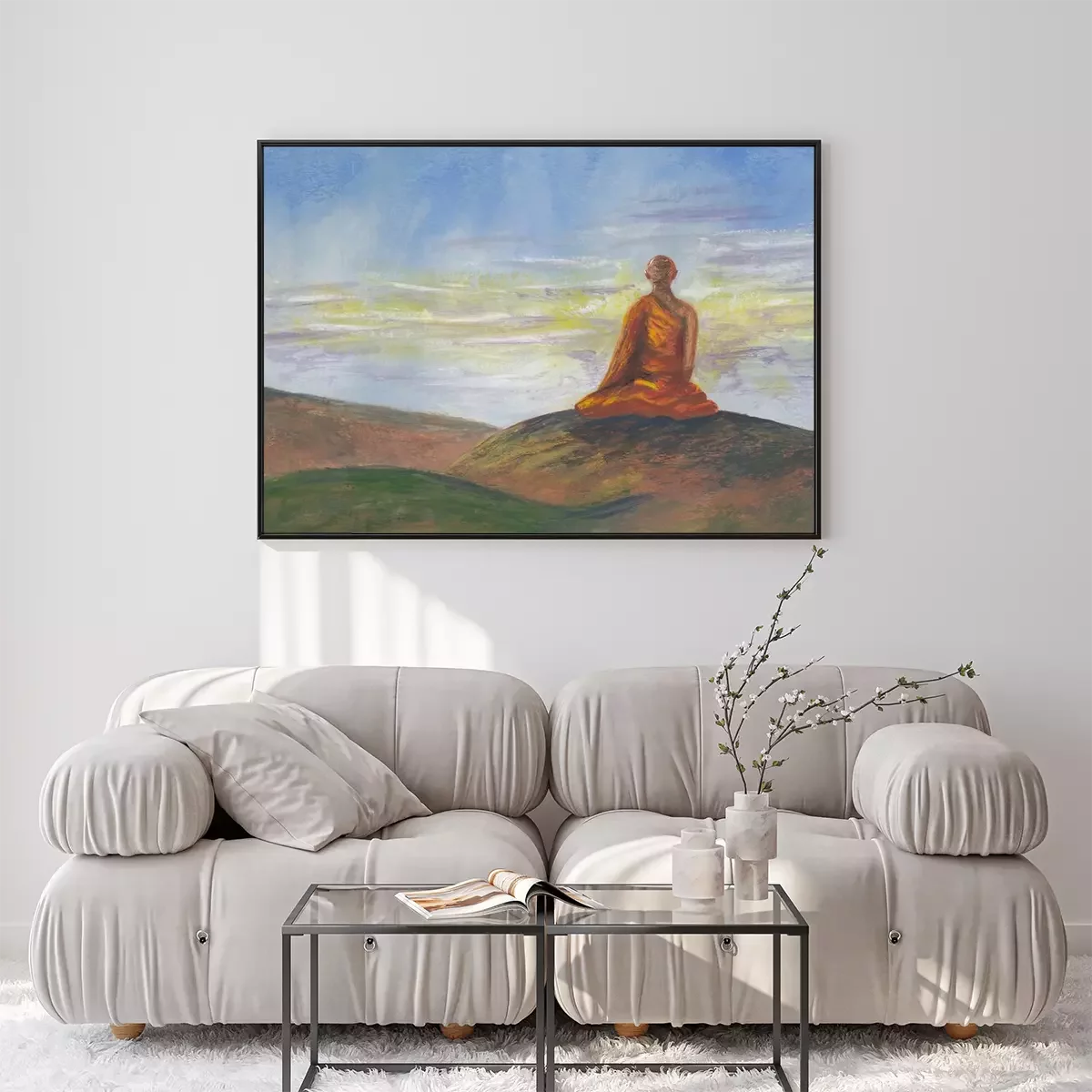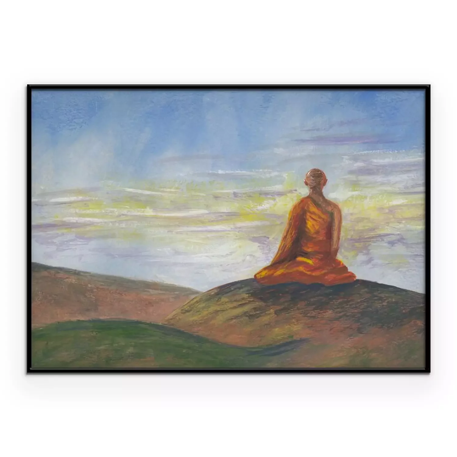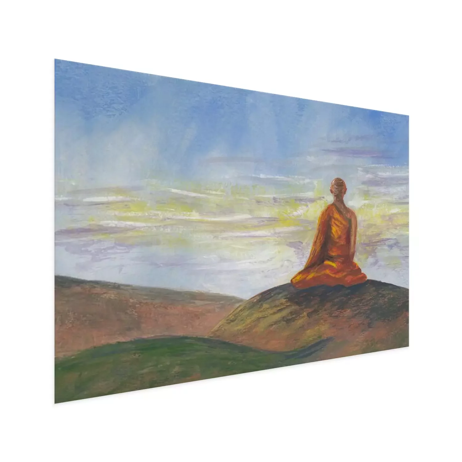 Poster : Acrylics painting of asian mountains, blue sunrise sky & meditating Buddhist monk in orange robe. Hand drawn oriental style landscape with layers of rocks. Concept for restore, meditation background.