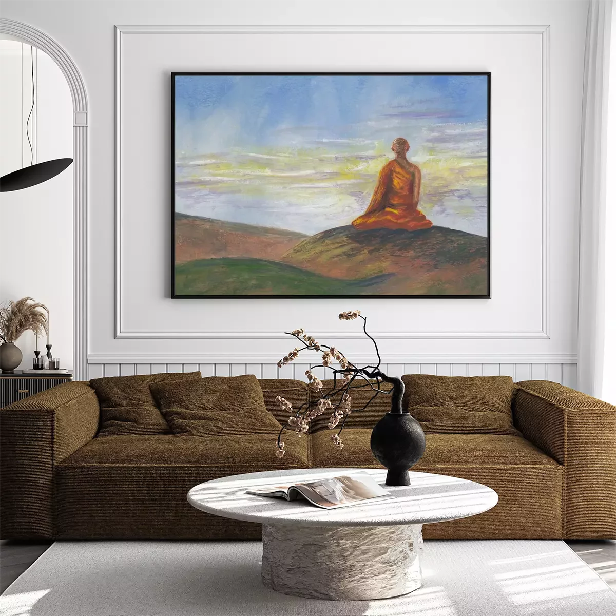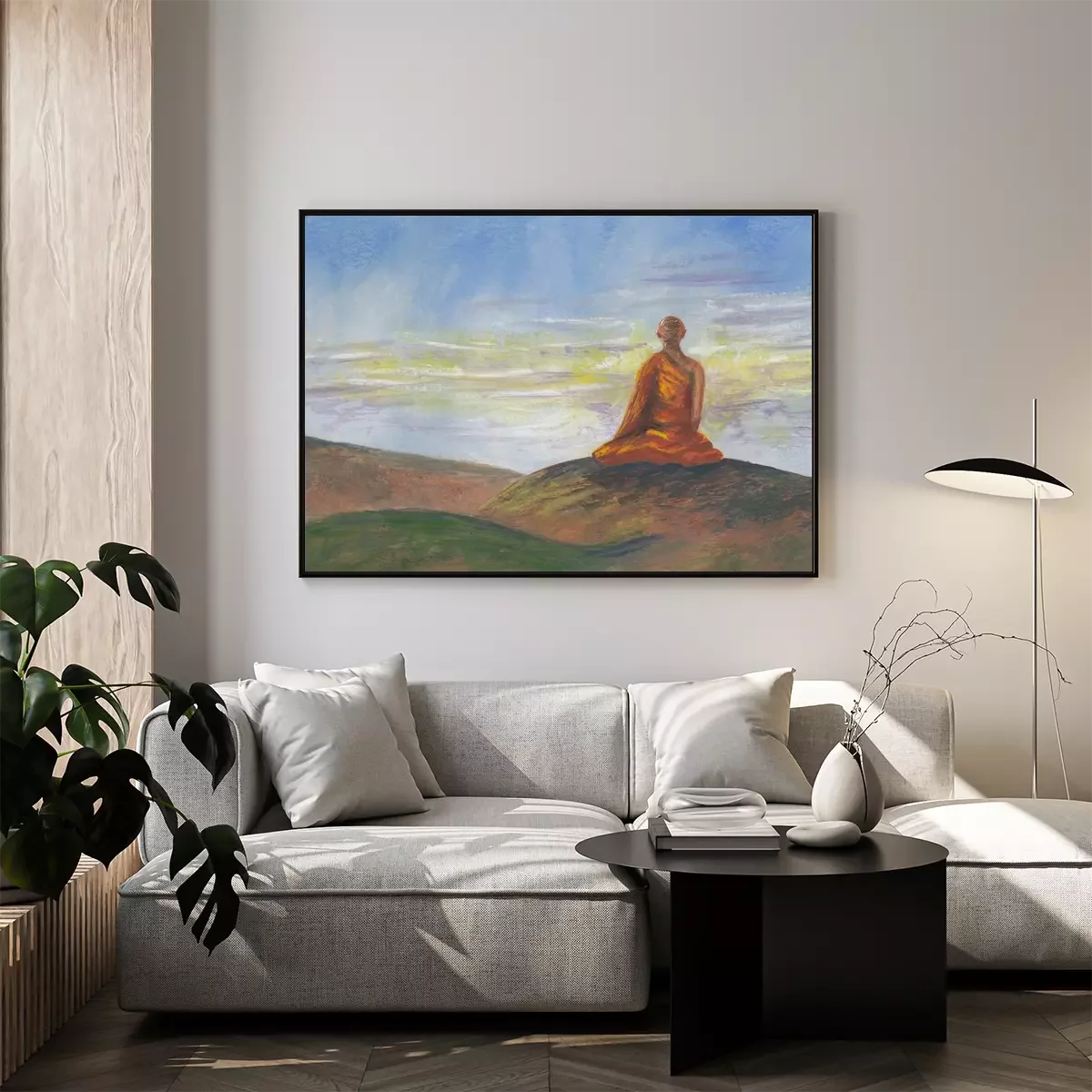 Acrylics painting of asian mountains & meditating Buddhist monk in orange robe. Hand drawn oriental style landscape with layers of rocks. Concept for decoration, relax, restore, meditation background.