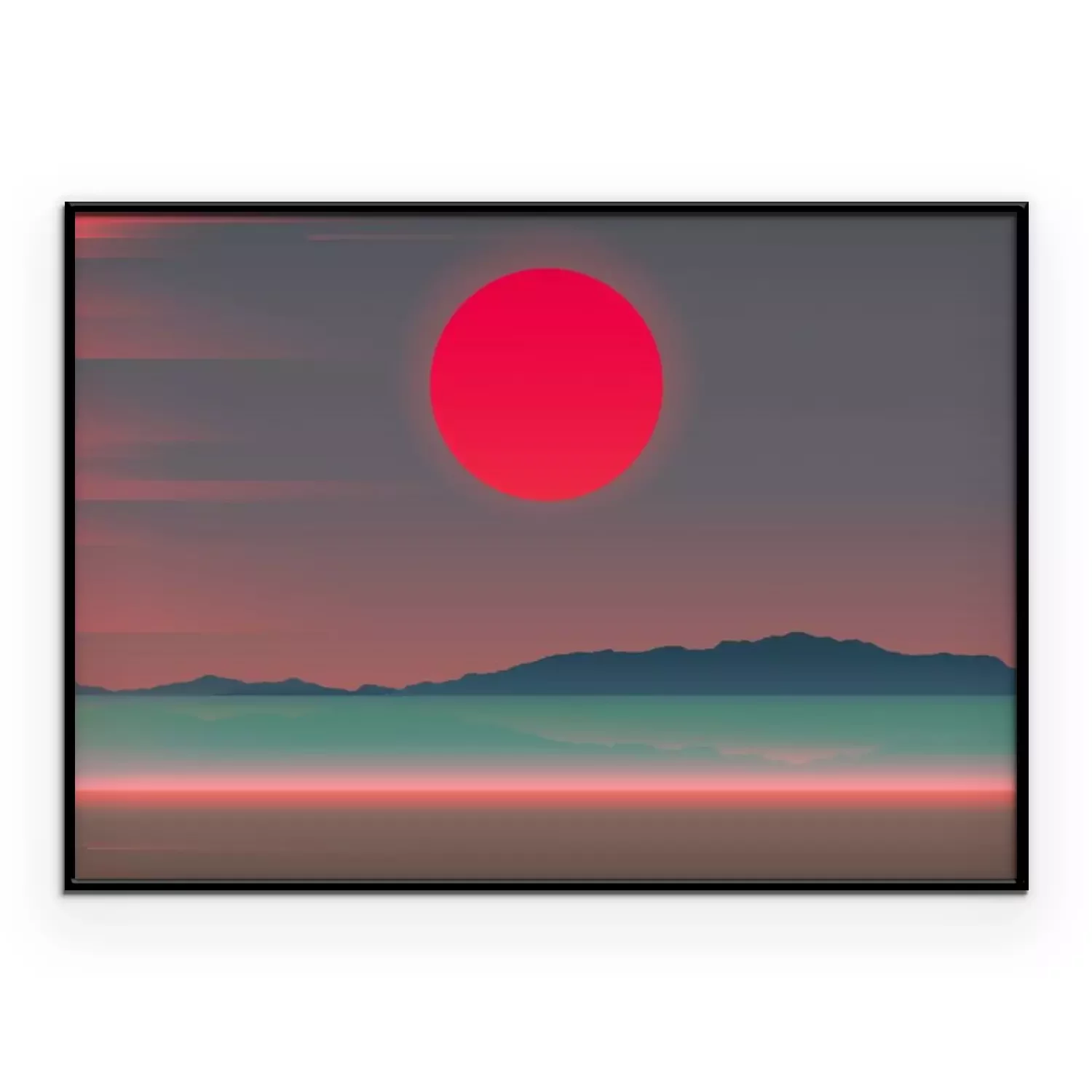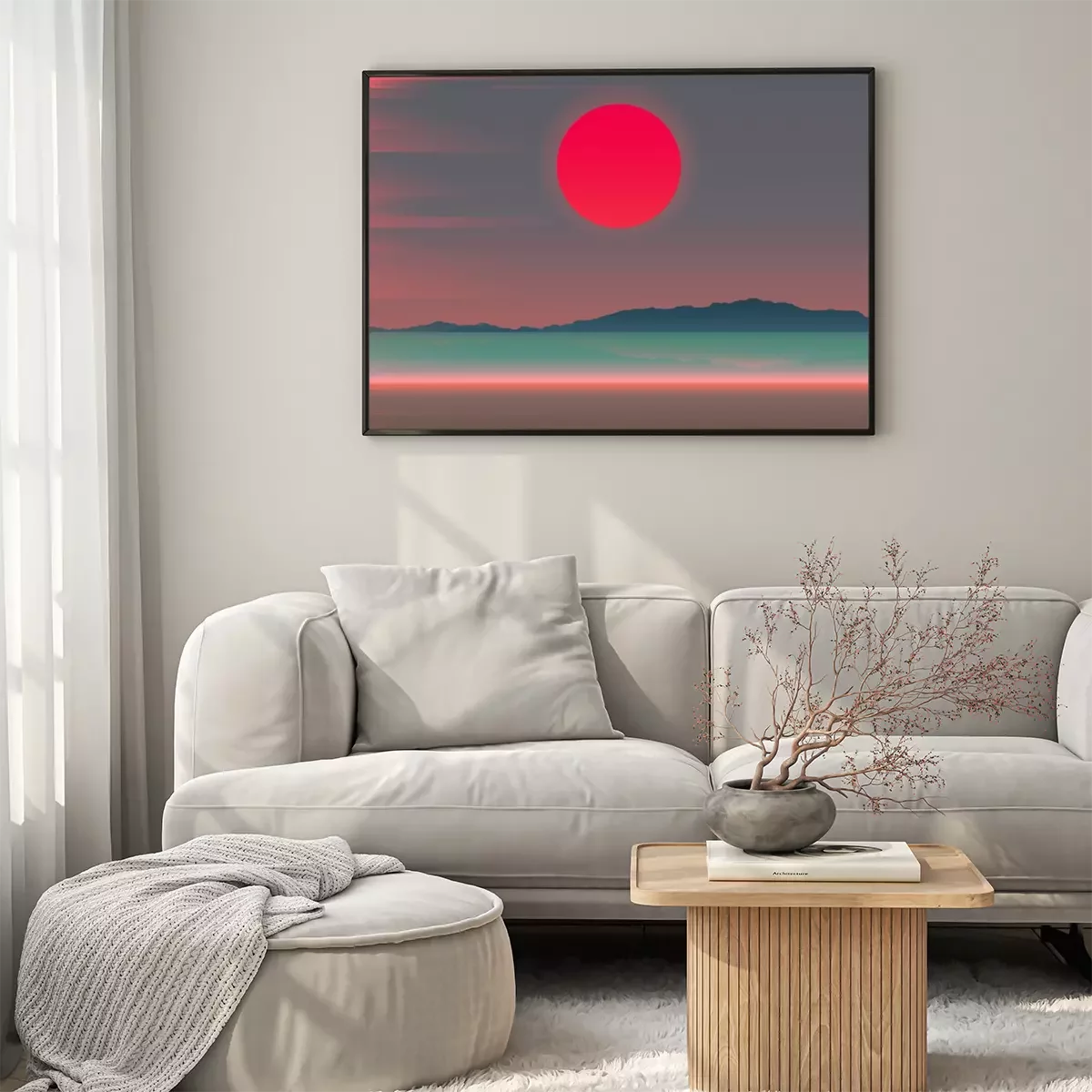Poster  Aesthetic beach scene landscape with big red sunset and light leak overlay, soft cool pastel gradient summer vibe