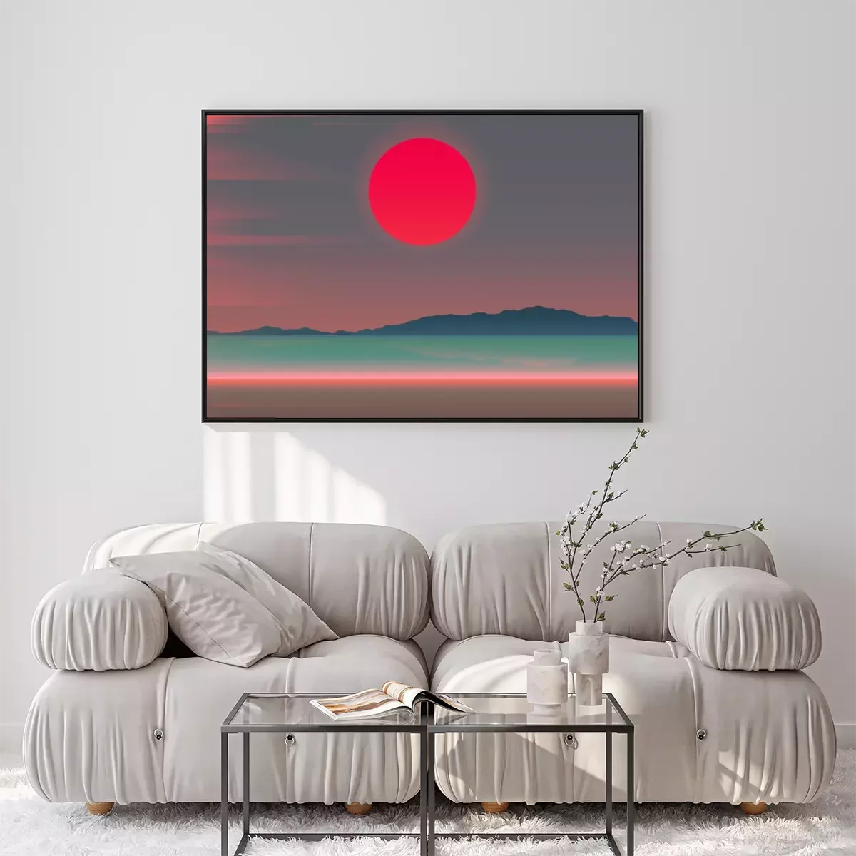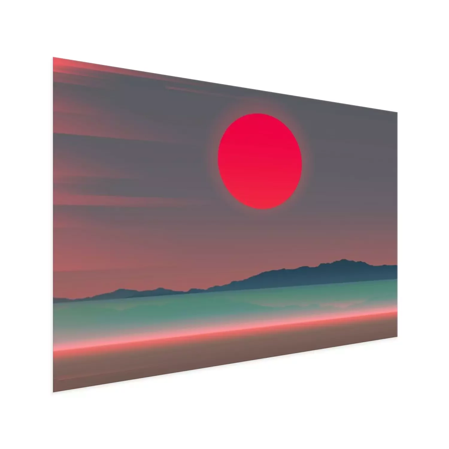 Poster : Aesthetic beach scene landscape with big red sunset and light leak overlay, soft cool pastel gradient summer vibe