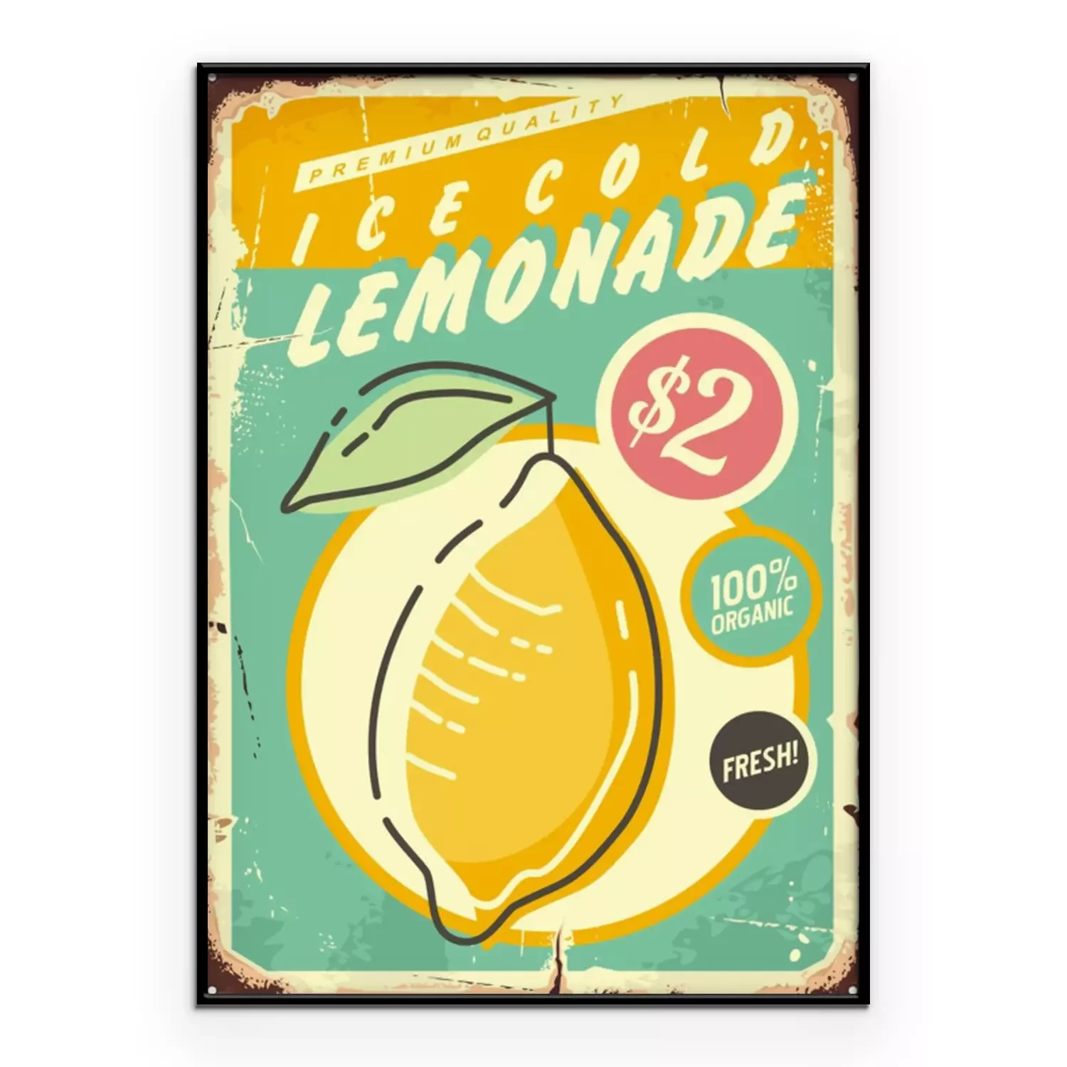 Poster  Affiche publicitaire promotionnelle de limonade avec des fruits de citron frais et juteux. Vintage signe pour la limonade glacée.