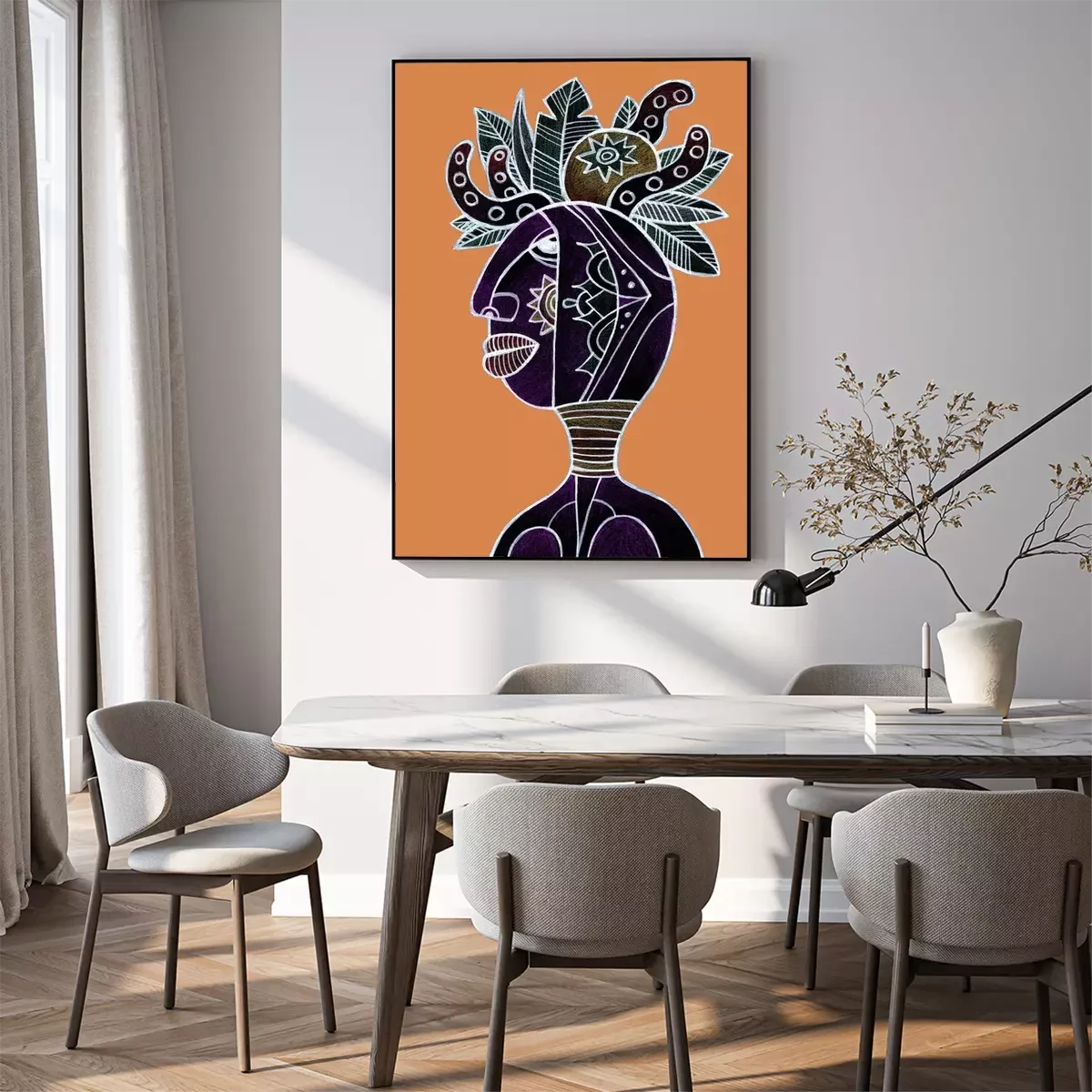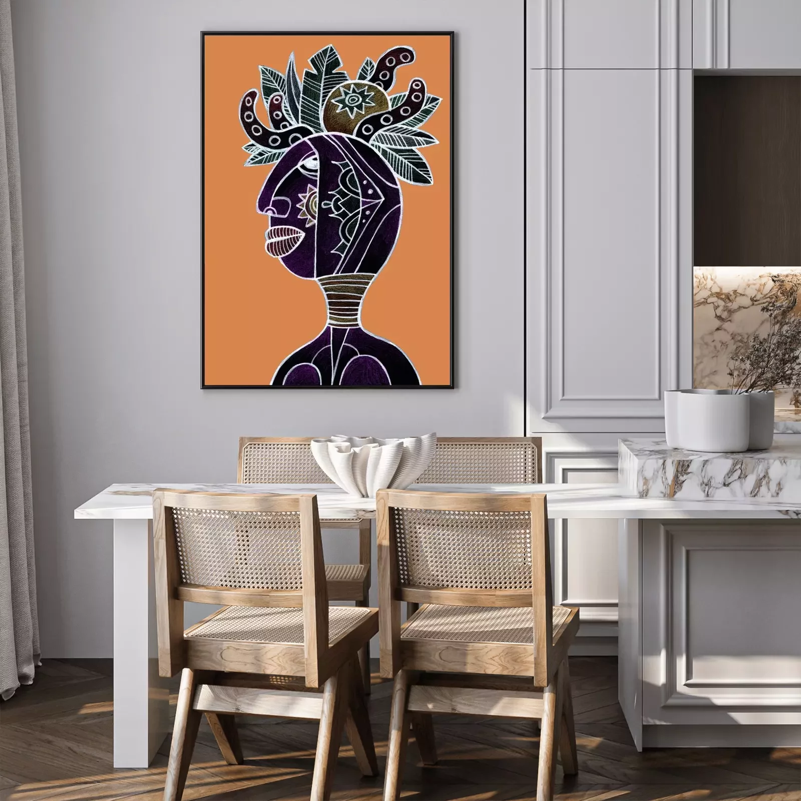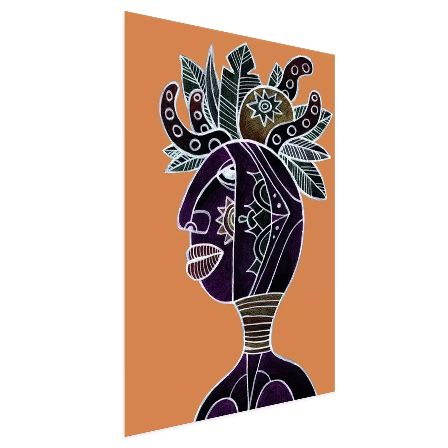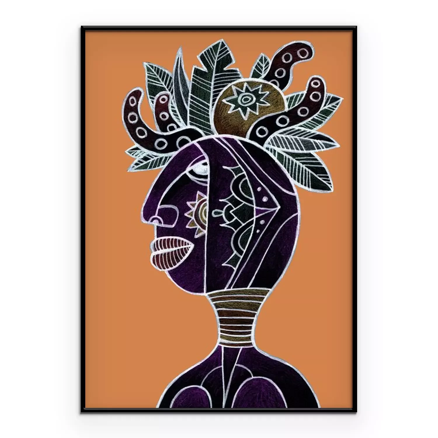 Poster  African woman with tropical fruit and leaves on her head. Tribal hand drawn illustration.