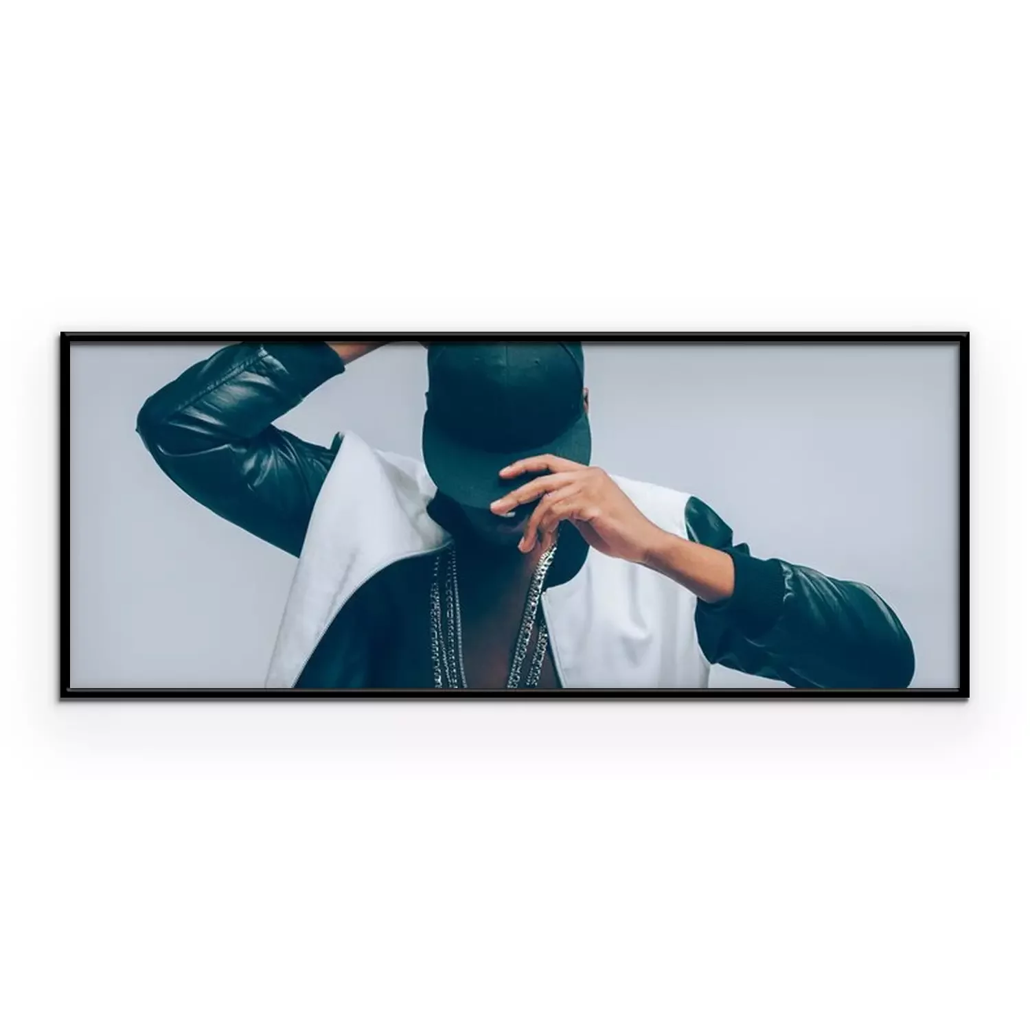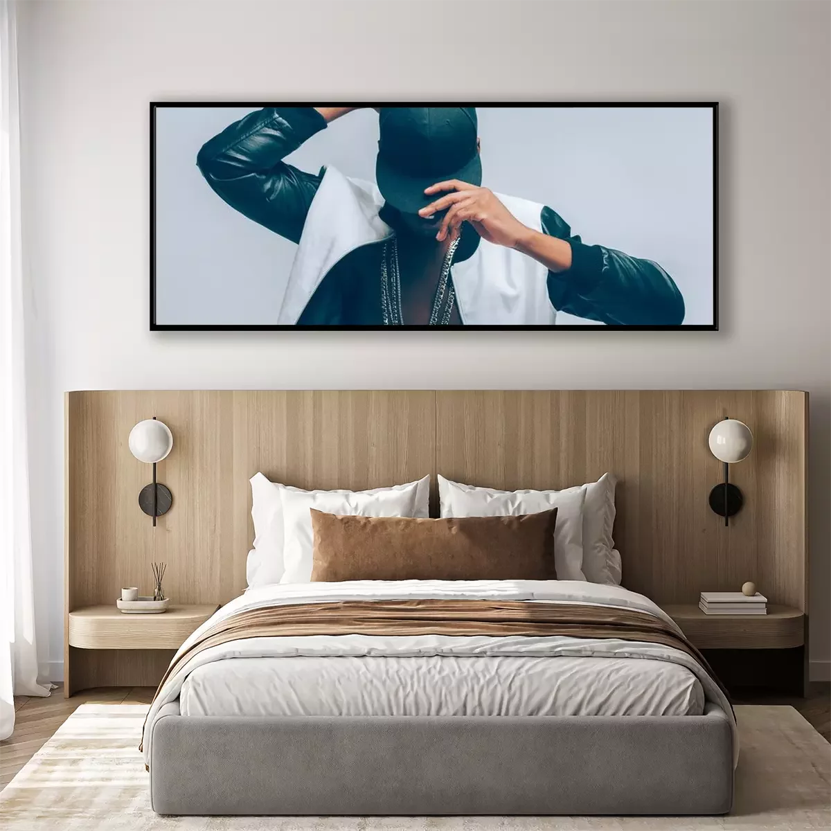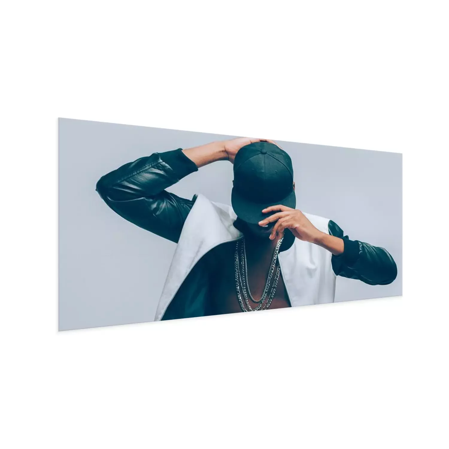 Poster  Afro american urban guy. Rapper posing in cap and leather jacket on naked torso. Head tilted down. Rap culture lifestyle.