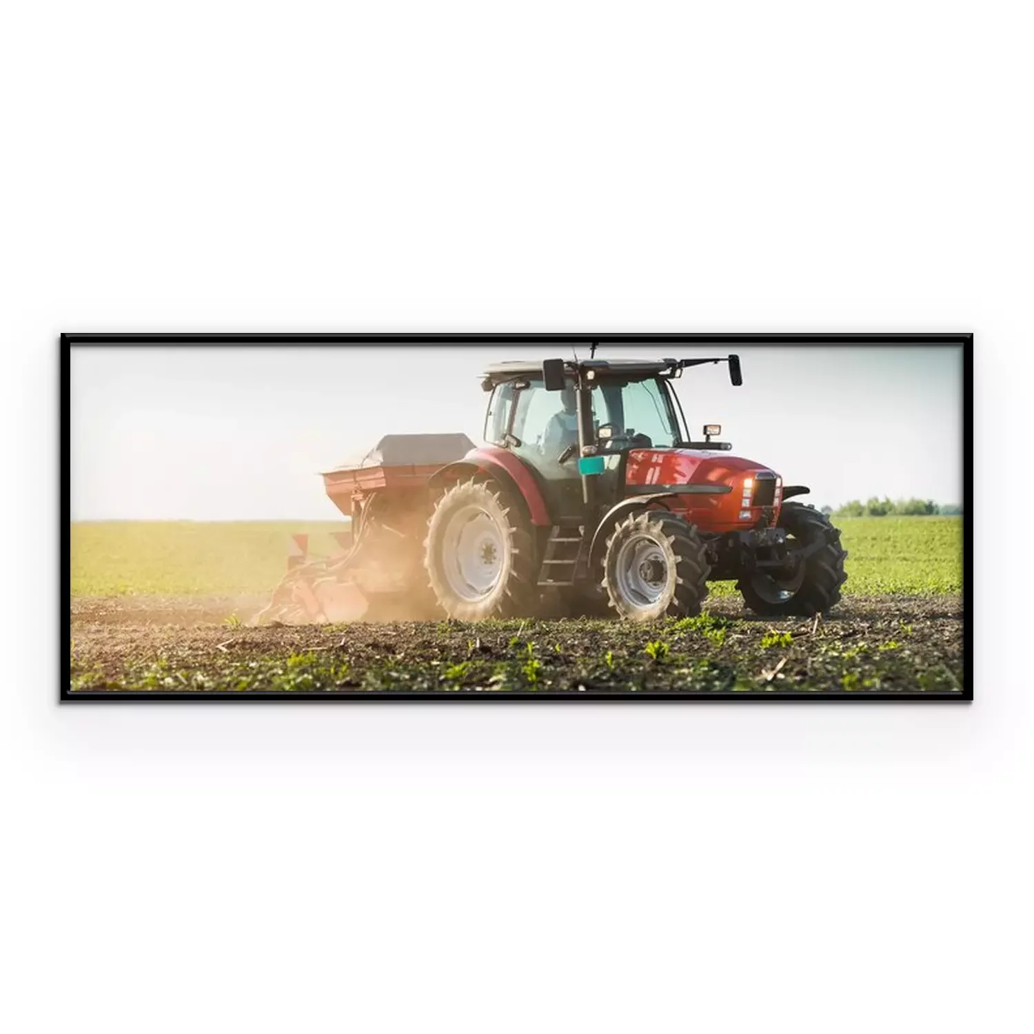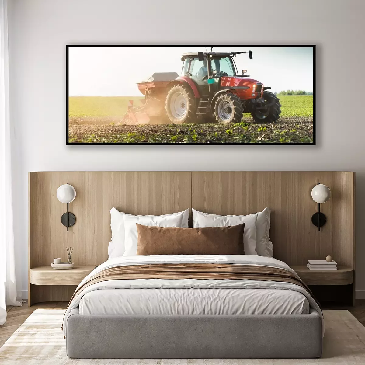 Poster : Agriculteur avec semoir de tracteur - semer des cultures au champ agricole au printemps