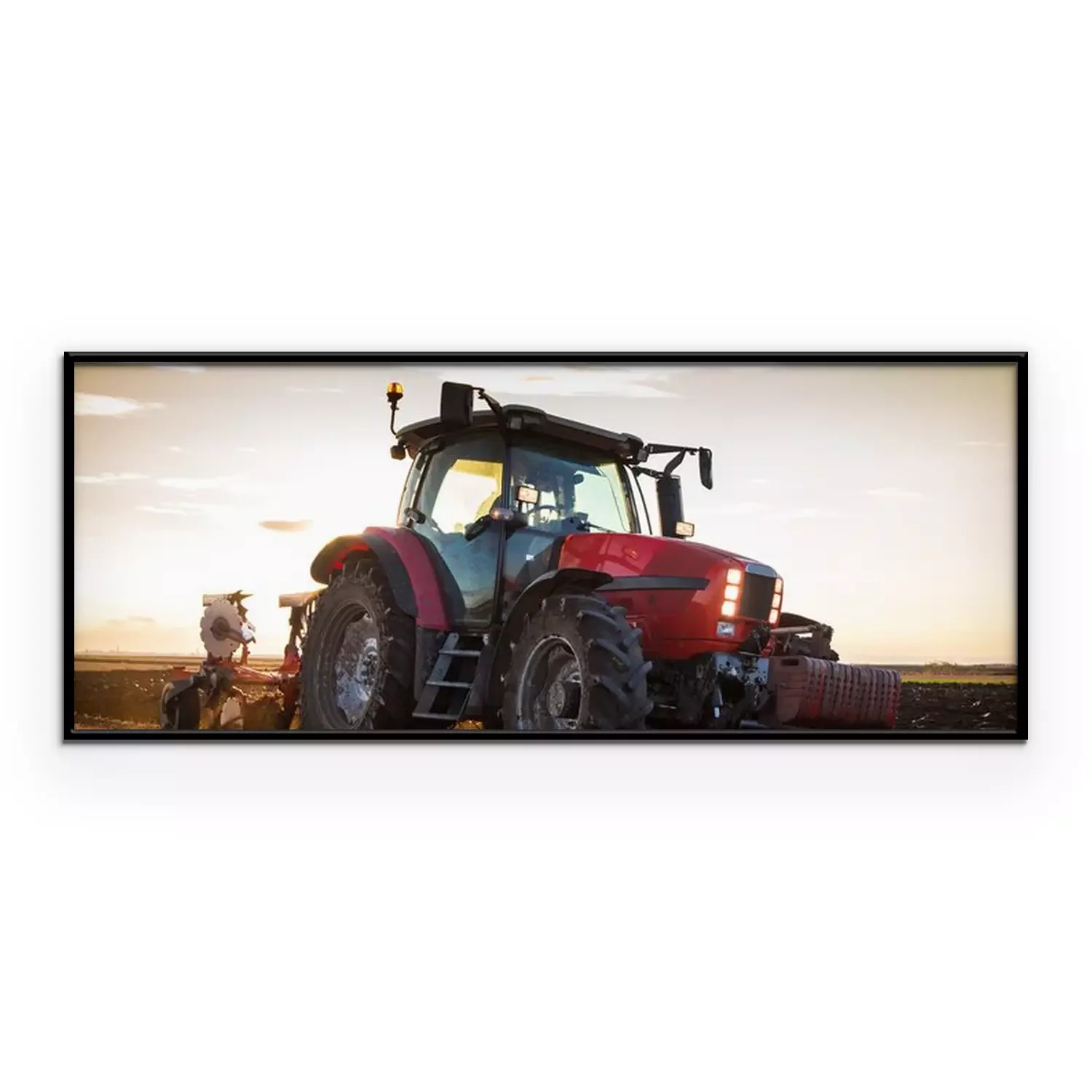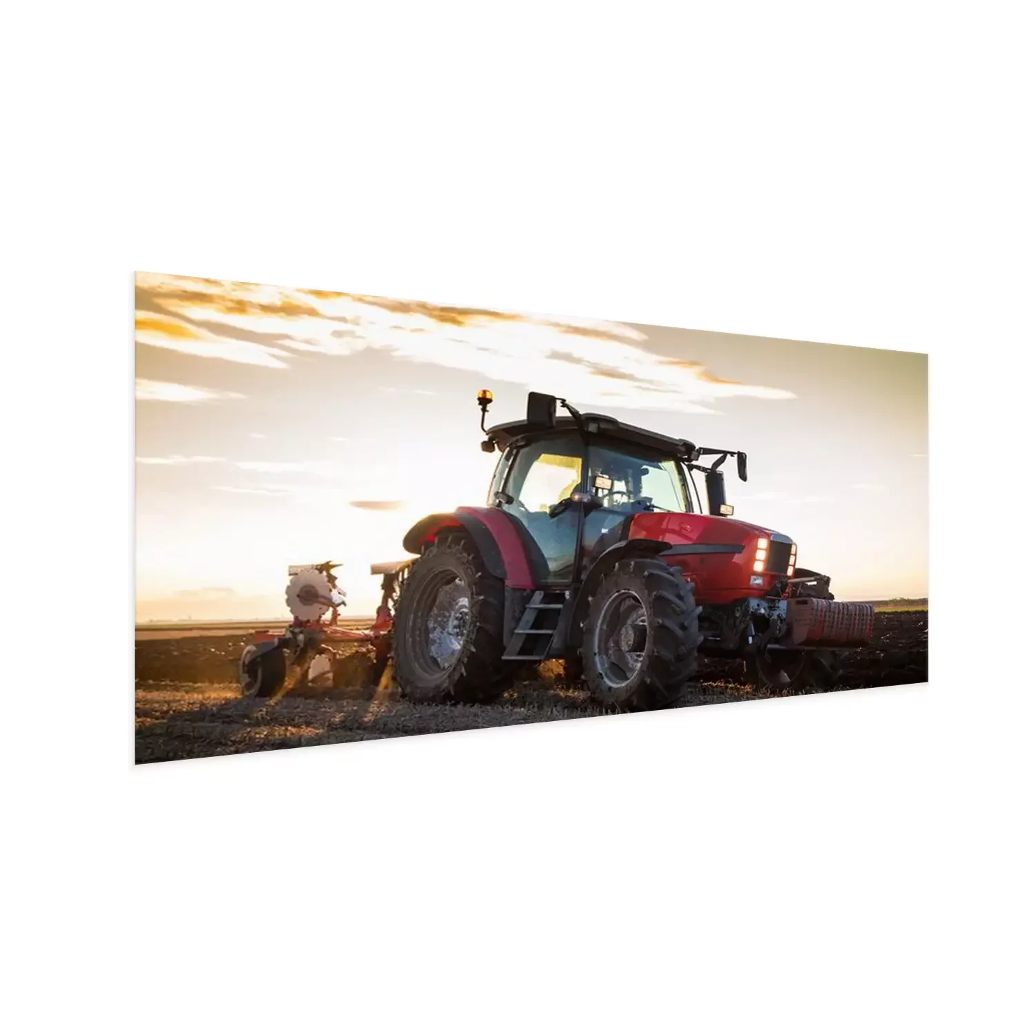 Poster : Agriculteur qui laboure un champ de chaume avec tracteur rouge au coucher du soleil