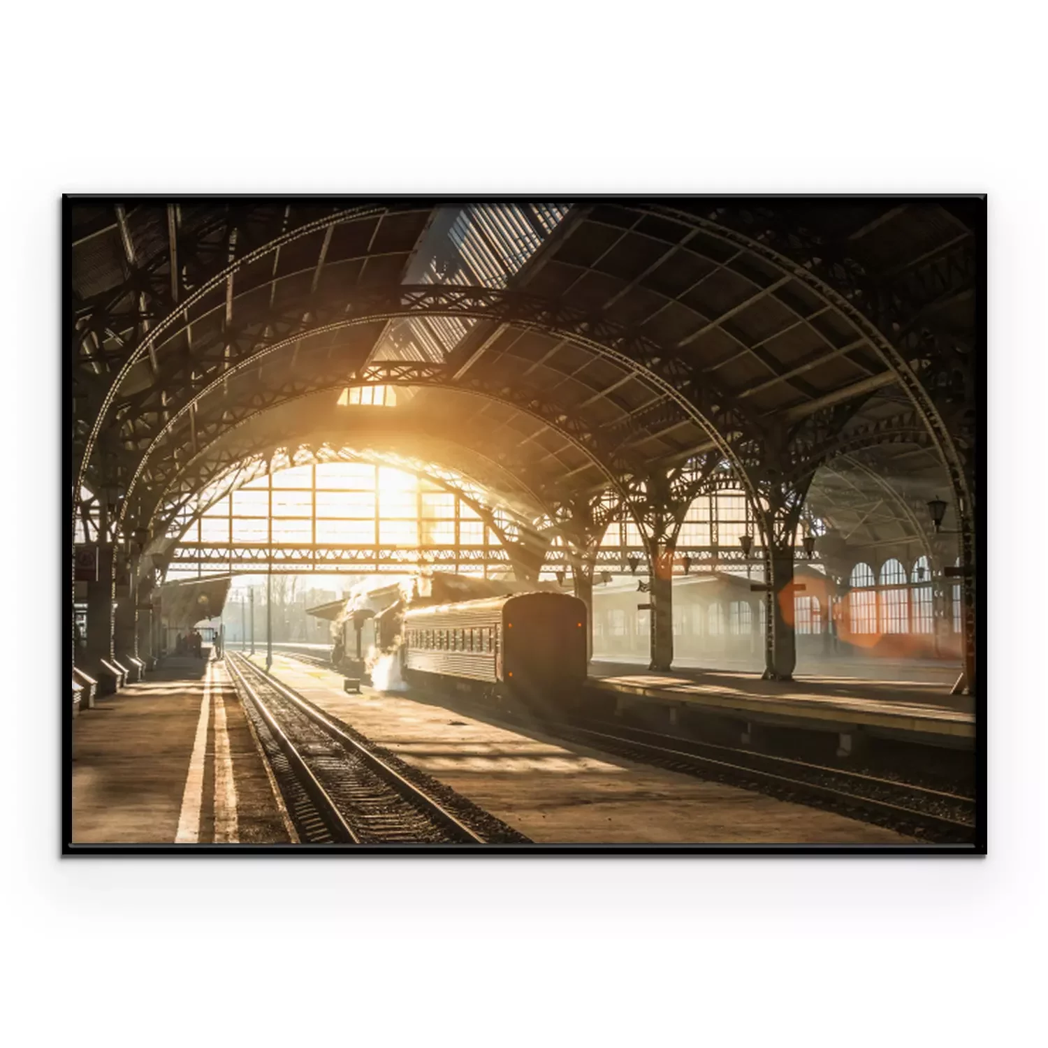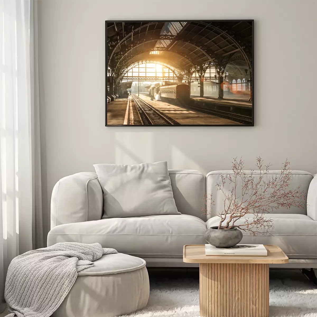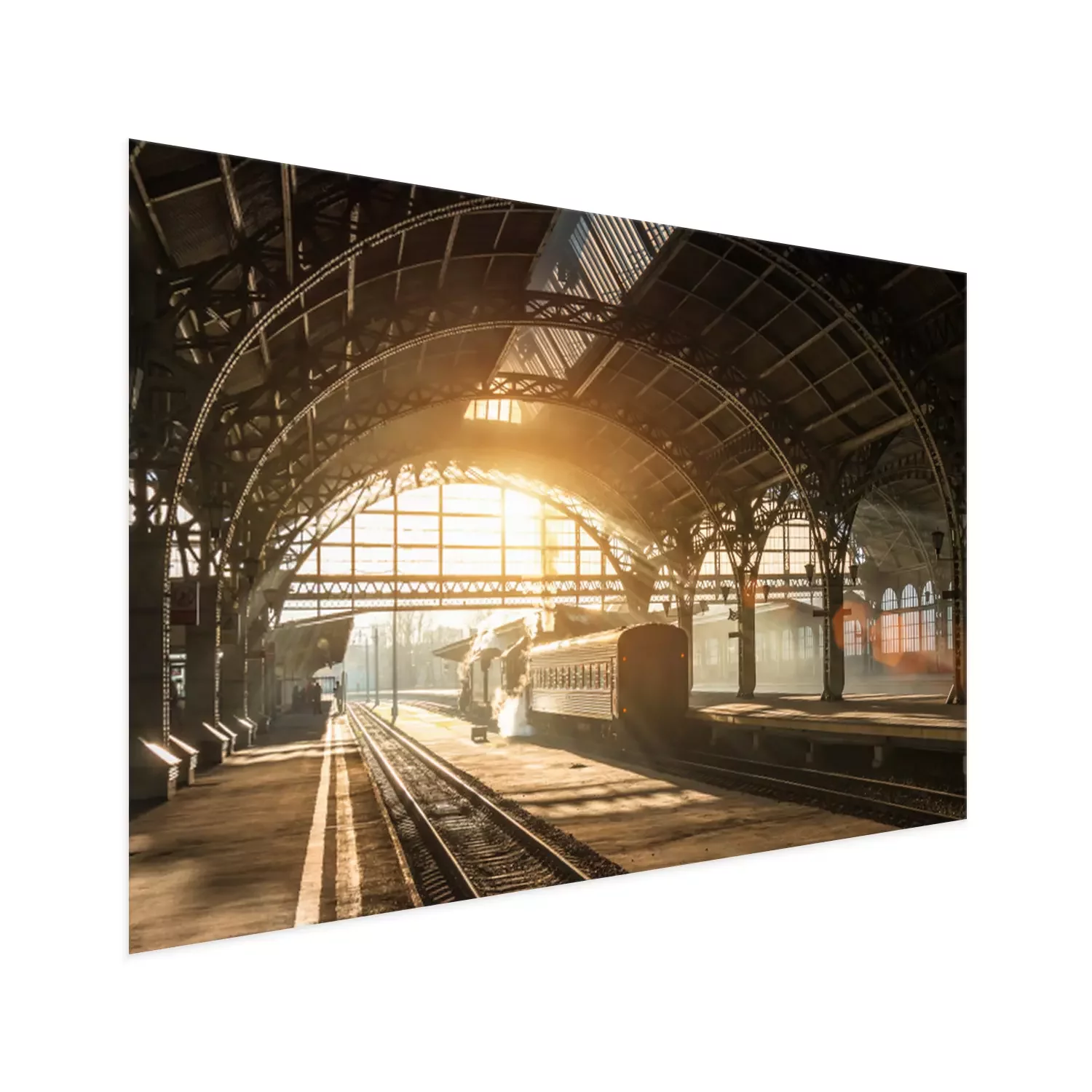 Poster : Ancienne gare avec un train et une locomotive sur le quai en attente de départ. Les rayons du soleil du soir dans les arcs de fumée.