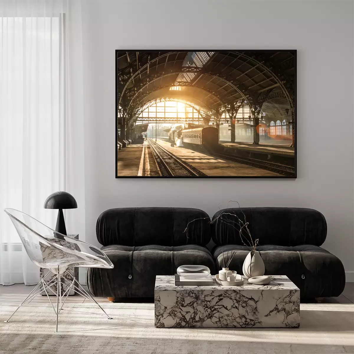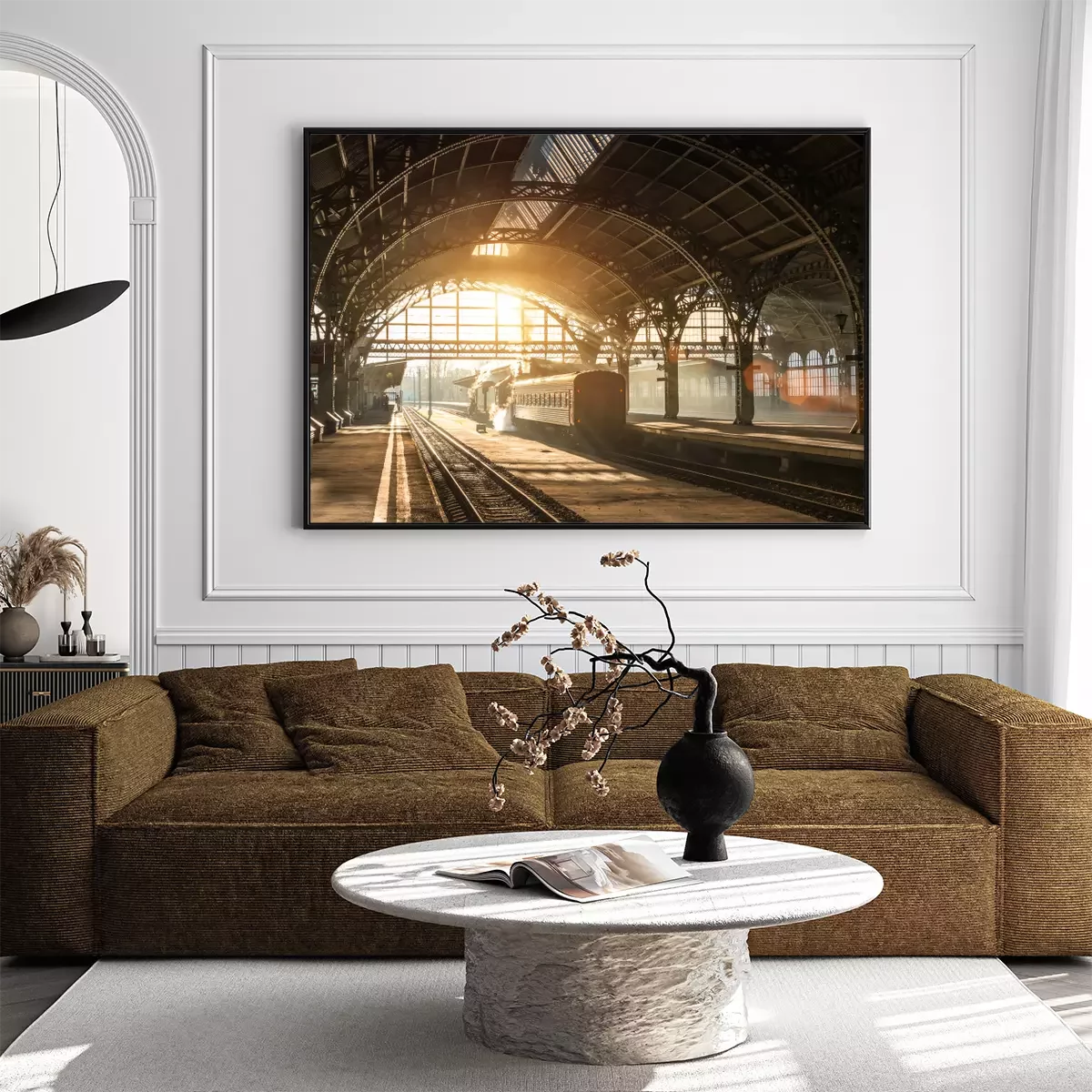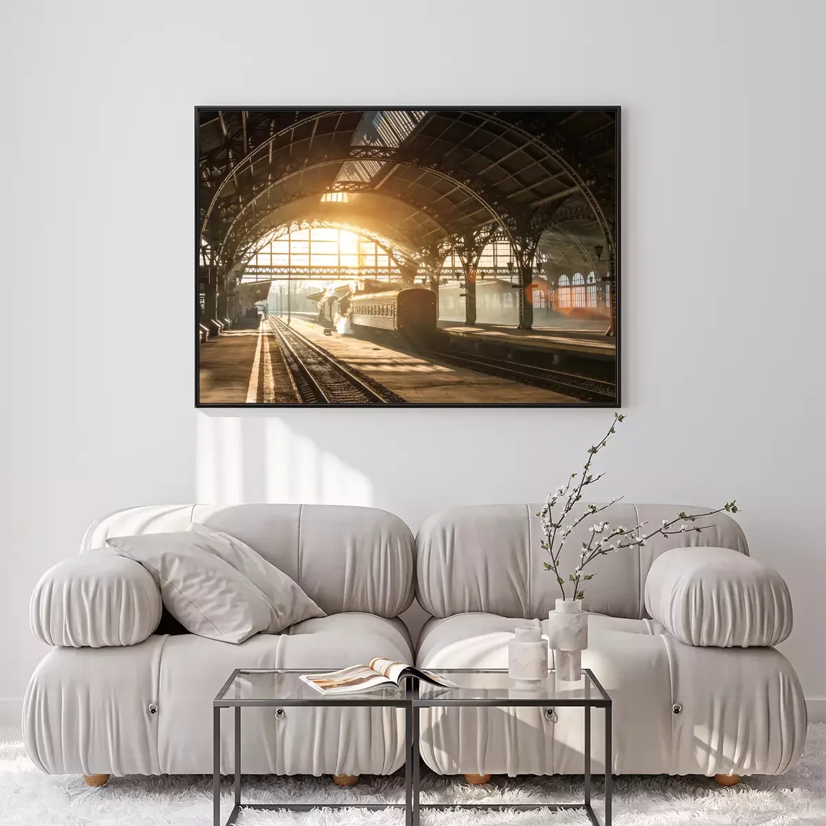Poster : Ancienne gare avec un train et une locomotive sur le quai en attente de départ. Les rayons du soleil du soir dans les arcs de fumée.