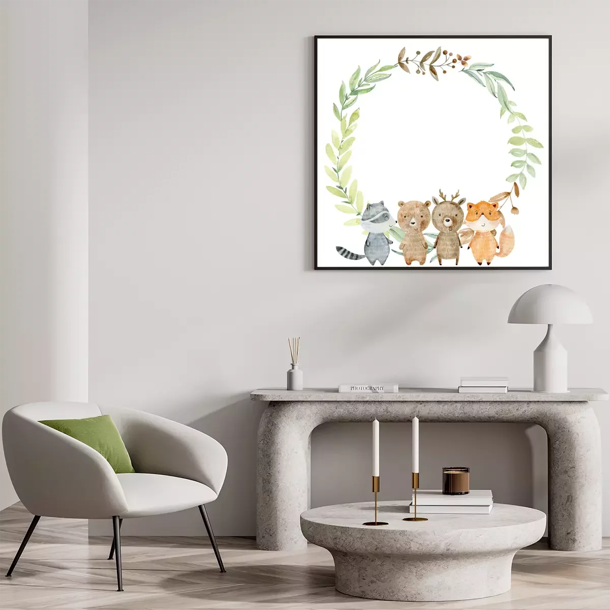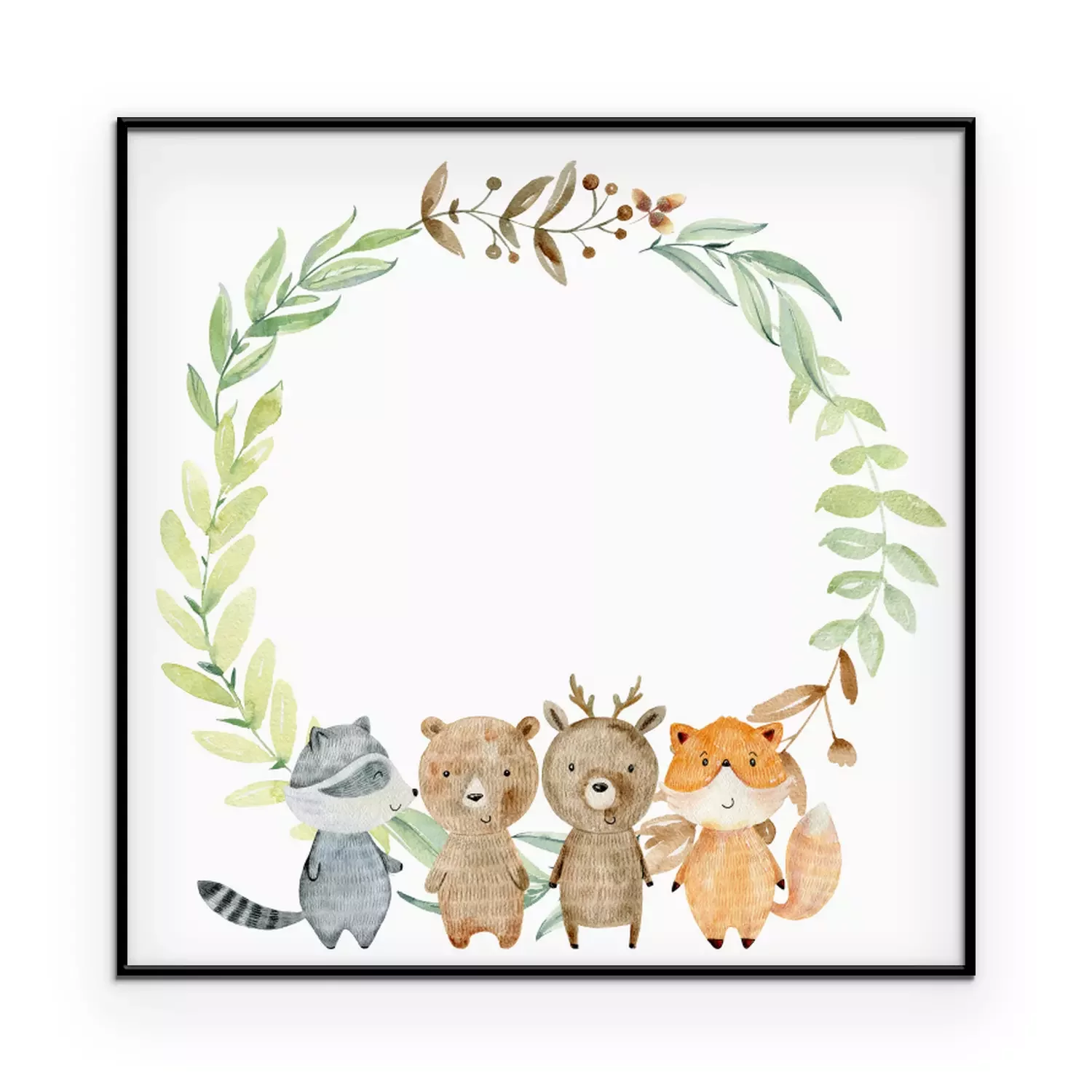 Poster  Animaux de la forêt sur le fond d'une couronne de feuilles