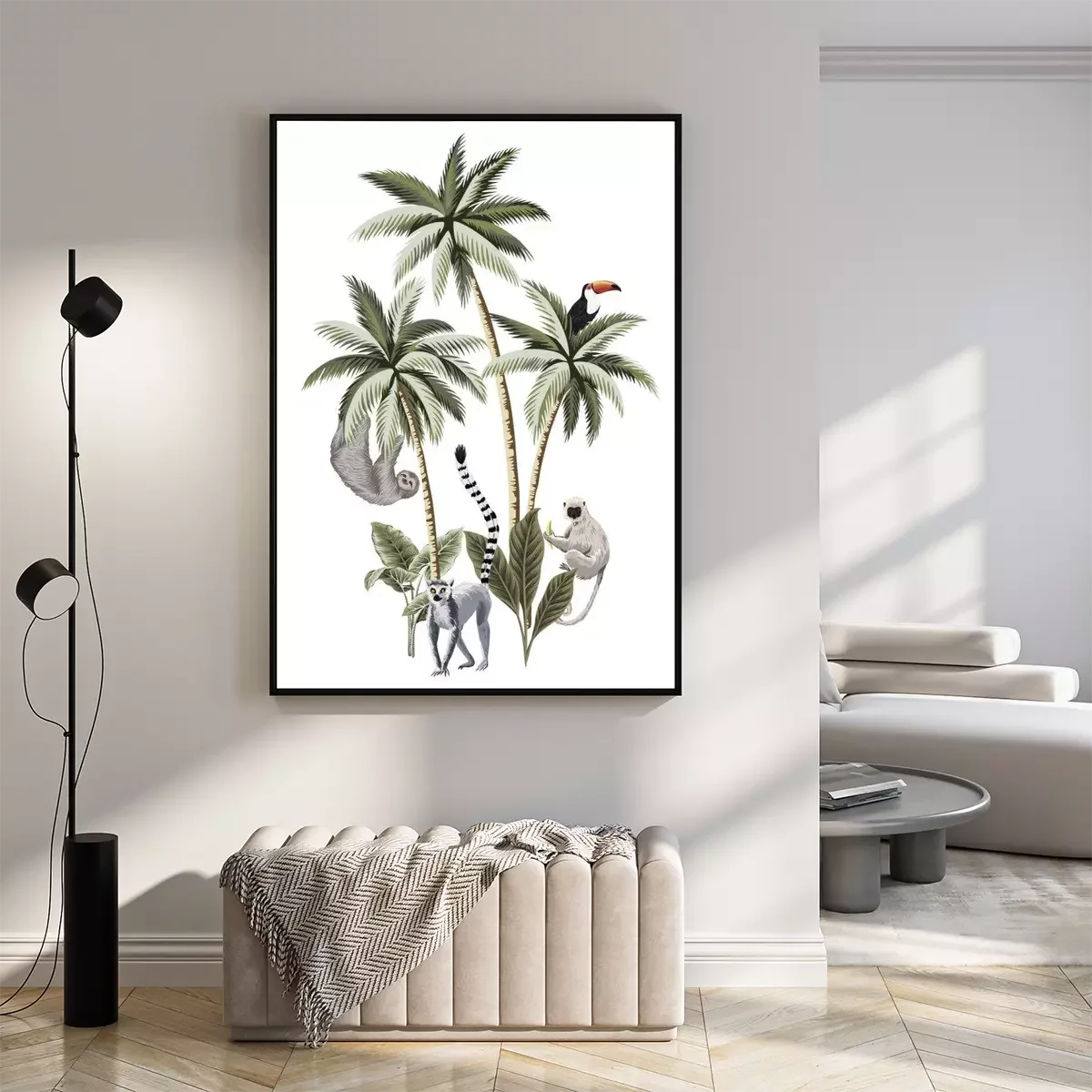Tropical vintage monkey animal, hibiscus flower, peach fruit, palm leaves floral seamless pattern black background. Exotic jungle wallpaper.