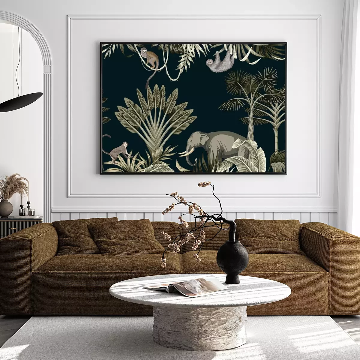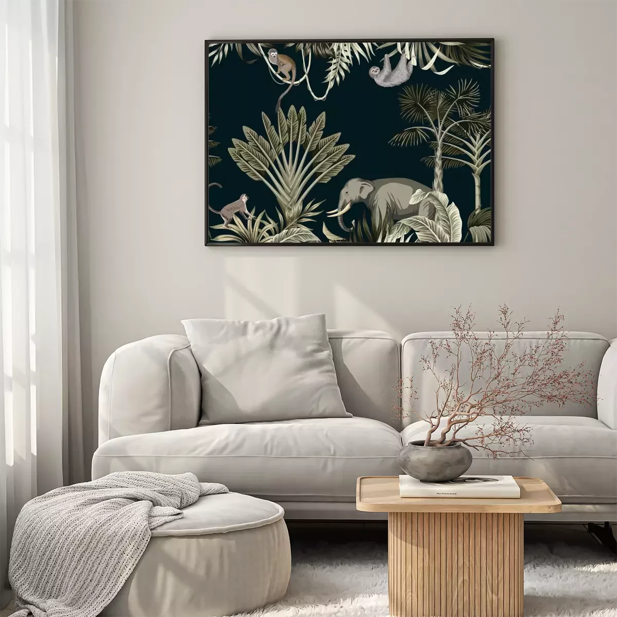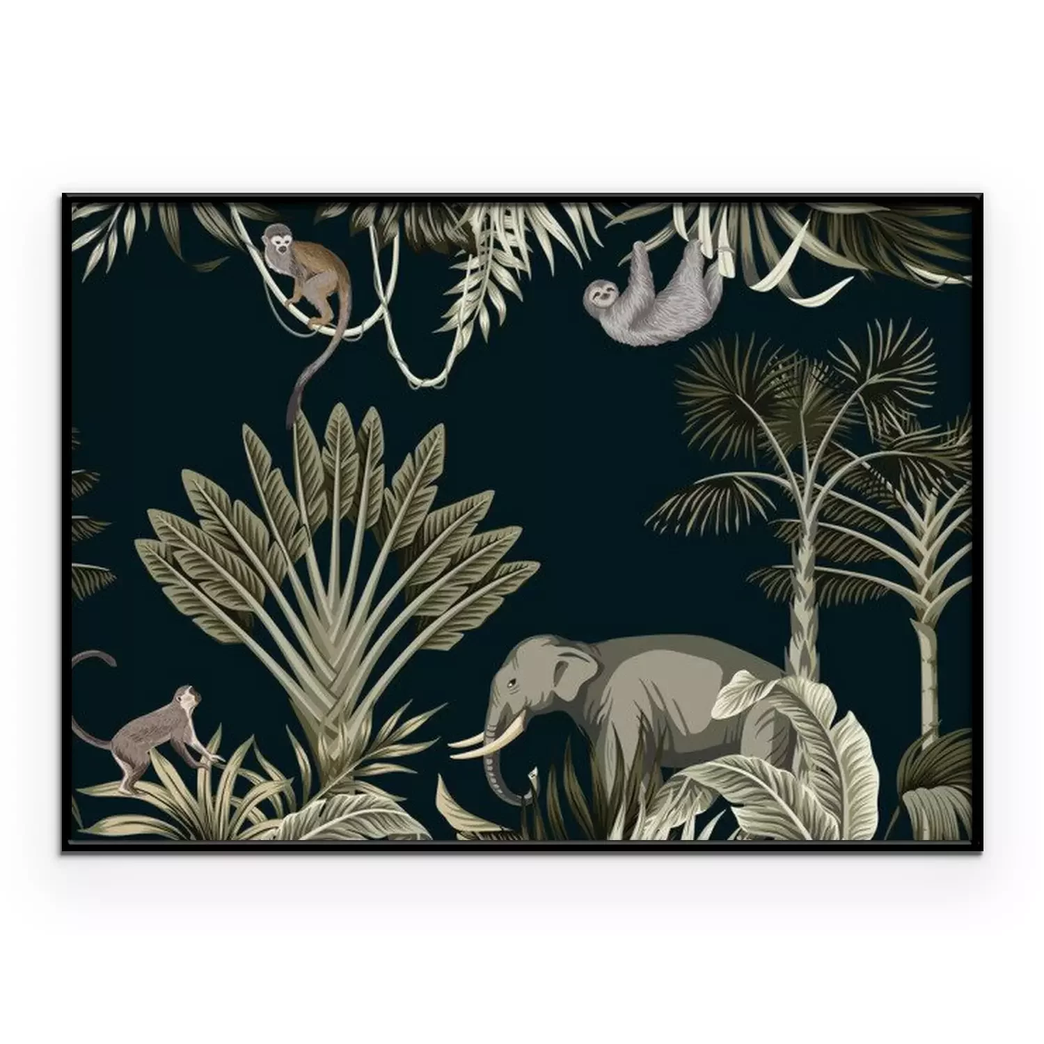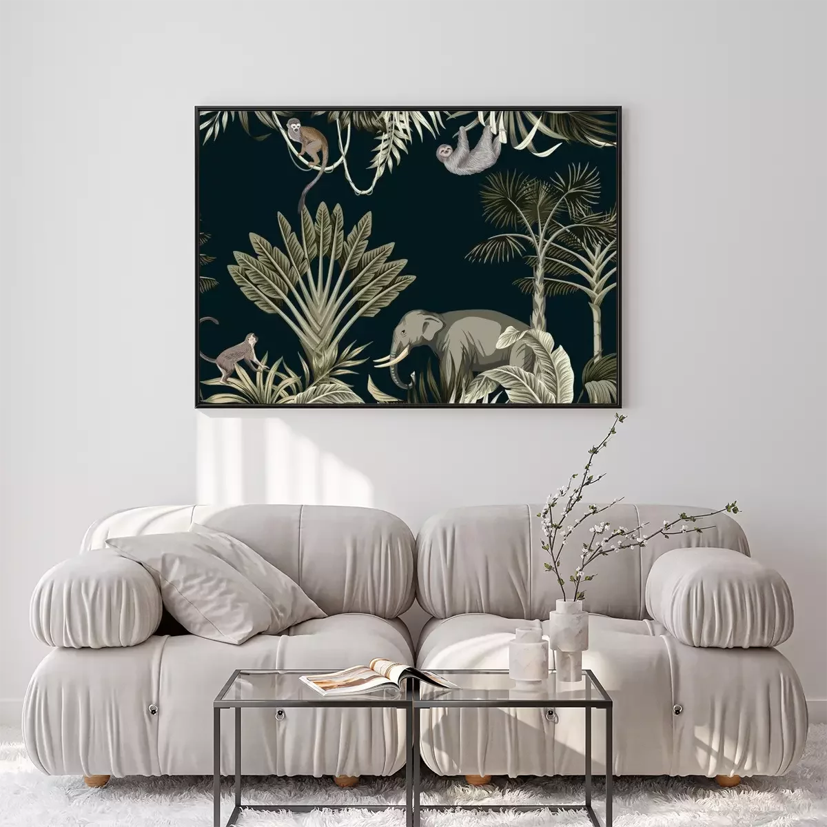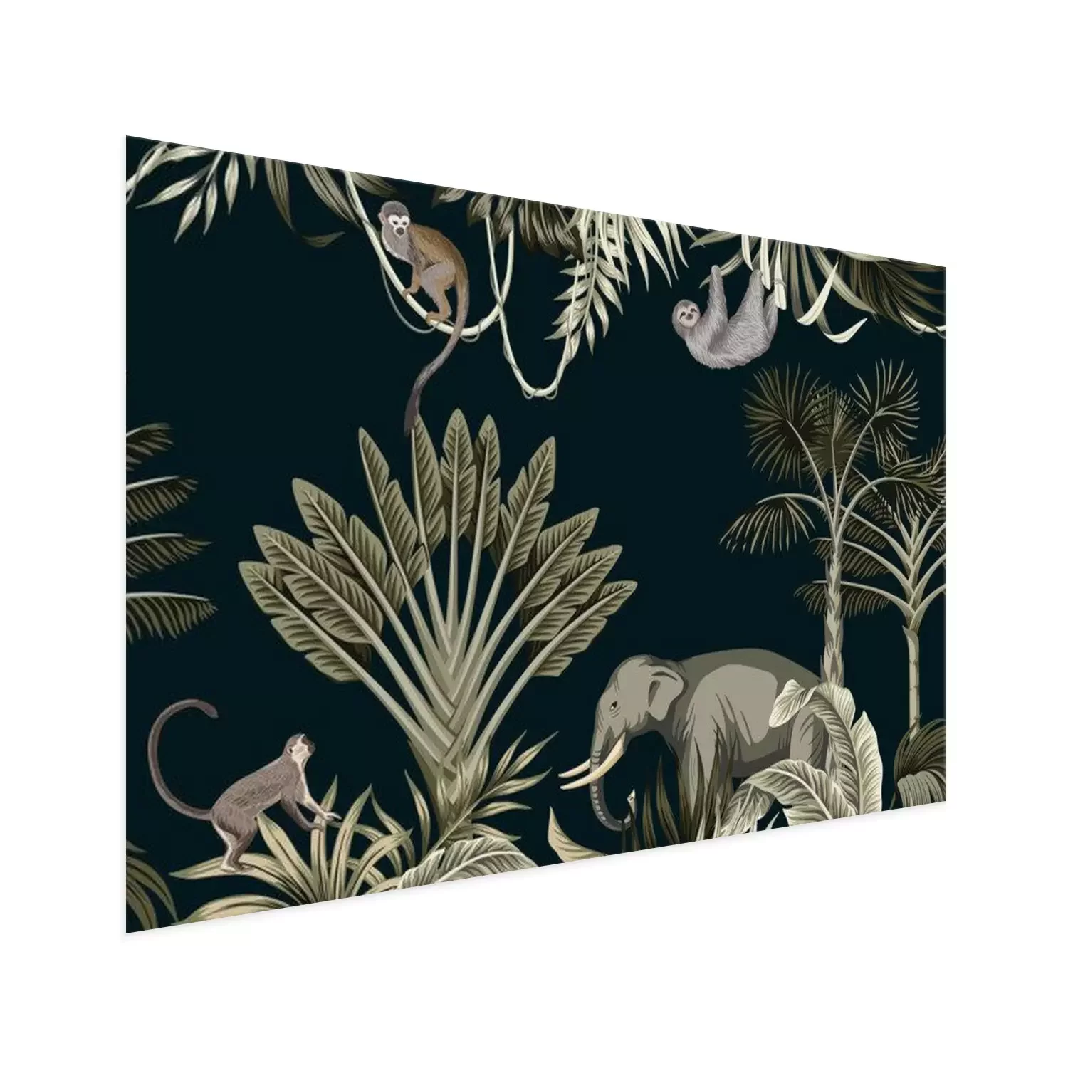 Éléphants, singes et oiseaux avec des plantes tropicales