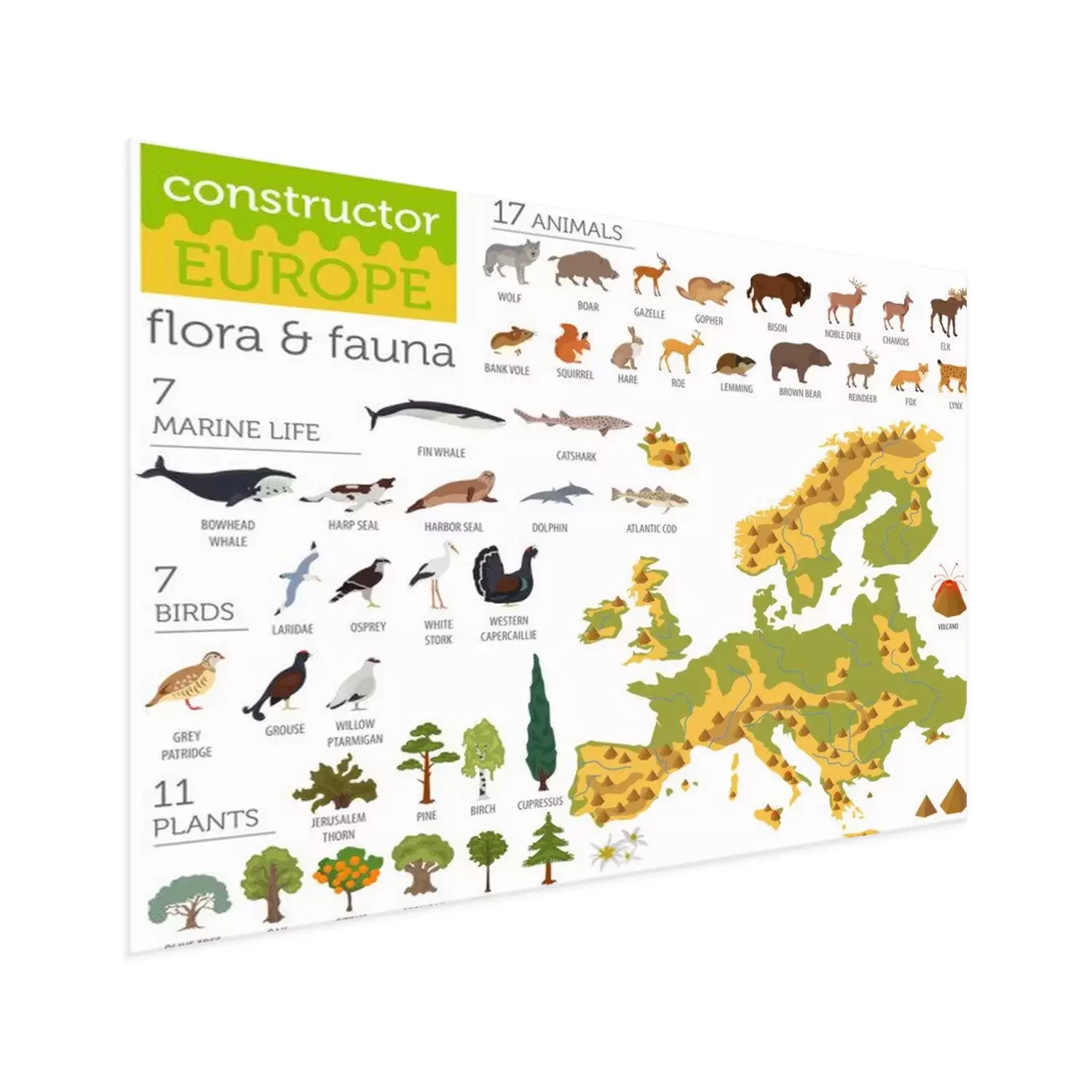 Éléments de constructeur plat européen flore et faune carte. Animaux, oiseaux et vie marine isolé sur grand ensemble blanc. Construisez votre propre collection d'infographies géographiques