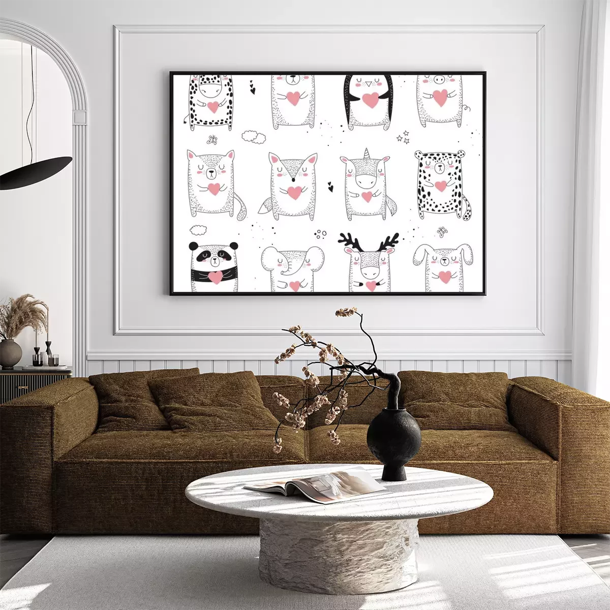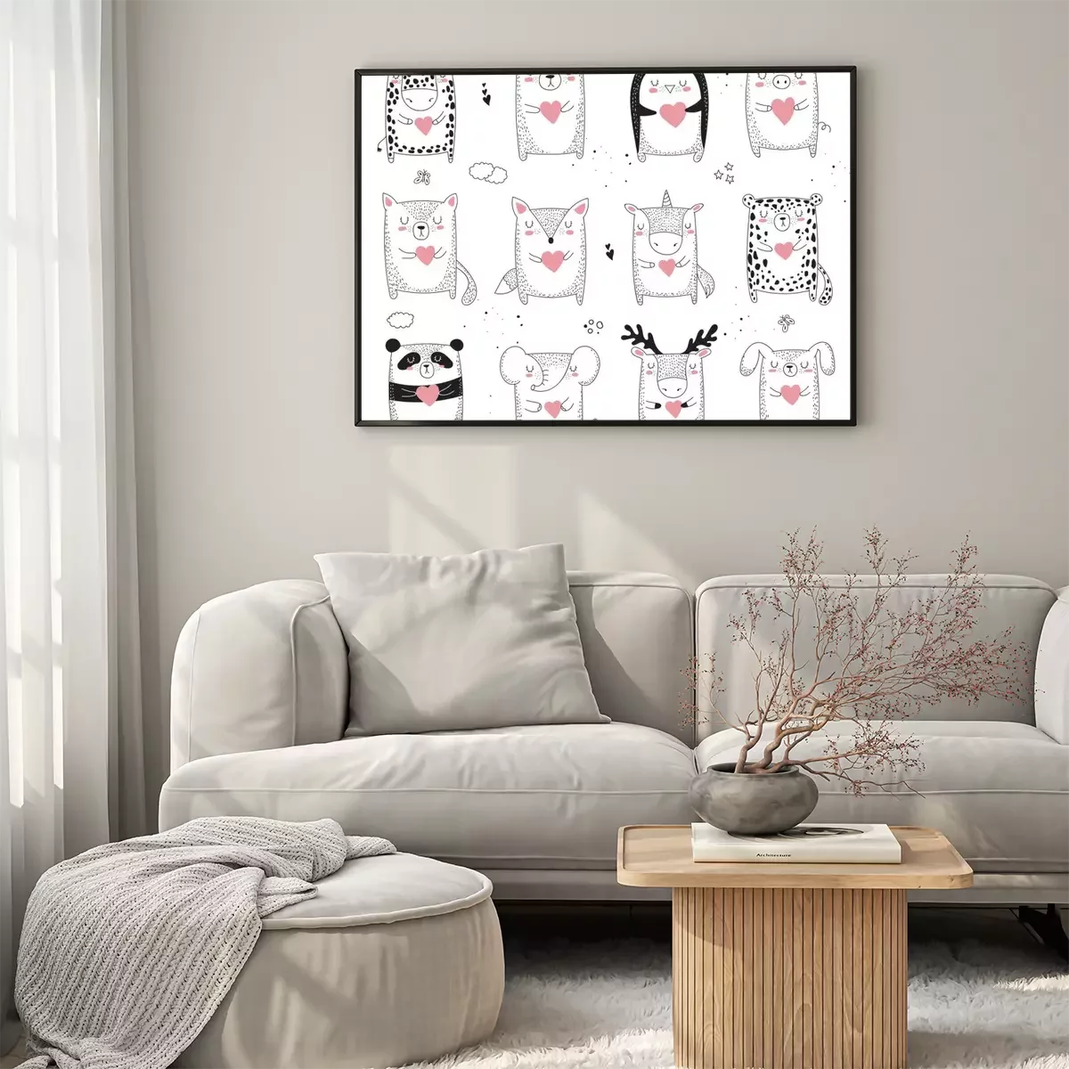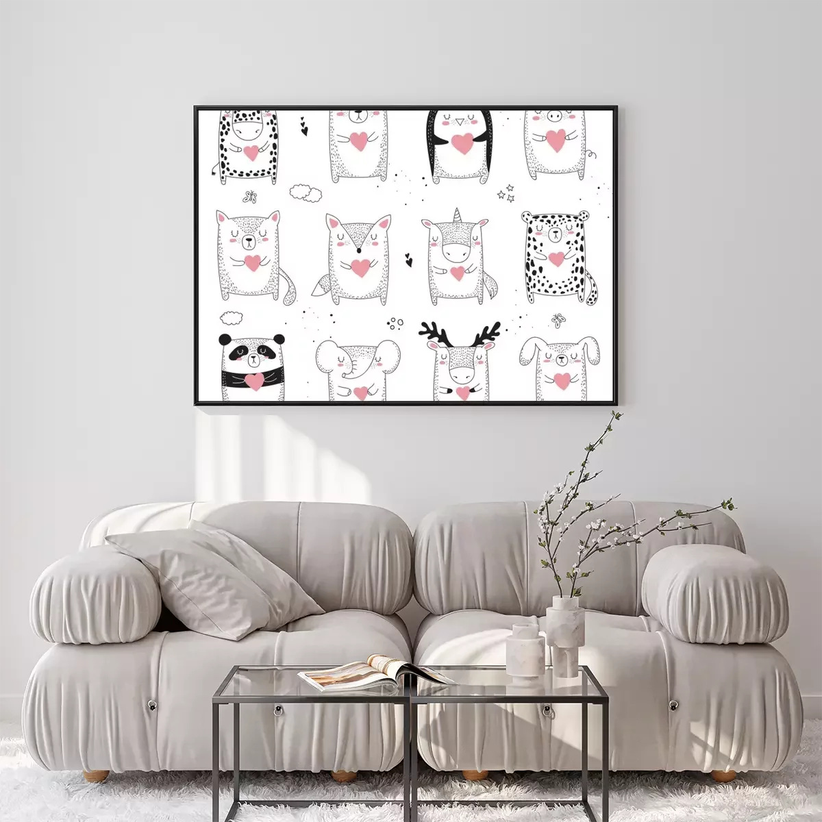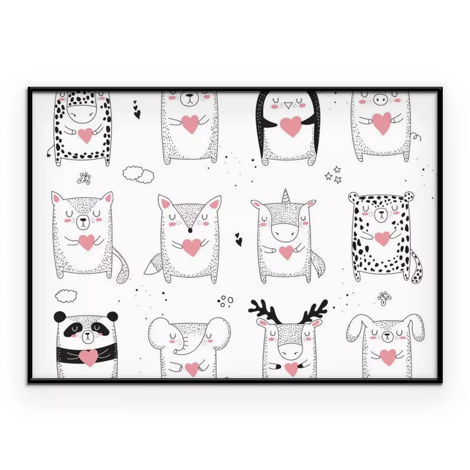 Poster  Animaux tenant des coeurs roses dans leurs pattes