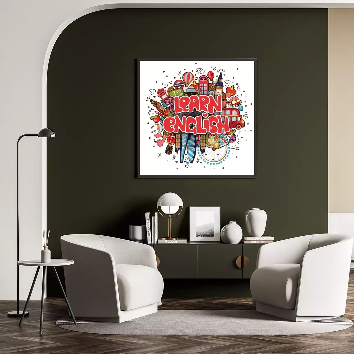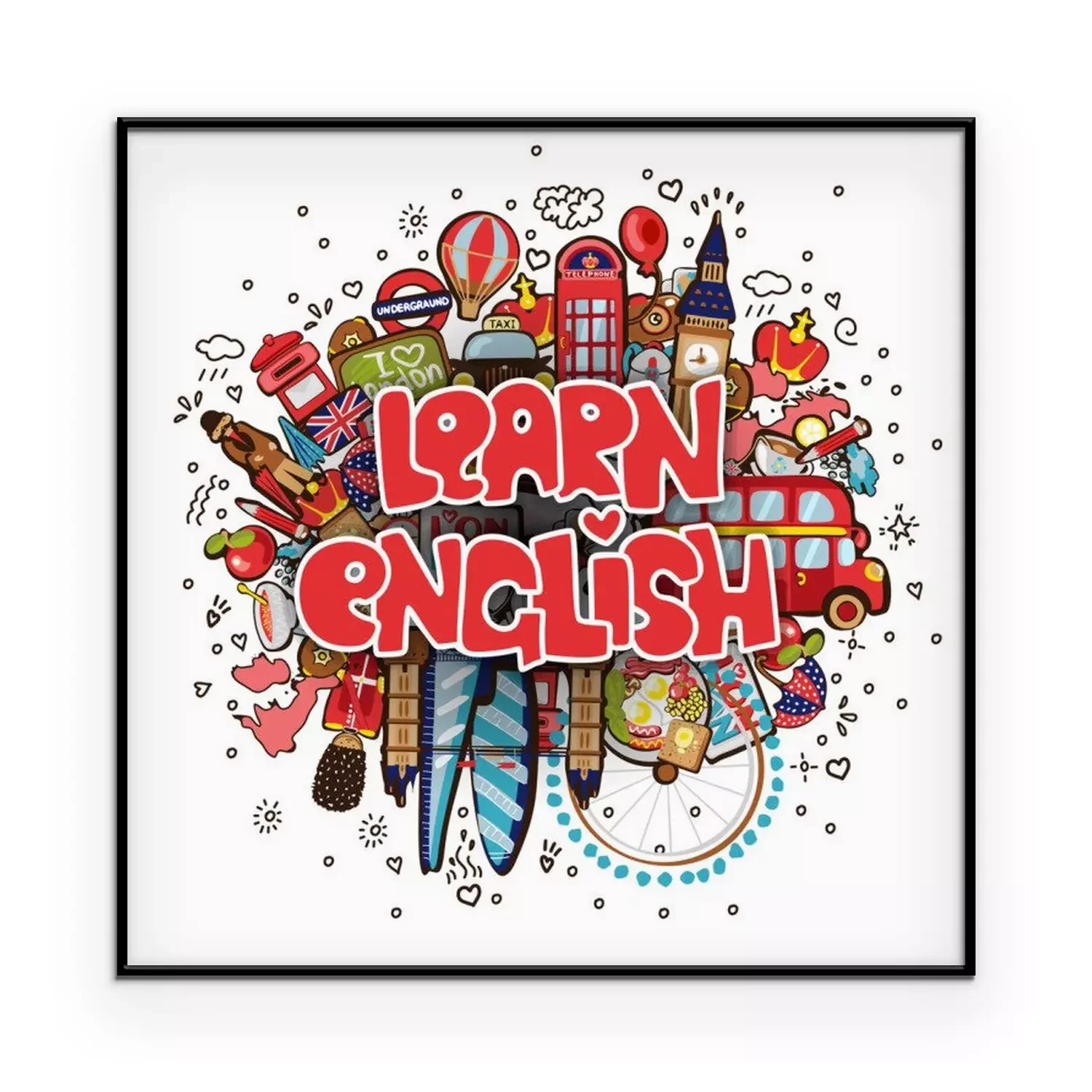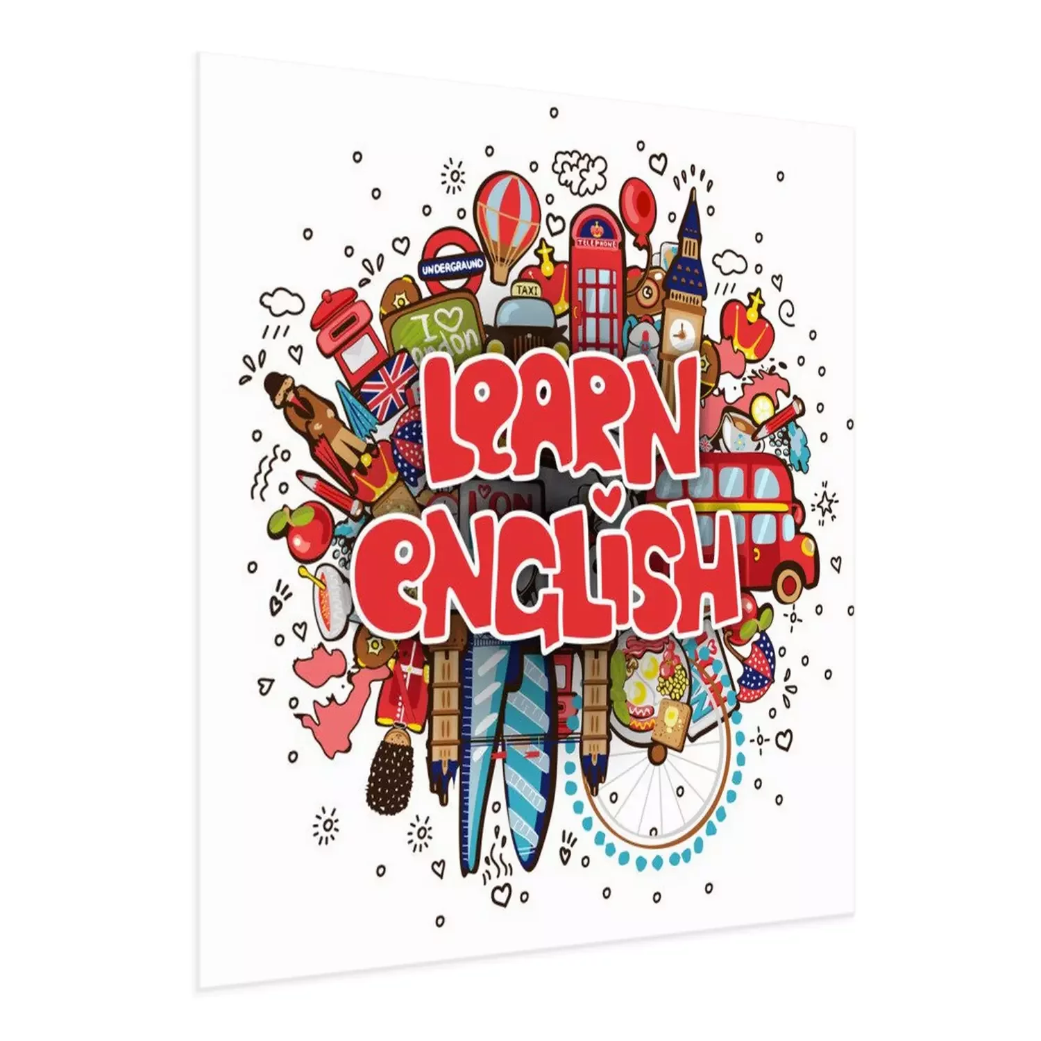Poster  Apprendre l'anglais concept éducatif et de voyage. Illustration de dessin animé anglais vector. Ensemble d'objets de dessin animé amusant avec une phrase sur Apprendre l'anglais - Concept de cours d'a