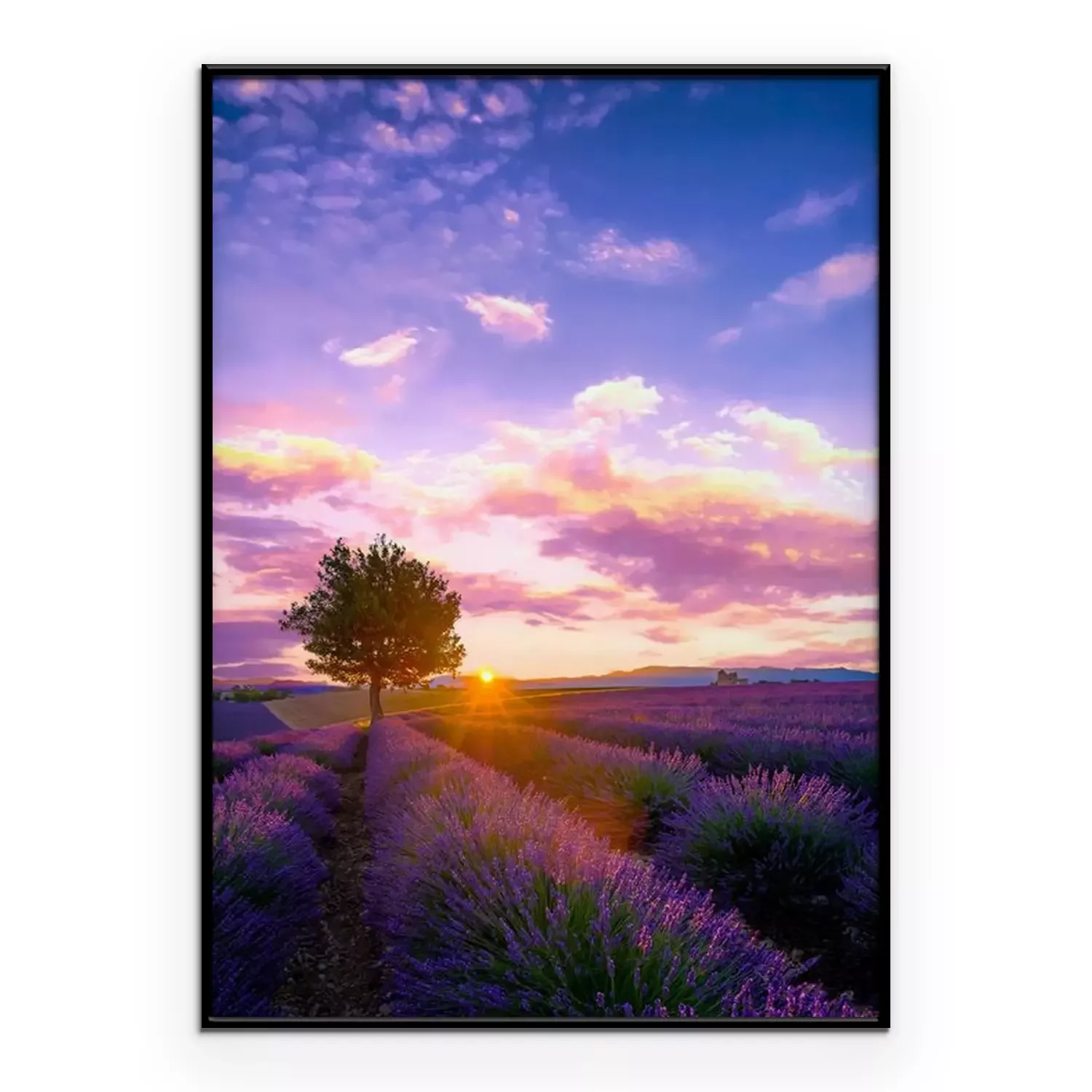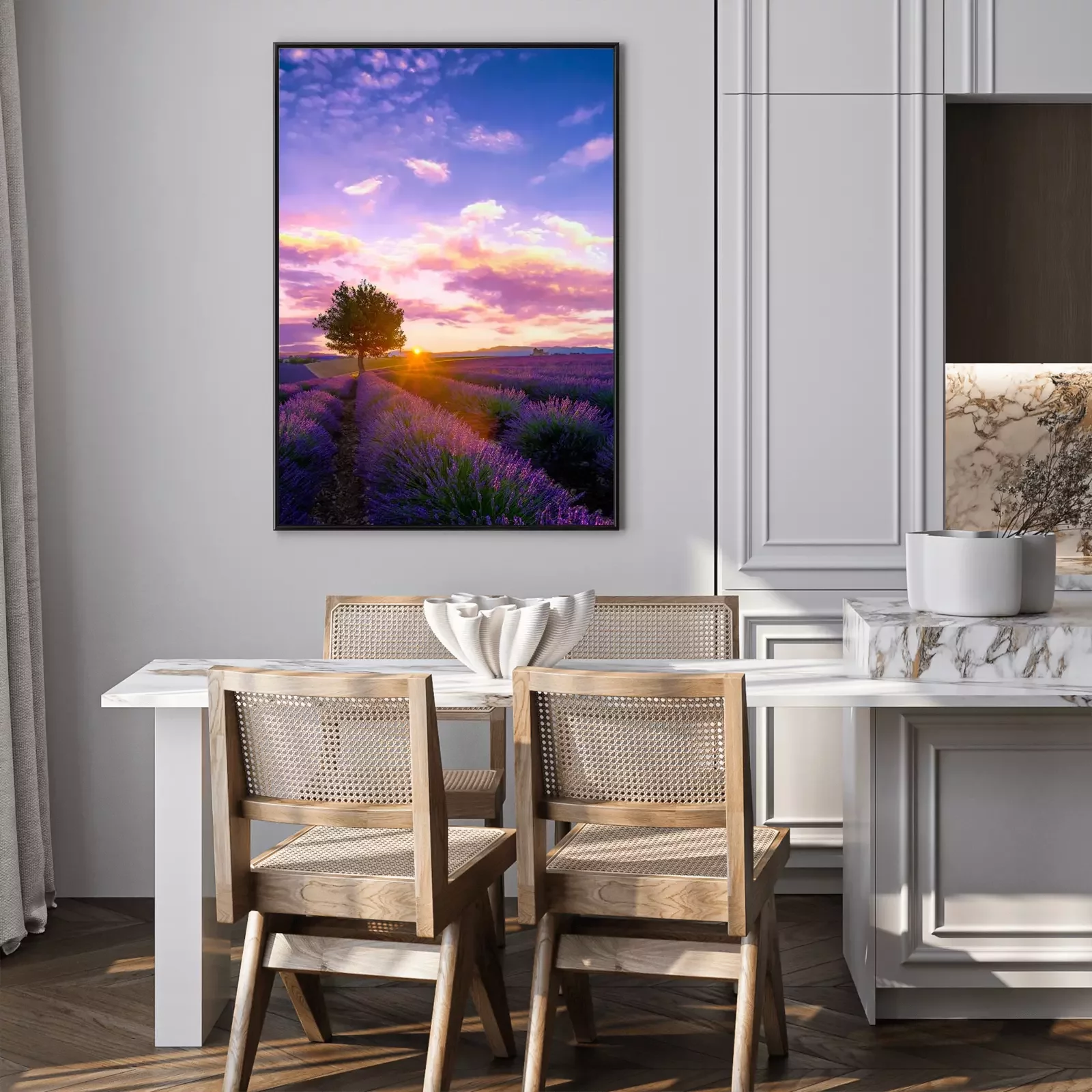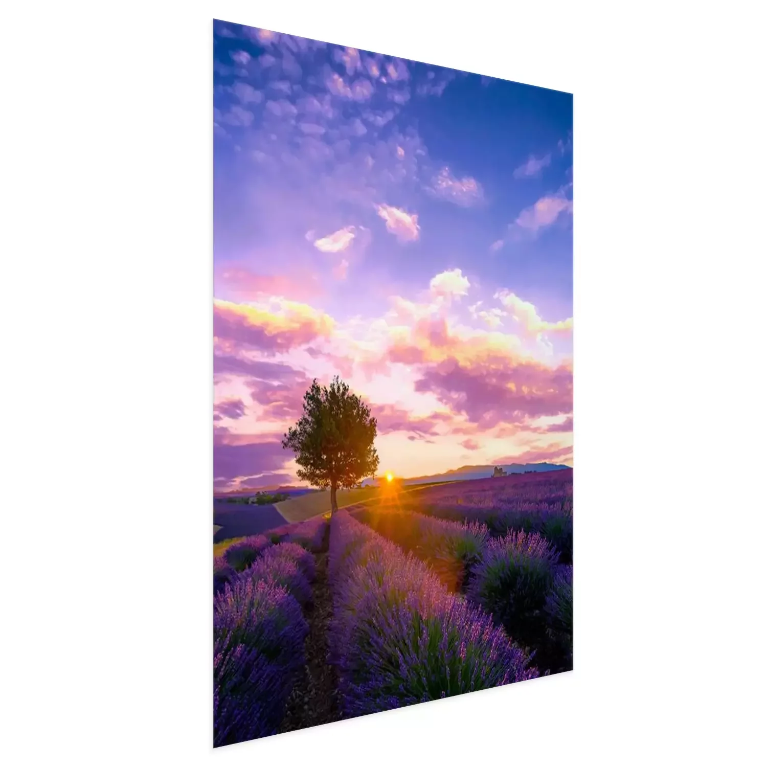 Poster  Arbre dans un champ de lavande au coucher du soleil en Provence, France