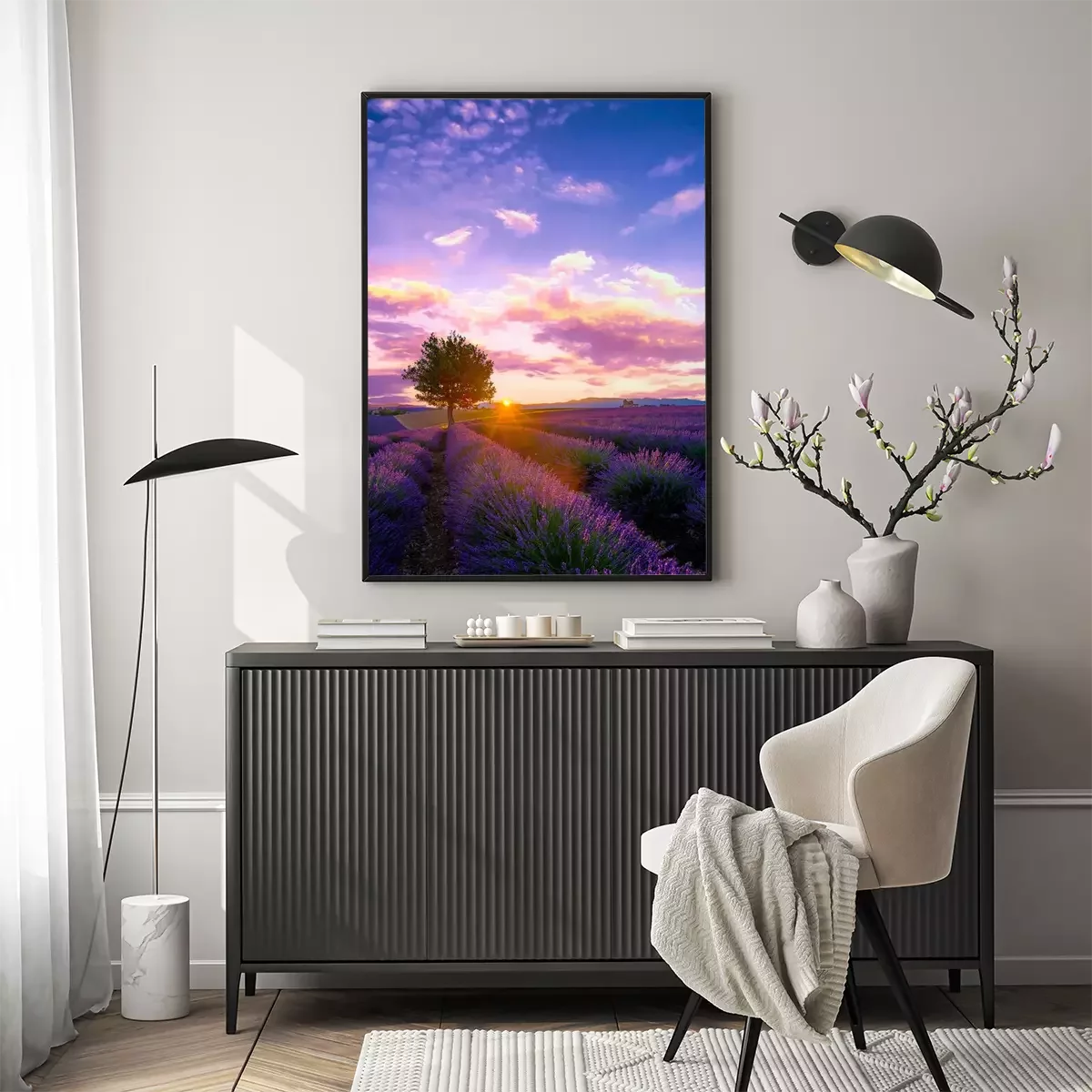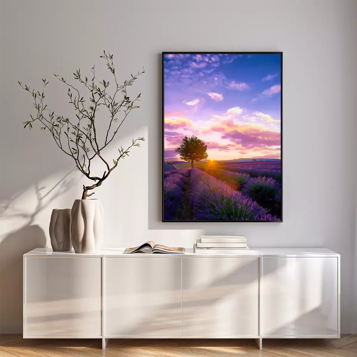 Poster : Arbre dans un champ de lavande au coucher du soleil en Provence, France
