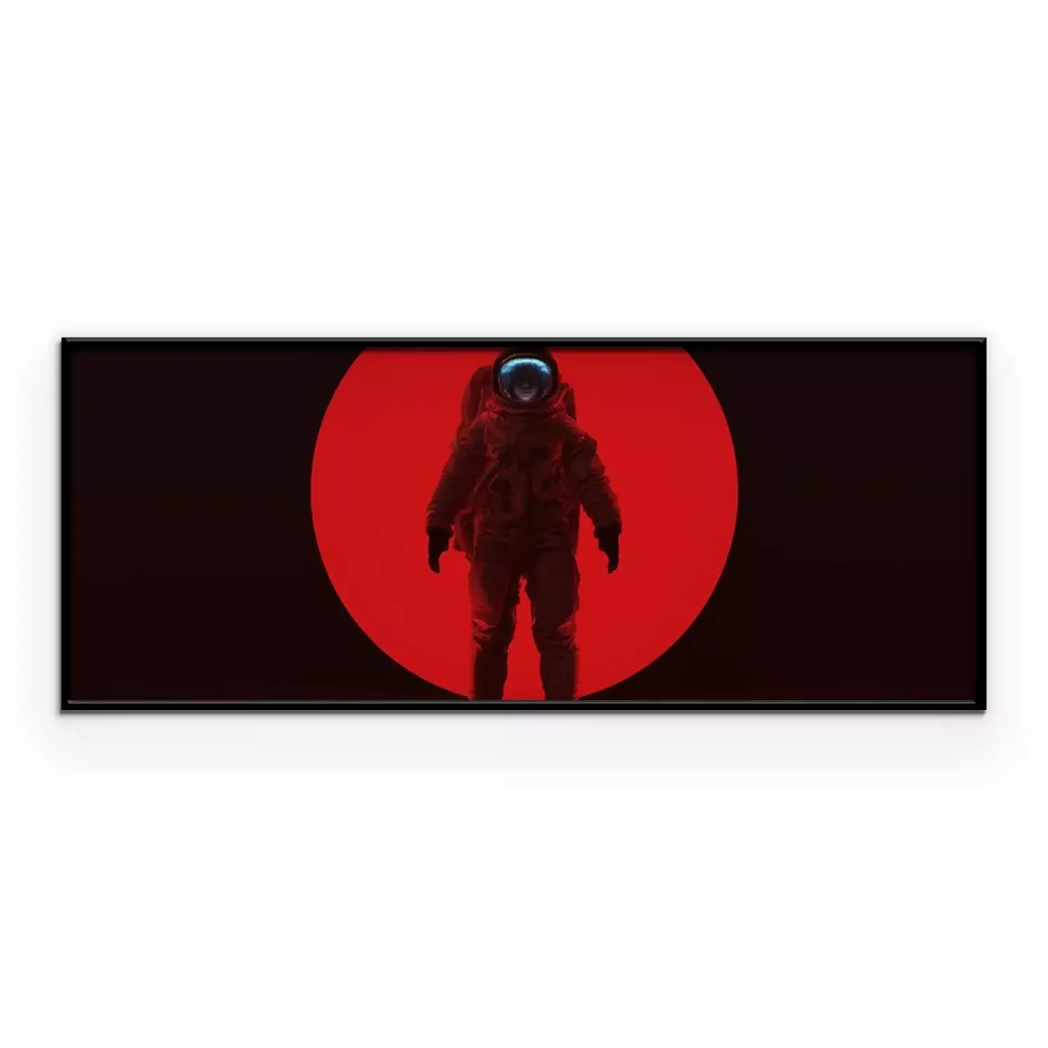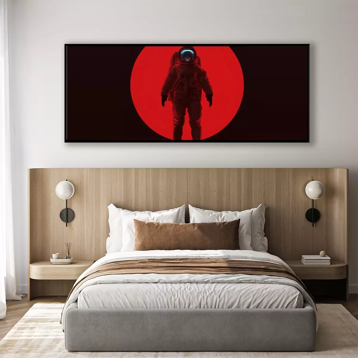 Poster : Astronaut in a Red Space Suit Standing in a Alien Void with a Clear Visor Woman's Face with a Big Red Alien Sphere in a Dark foggy void Front View 3d Illustration 3d render