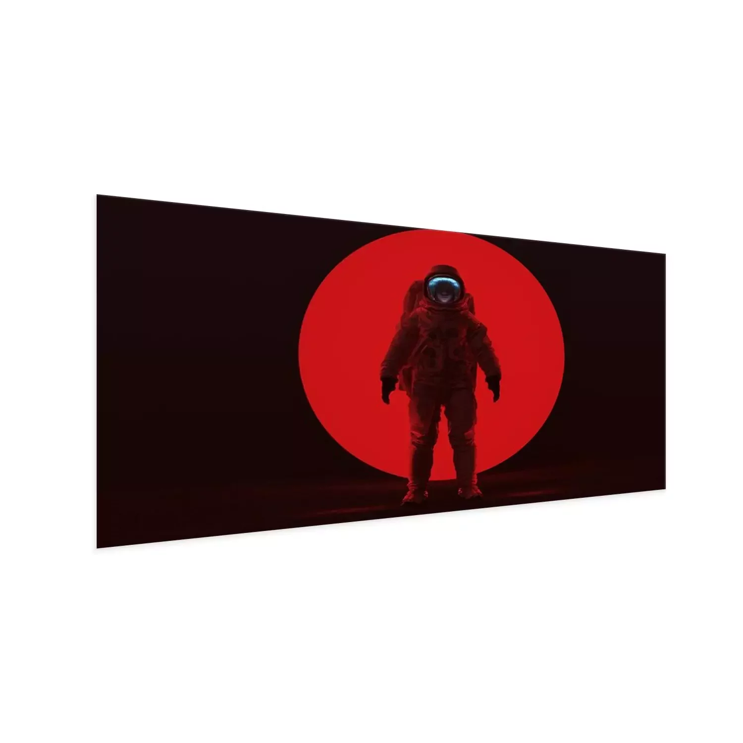 Poster  Astronaut in a Red Space Suit Standing in a Alien Void with a Clear Visor Woman's Face with a Big Red Alien Sphere in a Dark foggy void Front View 3d Illustration 3d render