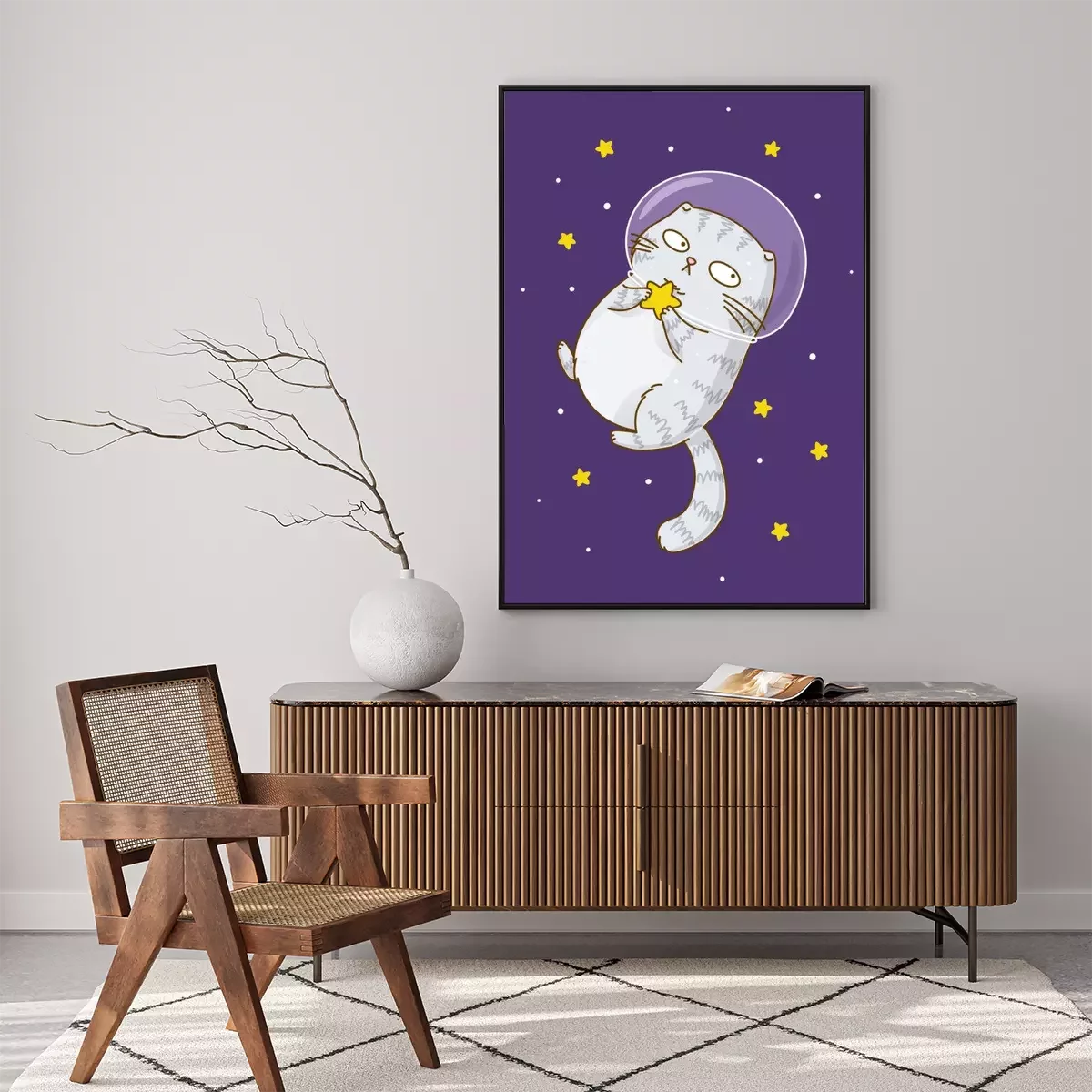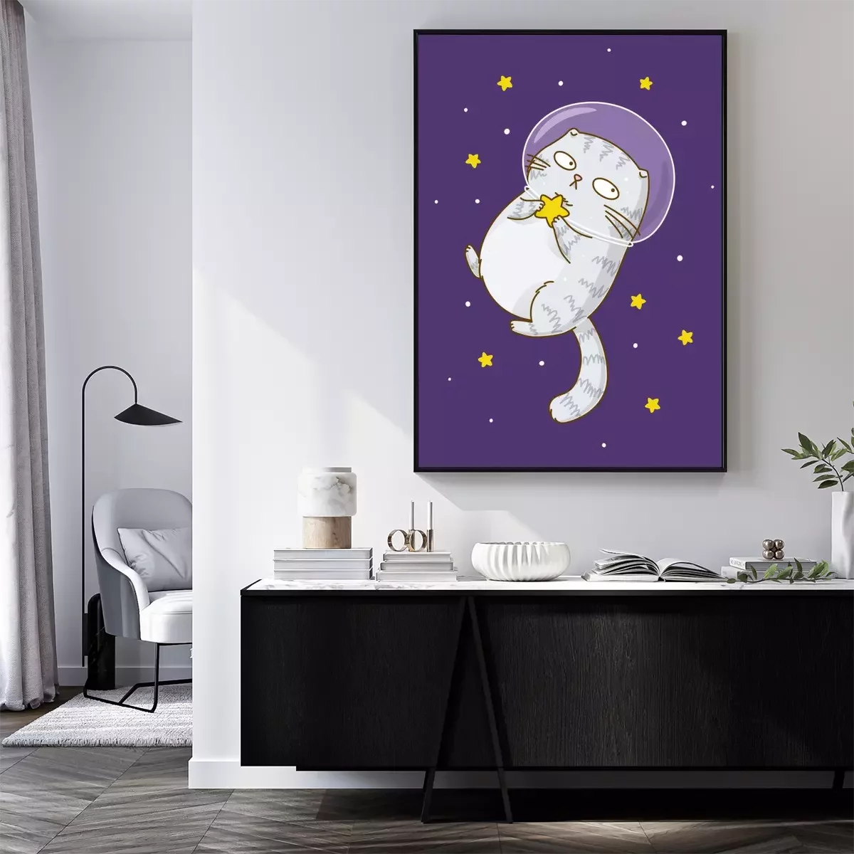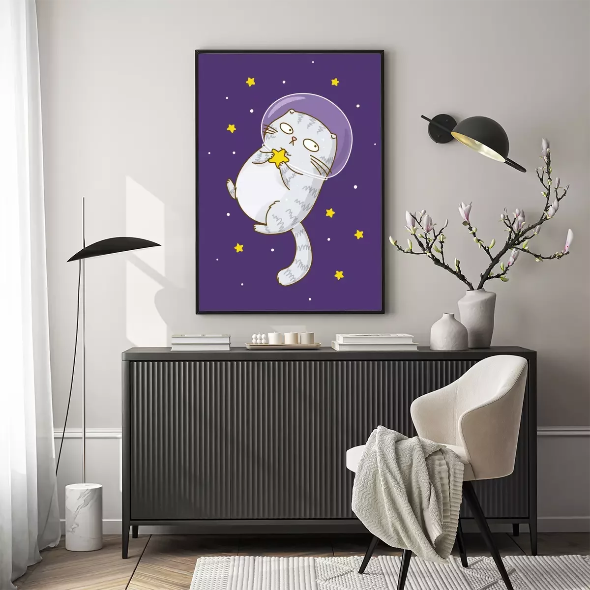 Ce poster de chat est une décoration murale amusante et agréable à regarder. Bien que les motifs galactiques puissent d’abord être associés aux accessoires pour garçons, les couleurs de l’illustration permettent de dépasser ce stéréotype. Le caractère joyeux du poster et l’approche créative de la thématique spatiale en font une décoration idéale pour la chambre d’une fille. Le style féerique du dessin confère à cette illustration un charme unique, et la scène représentée sur ce poster – l’espace avec un chat astronaute – reflète parfaitement la créativité enfantine. L’élément central de l’illustration correspond justement à une représentation humoristique d’un chat. Ce poster astronaute constitue un accent particulièrement attrayant, apportant une touche joyeuse à la décoration. Pour enrichir encore la narration féerique, il peut être judicieux d’ajouter des accessoires comme un éclairage inspiré des planètes ou des stickers muraux en forme d’étoiles, qui mettront en valeur la thématique du dessin. Ce poster, qui ravira les plus jeunes, ne manquera pas de plaire également aux adolescentes. La thématique mise en avant par ce poster – dessin, avec son style charmant, fait aussi écho aux dessins animés ou aux animations de type anime, appréciés par la jeunesse. Puisque la chambre d’une adolescente est aussi un lieu d’étude, accrocher l’illustration près du bureau ou d’une étagère avec des livres rappellera qu’il y a un temps pour apprendre, mais aussi pour nourrir ses passions et se divertir. Le style délicat de ce dessin fait de ce poster de chat une excellente option pour la chambre d’une femme. La couleur dominante de l’illustration est le violet, ce qui créera un contraste idéal avec des tons tels que le blanc, le beige ou le gris, de plus en plus présents dans les intérieurs. Dans une chambre claire, optez pour un cadre métallique délicat afin de mettre en valeur avec élégance votre poster. L’espace représenté sur le dessin est orné de quelques étoiles dessinées avec des lignes douces et arrondies. L’harmonie des couleurs et de la composition fait de cette décoration murale un élément qui s’intègrera parfaitement dans une pièce dédiée à la détente.