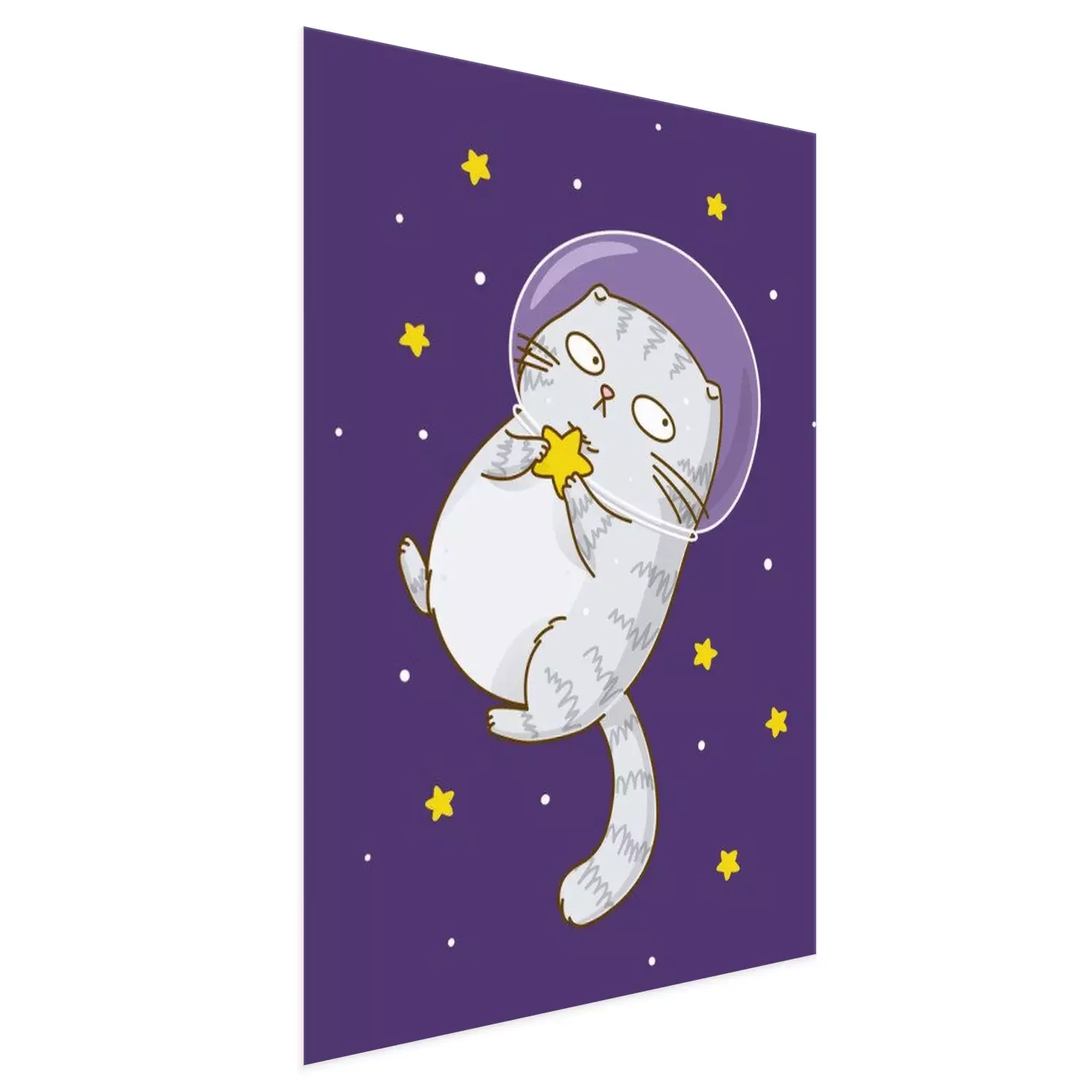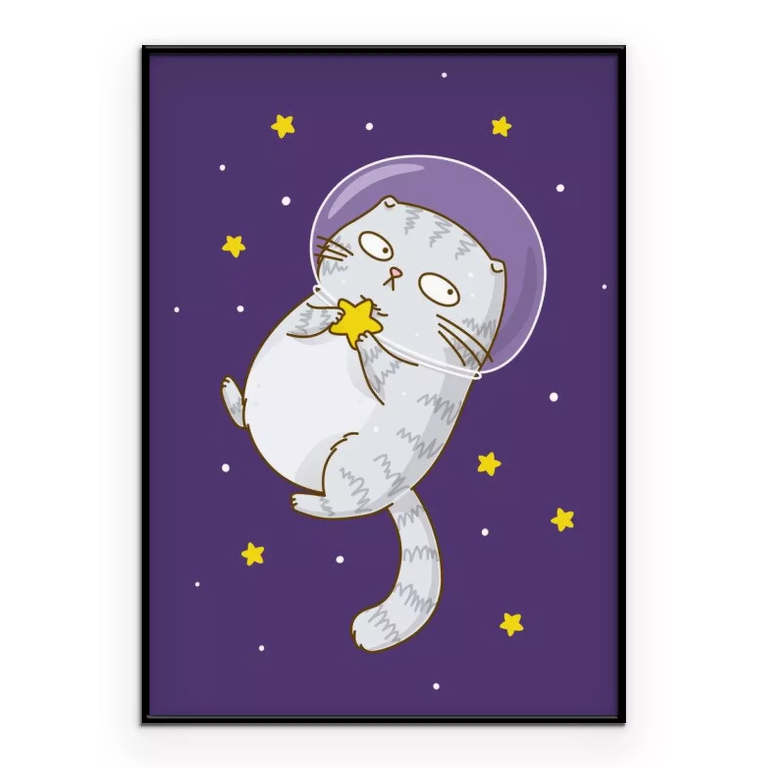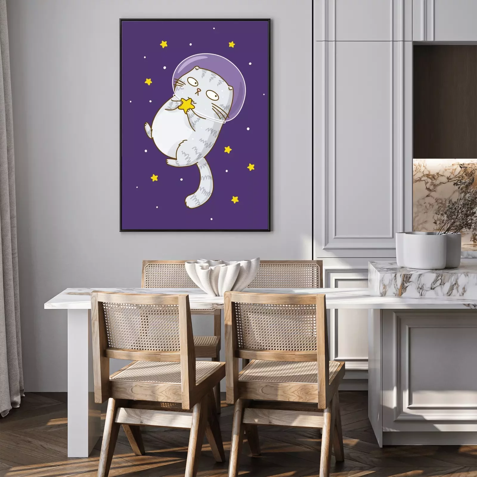 Ce poster de chat est une décoration murale amusante et agréable à regarder. Bien que les motifs galactiques puissent d’abord être associés aux accessoires pour garçons, les couleurs de l’illustration permettent de dépasser ce stéréotype. Le caractère joyeux du poster et l’approche créative de la thématique spatiale en font une décoration idéale pour la chambre d’une fille. Le style féerique du dessin confère à cette illustration un charme unique, et la scène représentée sur ce poster – l’espace avec un chat astronaute – reflète parfaitement la créativité enfantine. L’élément central de l’illustration correspond justement à une représentation humoristique d’un chat. Ce poster astronaute constitue un accent particulièrement attrayant, apportant une touche joyeuse à la décoration. Pour enrichir encore la narration féerique, il peut être judicieux d’ajouter des accessoires comme un éclairage inspiré des planètes ou des stickers muraux en forme d’étoiles, qui mettront en valeur la thématique du dessin. Ce poster, qui ravira les plus jeunes, ne manquera pas de plaire également aux adolescentes. La thématique mise en avant par ce poster – dessin, avec son style charmant, fait aussi écho aux dessins animés ou aux animations de type anime, appréciés par la jeunesse. Puisque la chambre d’une adolescente est aussi un lieu d’étude, accrocher l’illustration près du bureau ou d’une étagère avec des livres rappellera qu’il y a un temps pour apprendre, mais aussi pour nourrir ses passions et se divertir. Le style délicat de ce dessin fait de ce poster de chat une excellente option pour la chambre d’une femme. La couleur dominante de l’illustration est le violet, ce qui créera un contraste idéal avec des tons tels que le blanc, le beige ou le gris, de plus en plus présents dans les intérieurs. Dans une chambre claire, optez pour un cadre métallique délicat afin de mettre en valeur avec élégance votre poster. L’espace représenté sur le dessin est orné de quelques étoiles dessinées avec des lignes douces et arrondies. L’harmonie des couleurs et de la composition fait de cette décoration murale un élément qui s’intègrera parfaitement dans une pièce dédiée à la détente.
