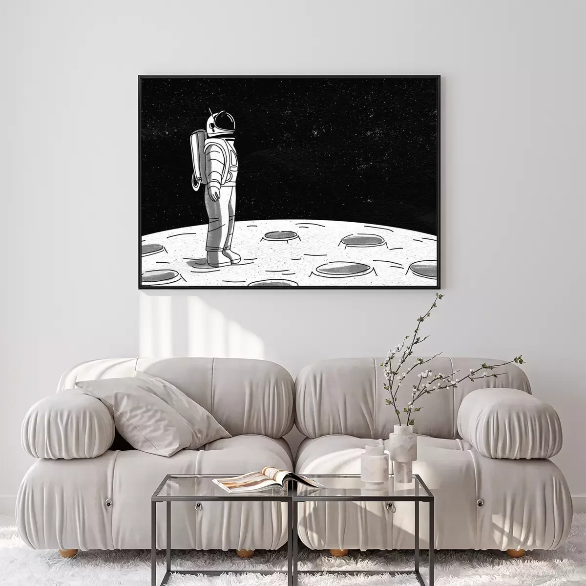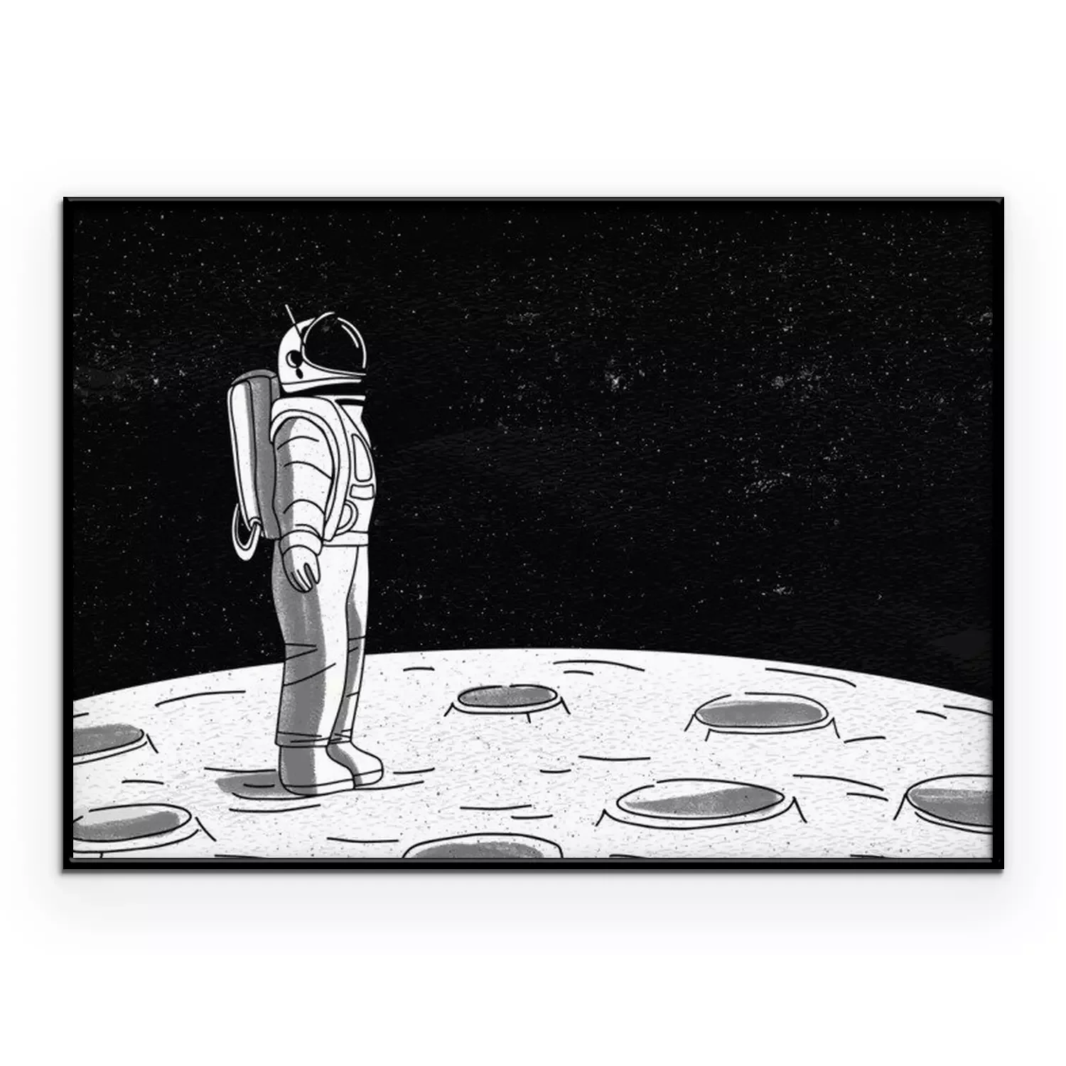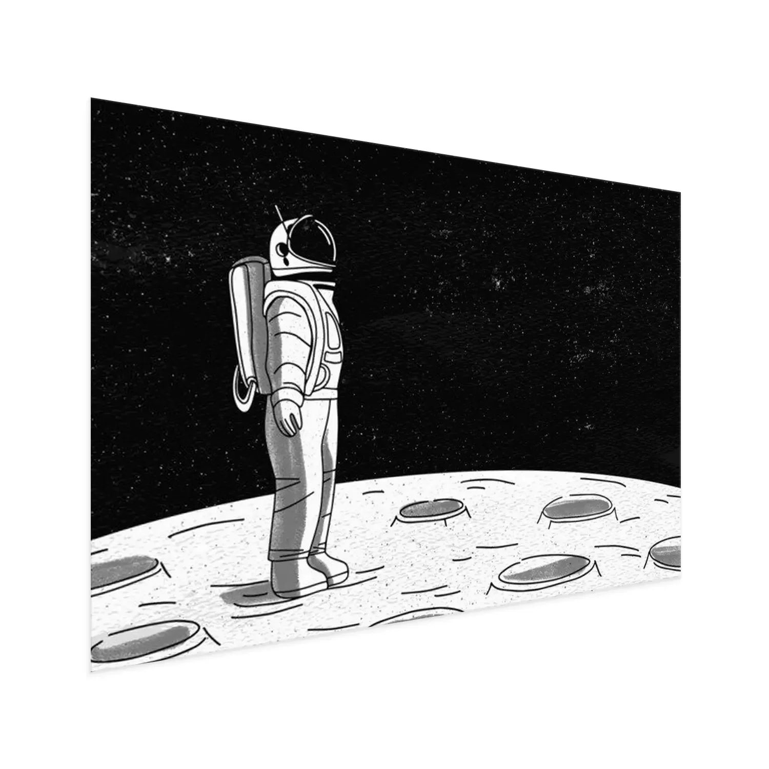 Poster  Astronaute solitaire en combinaison spatiale debout à la surface de la Lune et regardant l'espace plein d'étoiles. Cosmonaute explorant une planète ou un objet céleste en mission. Illustration vectori