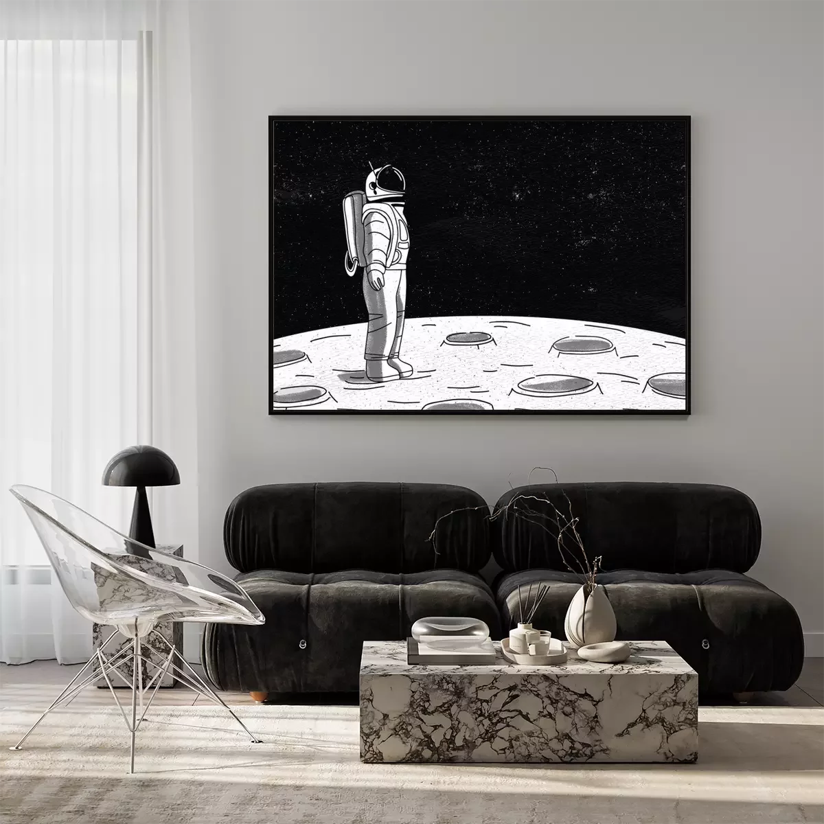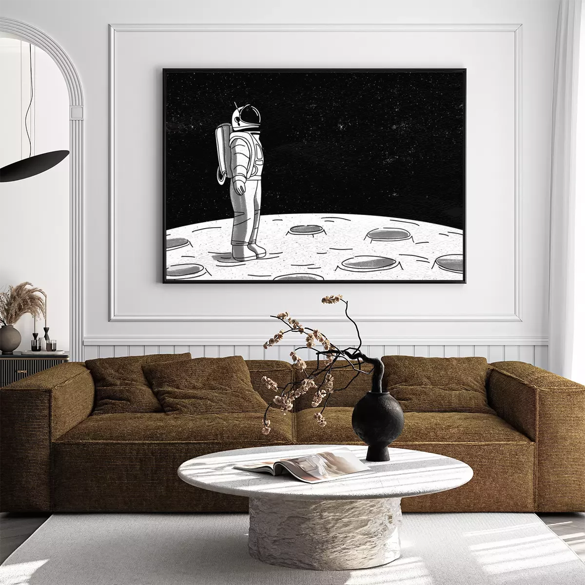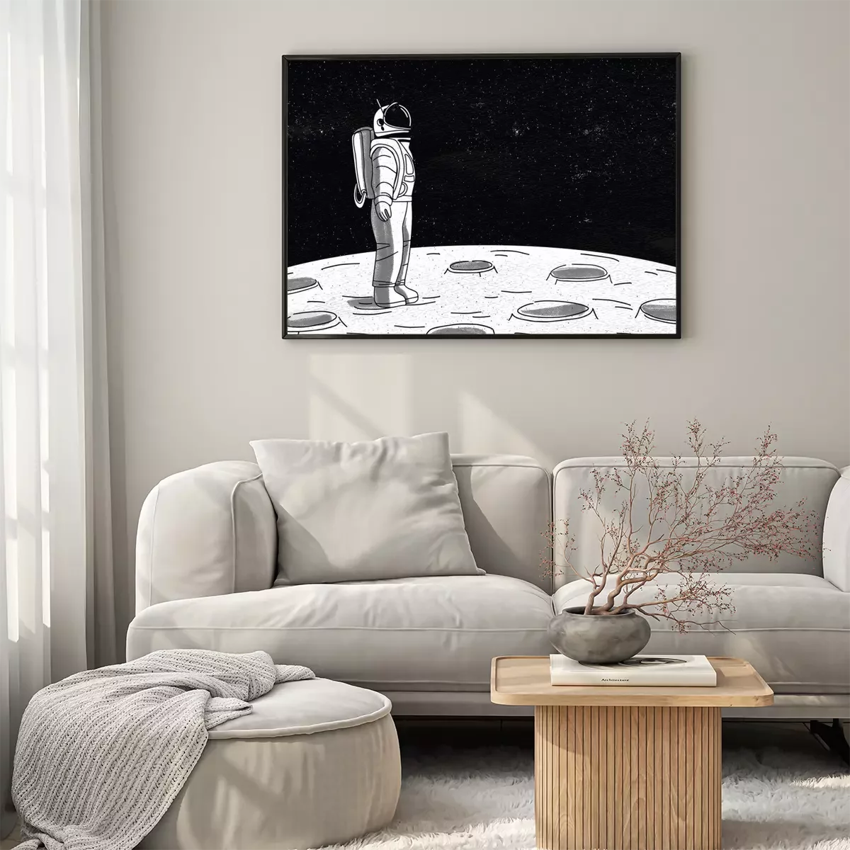 Poster  Astronaute solitaire en combinaison spatiale debout à la surface de la Lune et regardant l'espace plein d'étoiles. Cosmonaute explorant une planète ou un objet céleste en mission. Illustration vectori