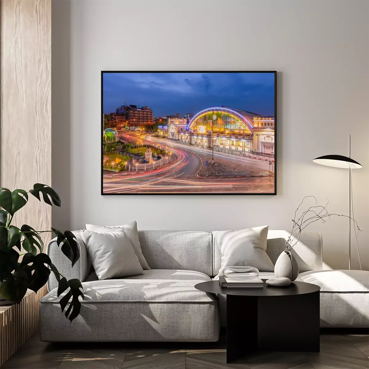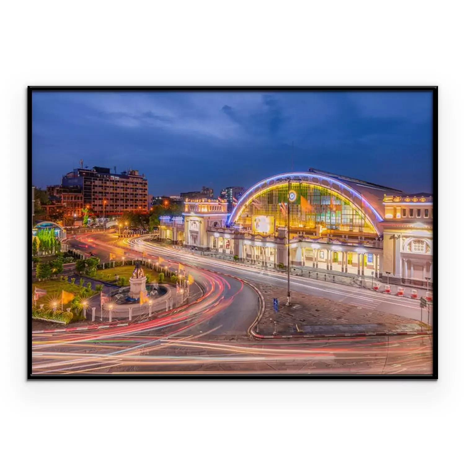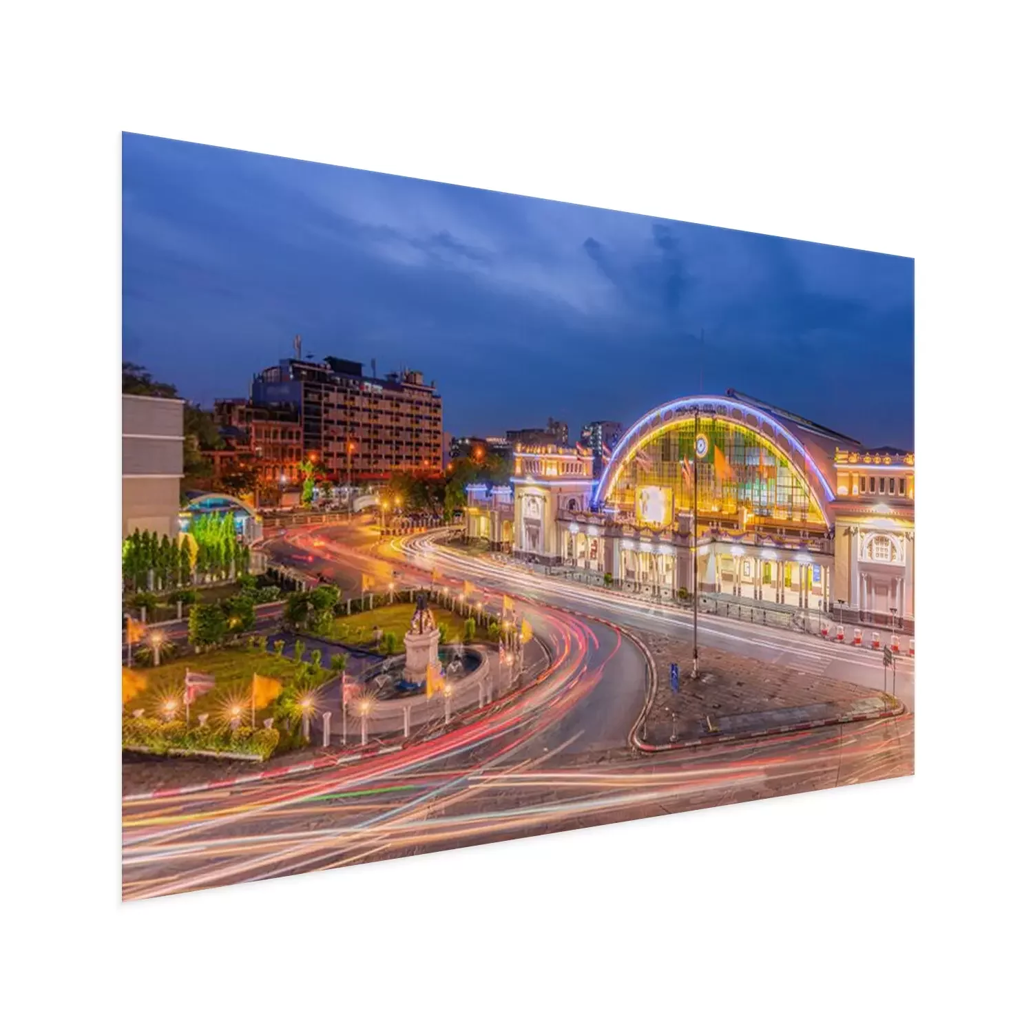 Poster  Bangkok Railway Station (Hua Lamphong Railway Station,MRT) and traffic at night in Bangkok, Thailand.