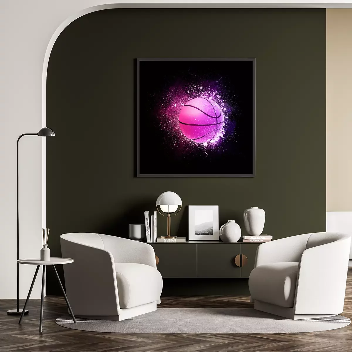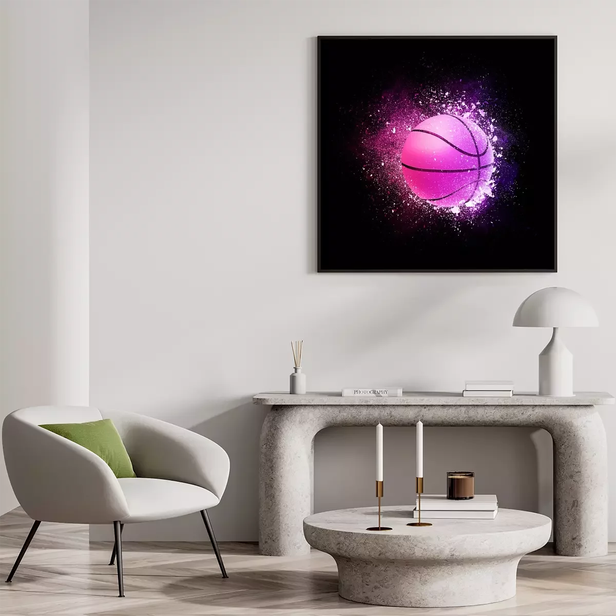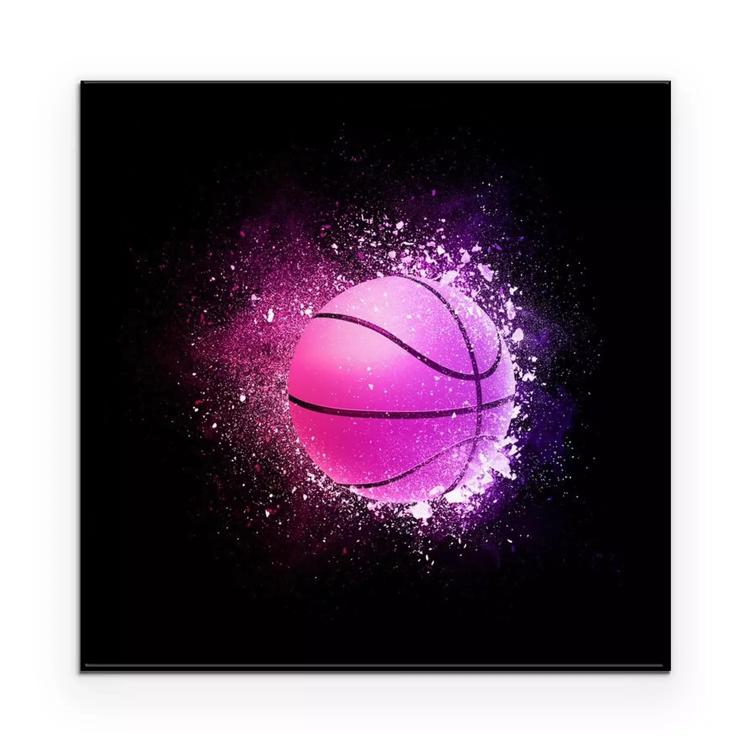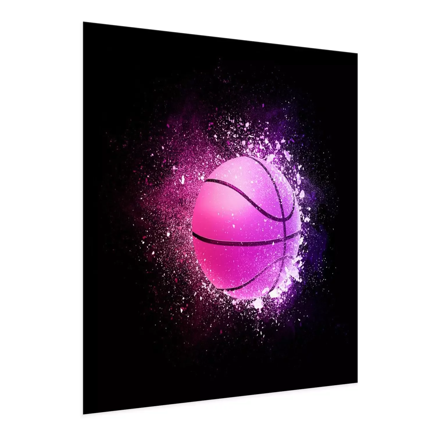 Poster : Basketball Ball flying in violet particles isolated on black background. Sport competition concept for basketball tournament poster, placard, card or banner.