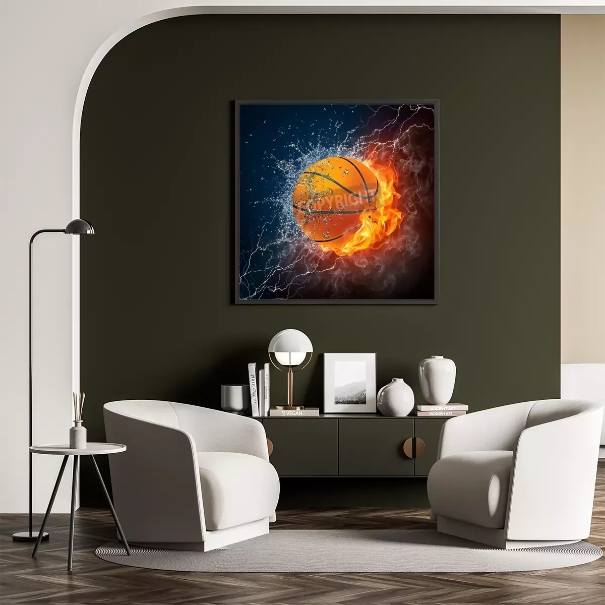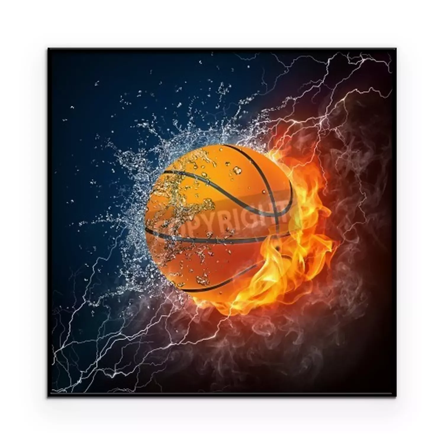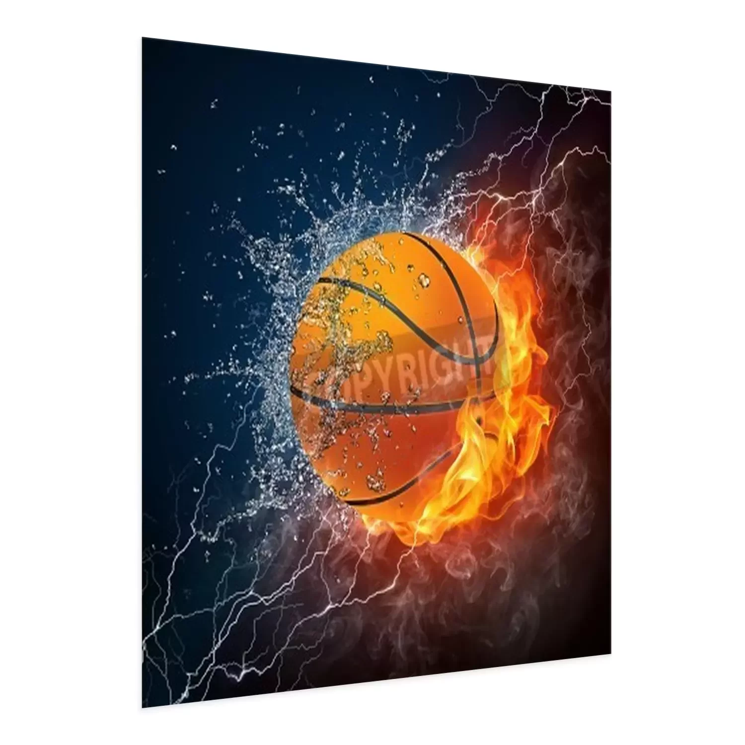 Poster  Basketball Ball on Fire and Water. 2D Graphics. Computer Design.