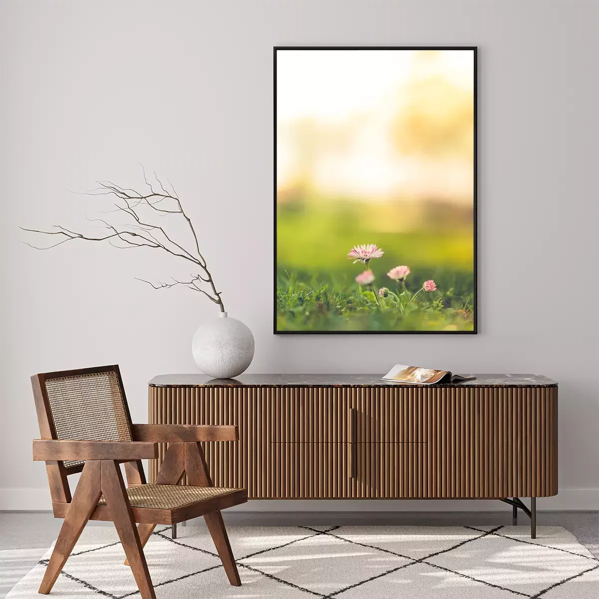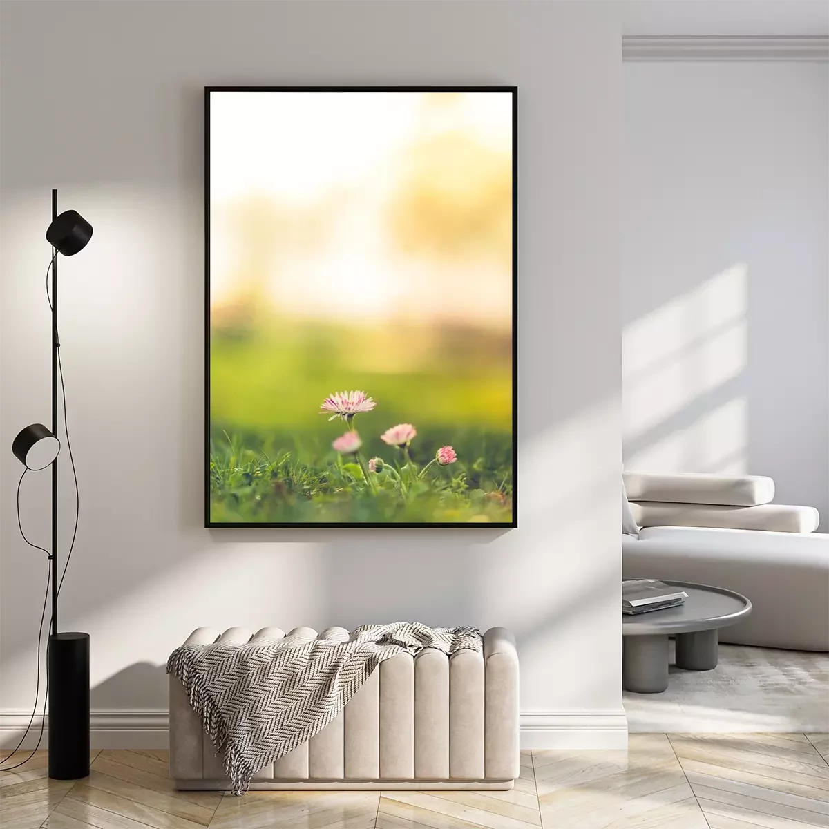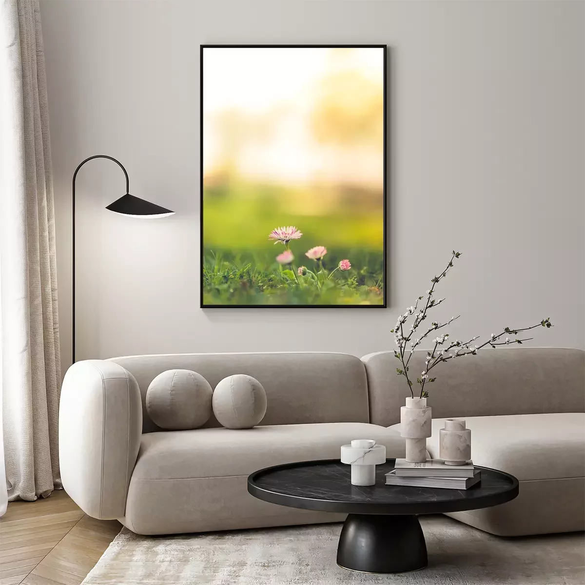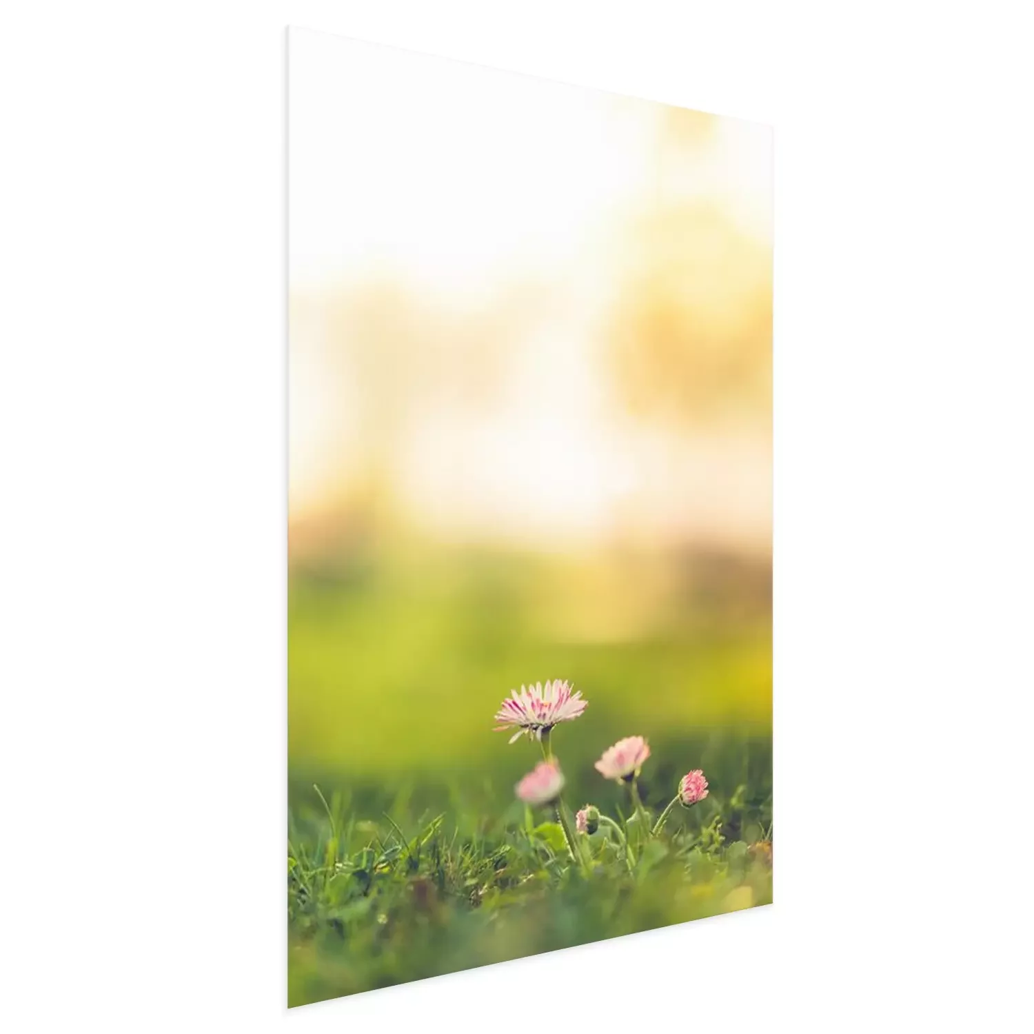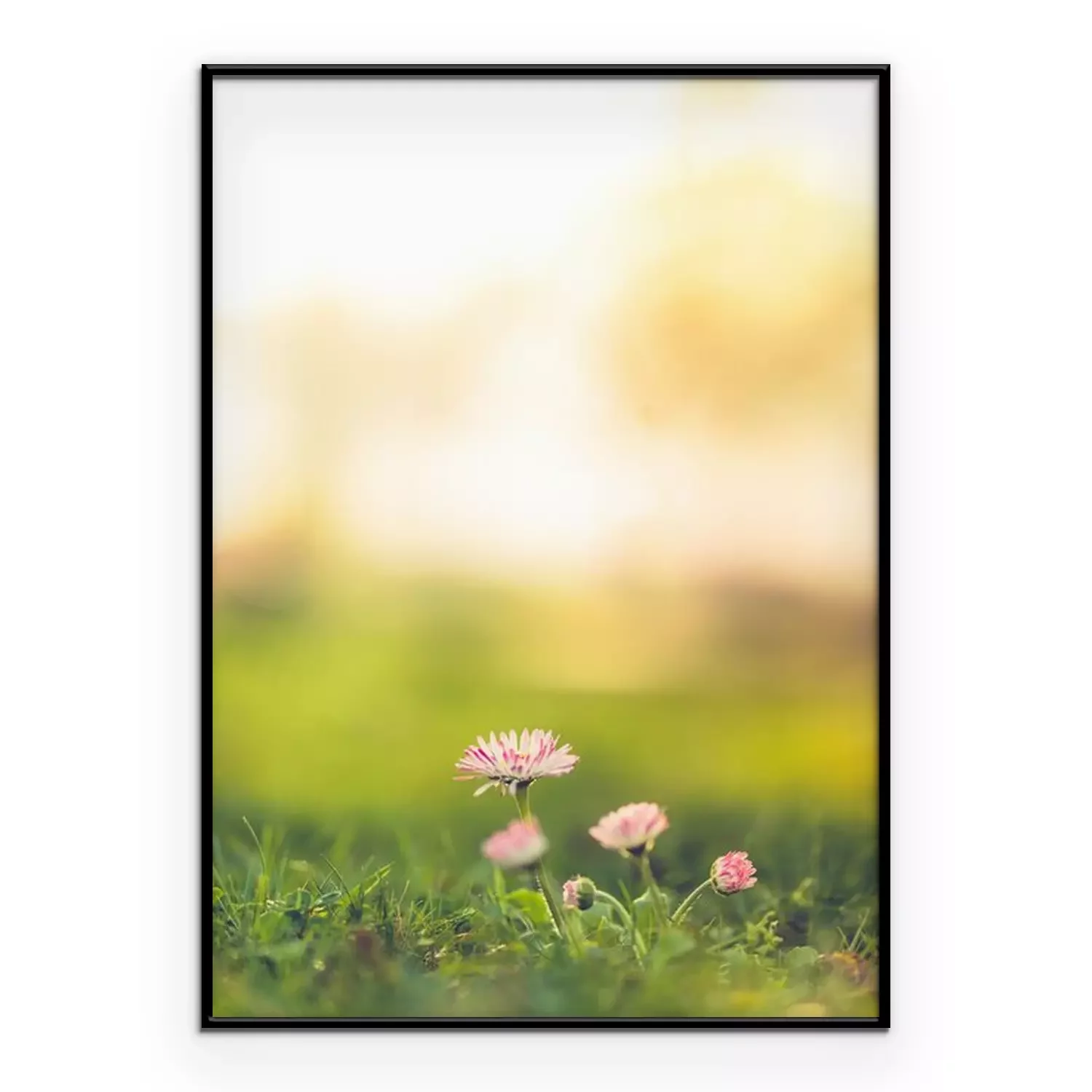 Poster  Beautiful nature closeup meadow flowers, blurred natural background, forest in soft sunlight. Sunset nature landscape.Spring flower in the meadow,spring nature background