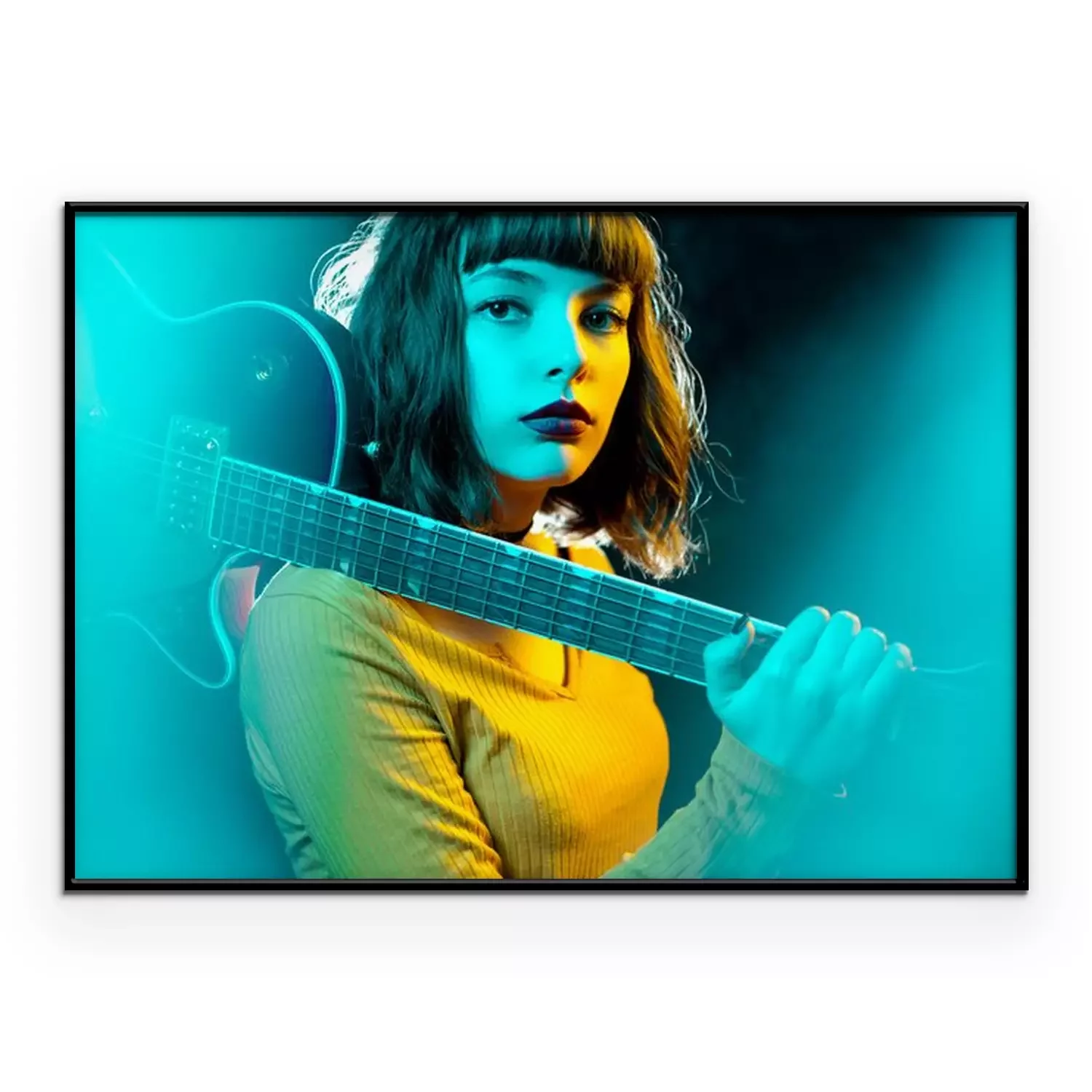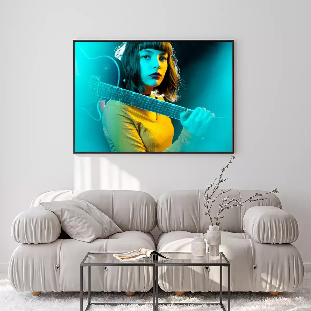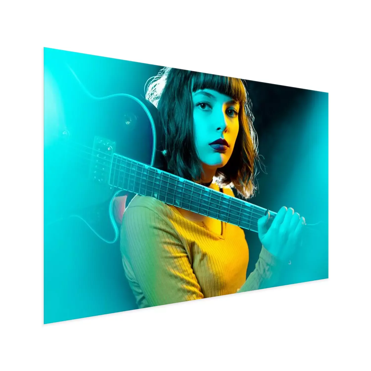 Poster : Beautiful young hipster woman with curly hair with red guitar in neon lights. Rock musician is playing electrical guitar. 90s style concept.