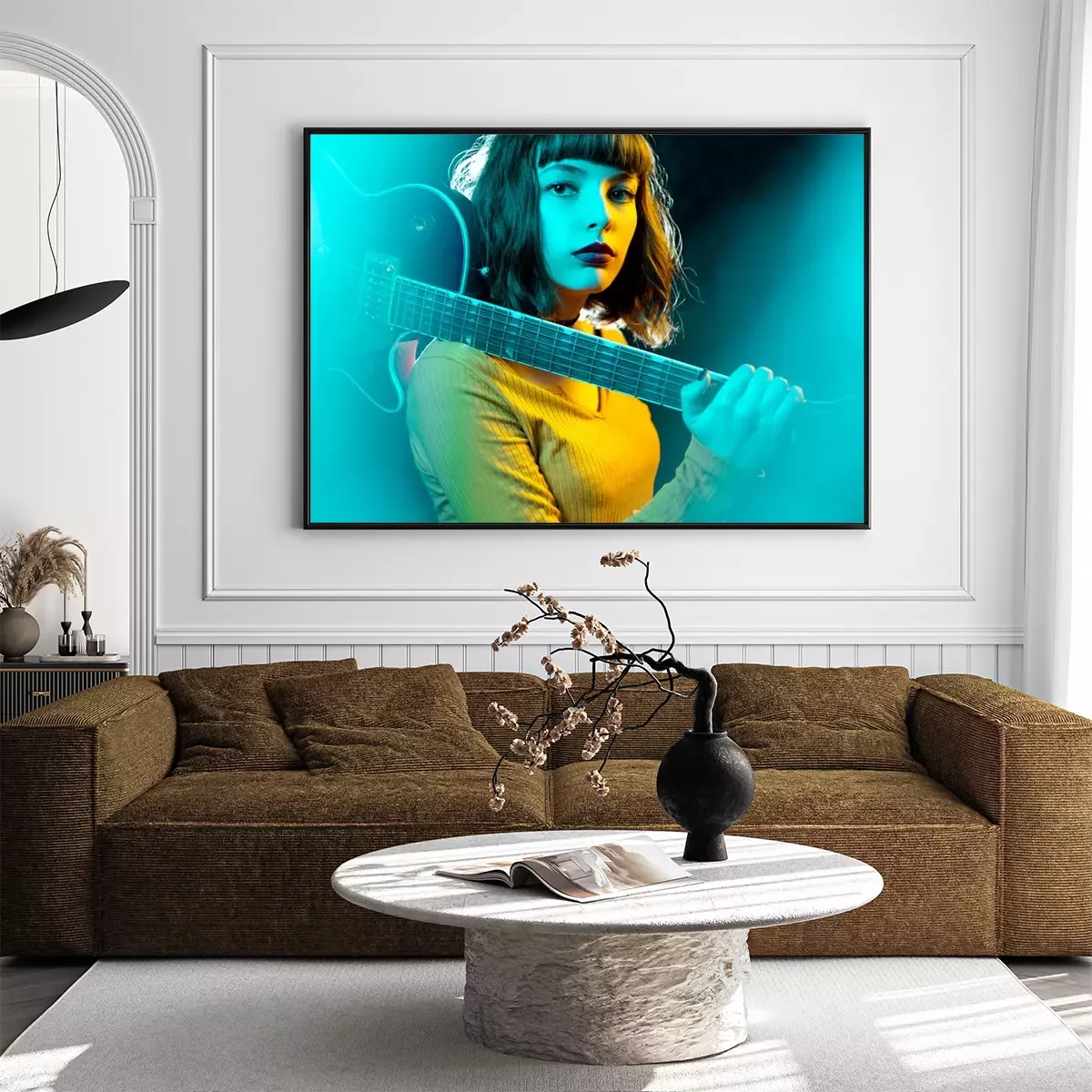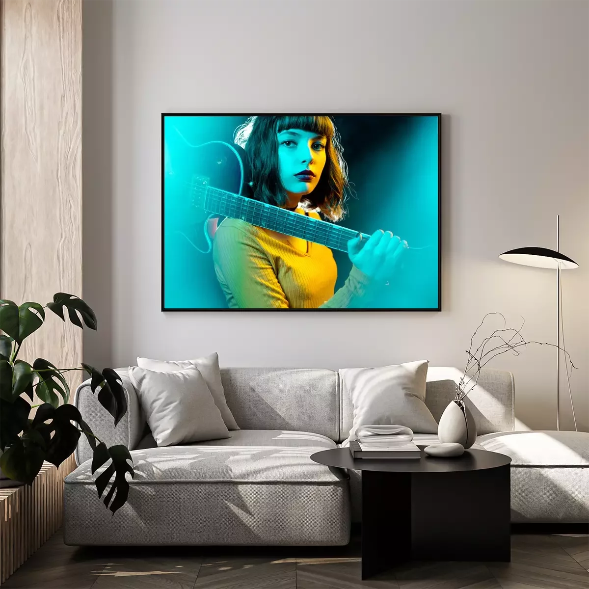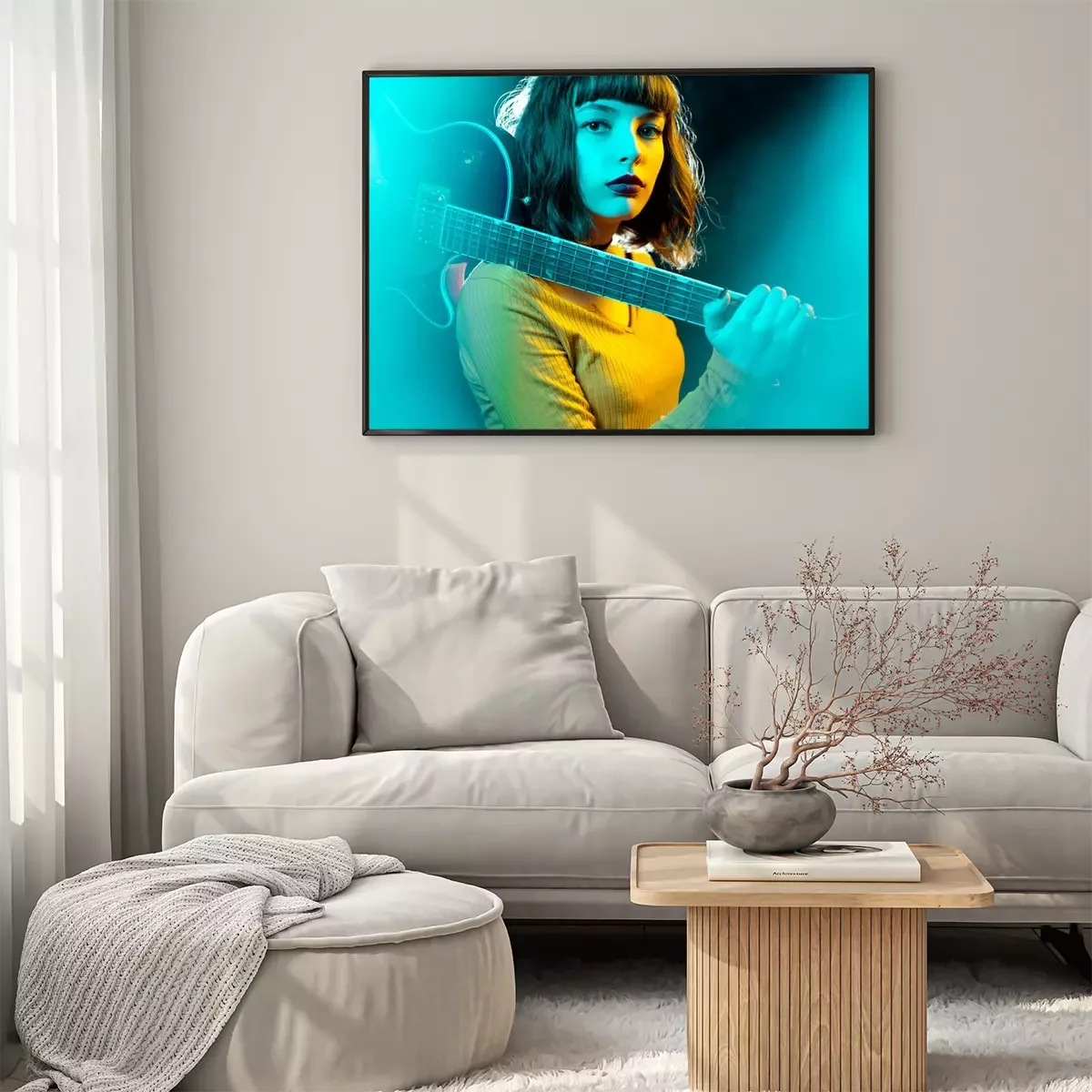 Poster : Beautiful young hipster woman with curly hair with red guitar in neon lights. Rock musician is playing electrical guitar. 90s style concept.