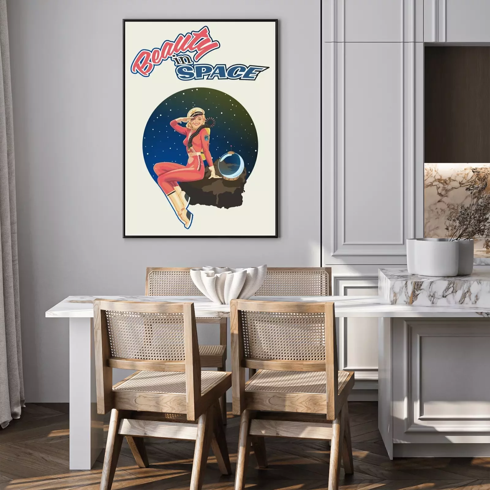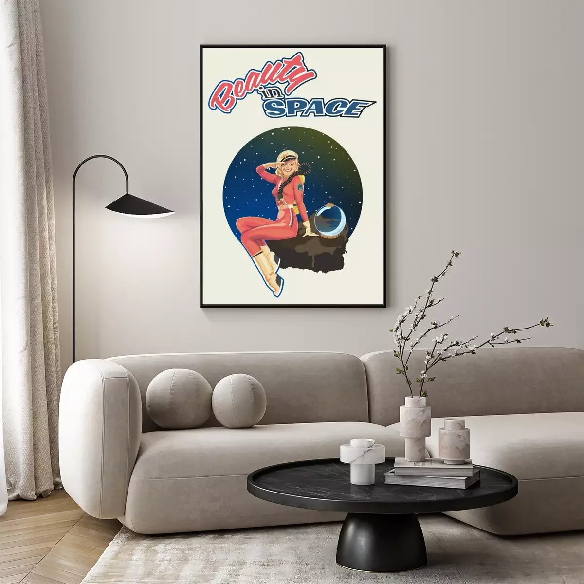 Poster : Beauty in Space, Retro Pin Up Girl Illustration, 1940s - 1950s Retro Futurism Style Poster, Woman Astronaut, Space Background