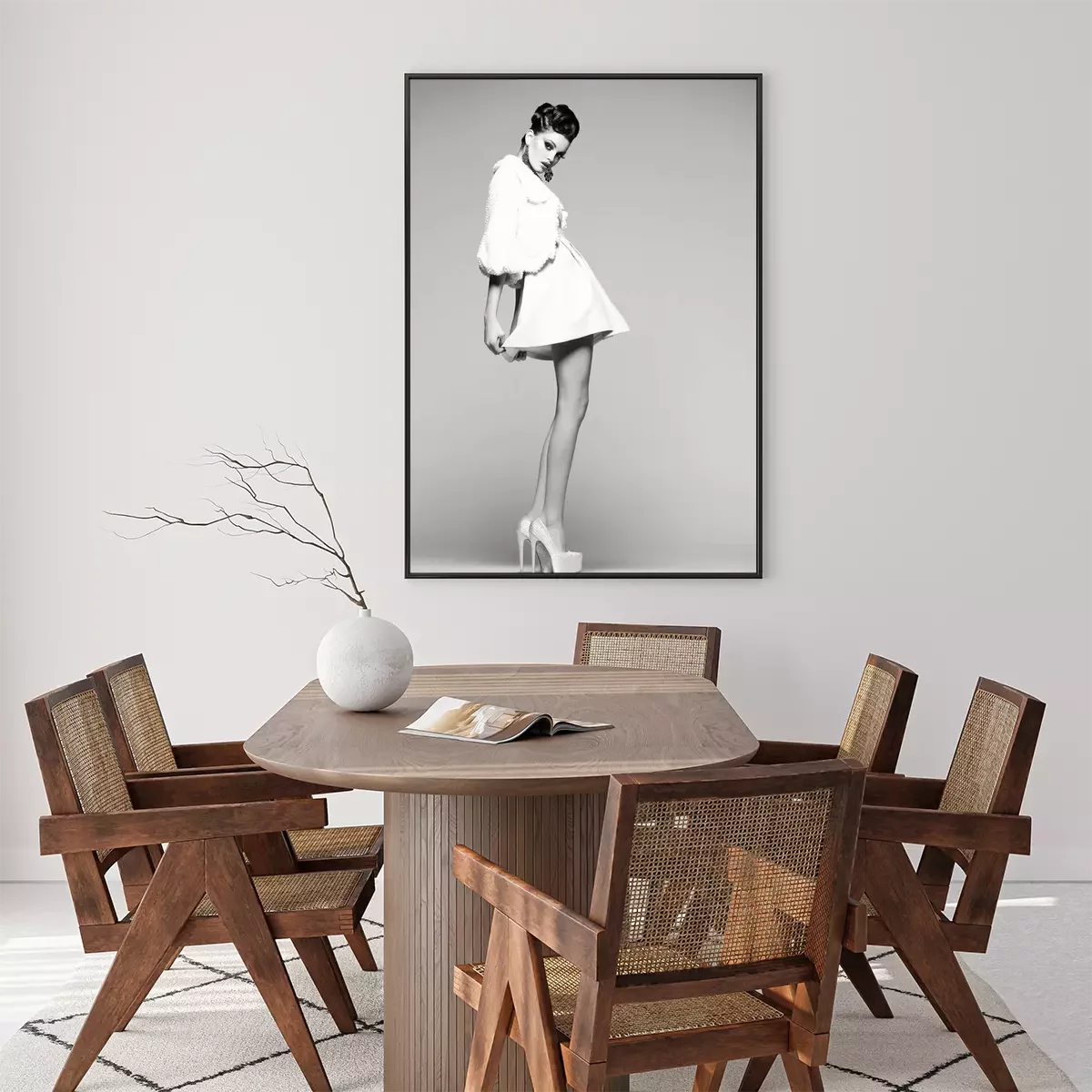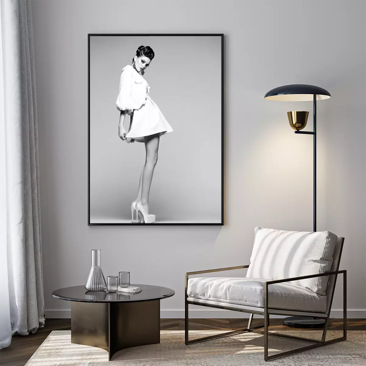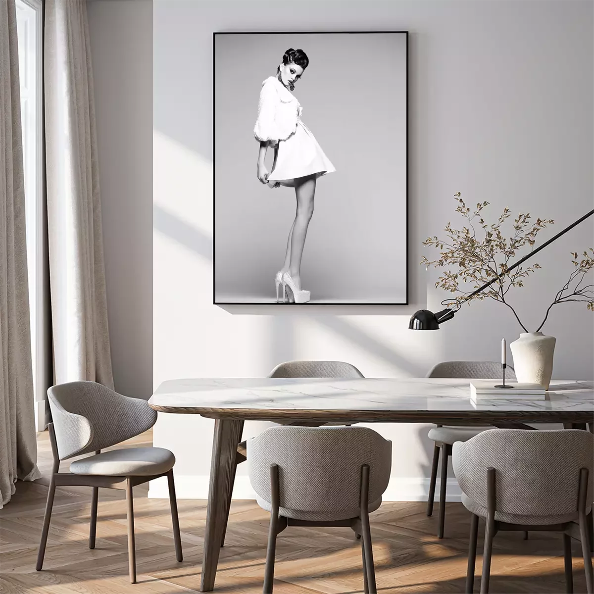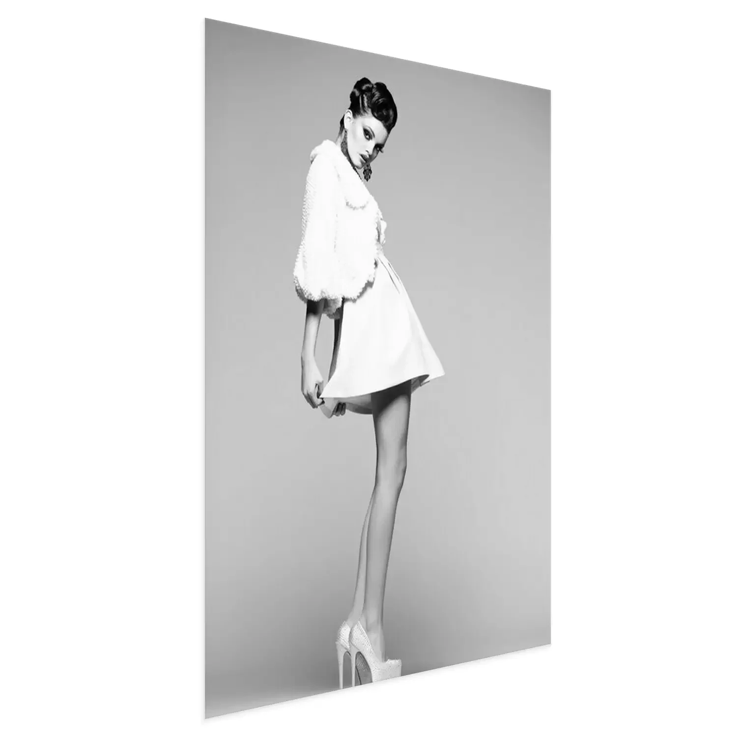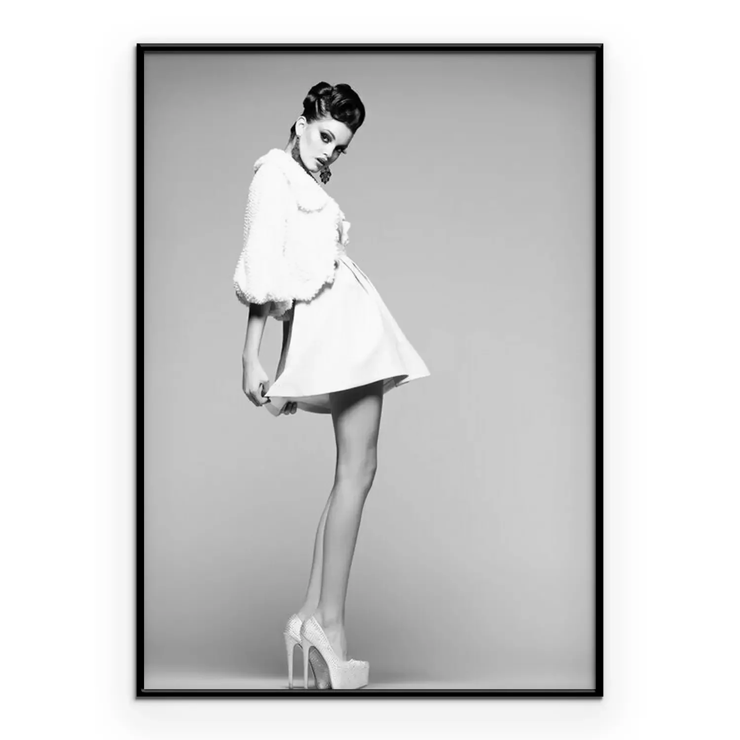 Poster  belle femme avec de longues jambes en robe blanche et talons hauts