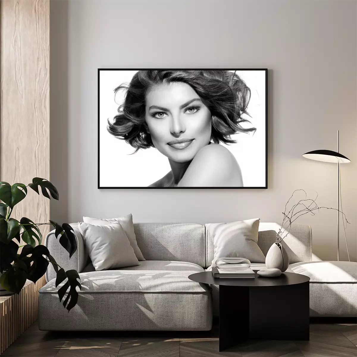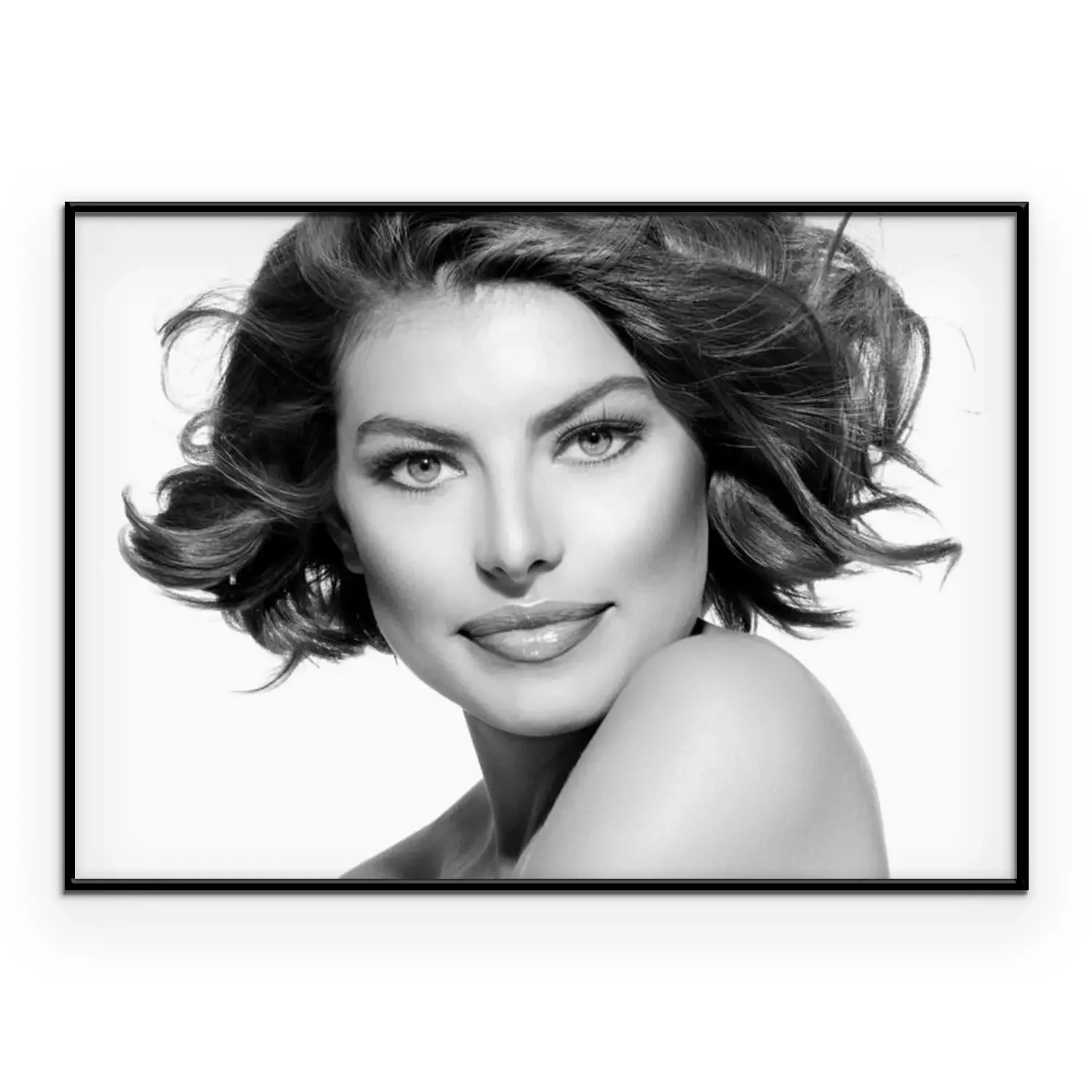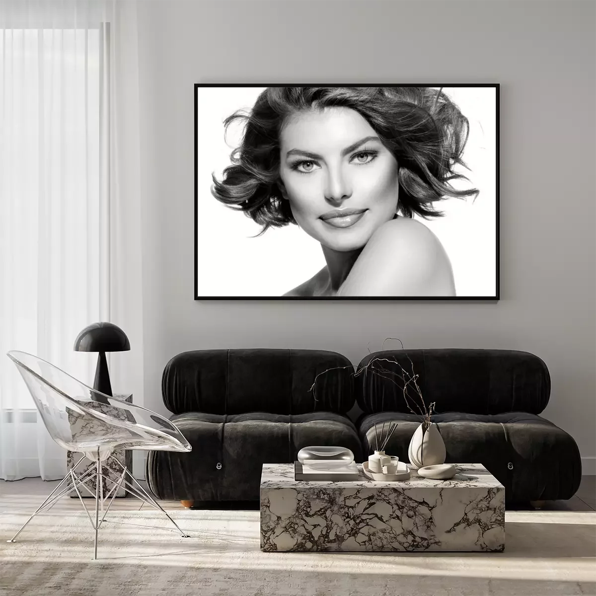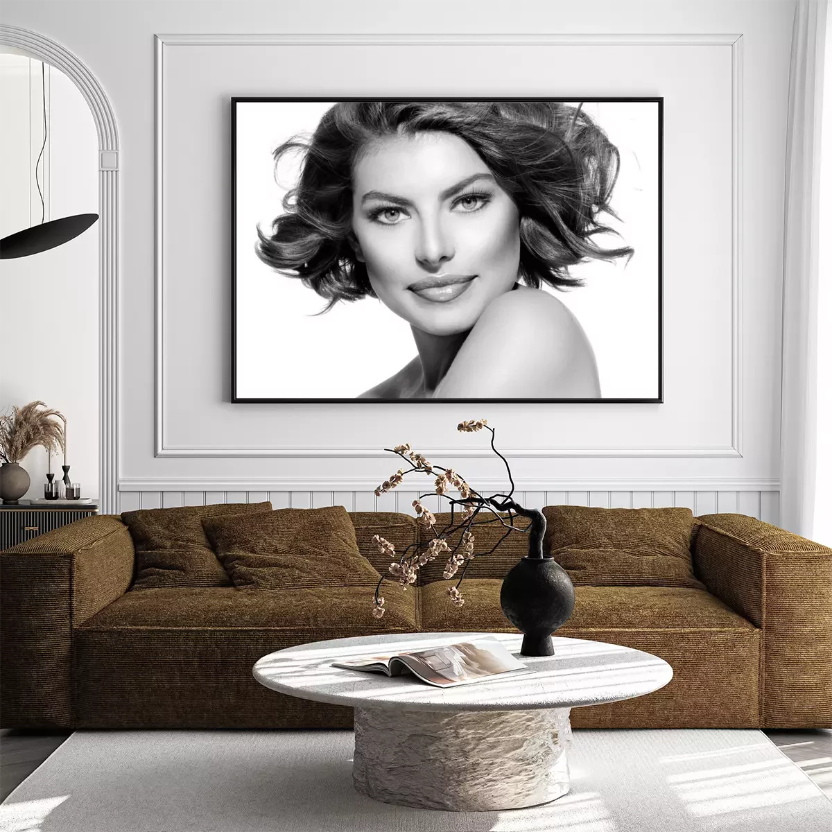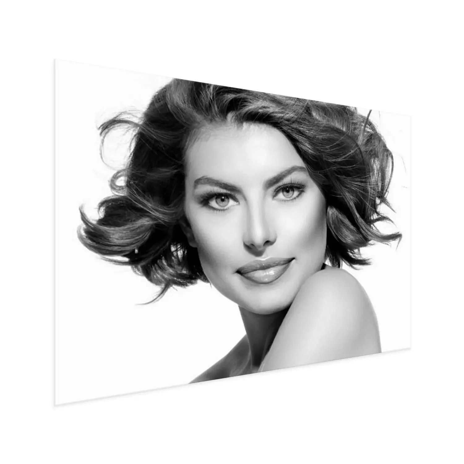 Poster : Belle jeune femme en noir et blanc Portrait. Cheveux courts bouclés