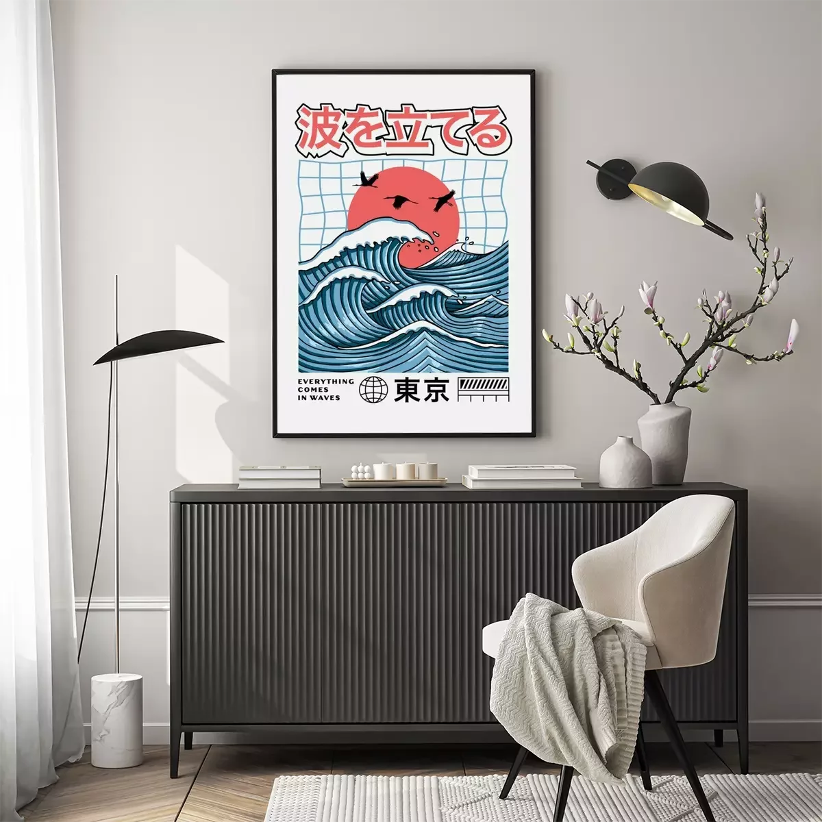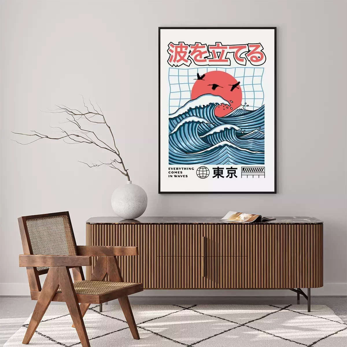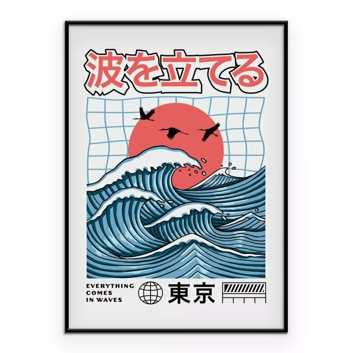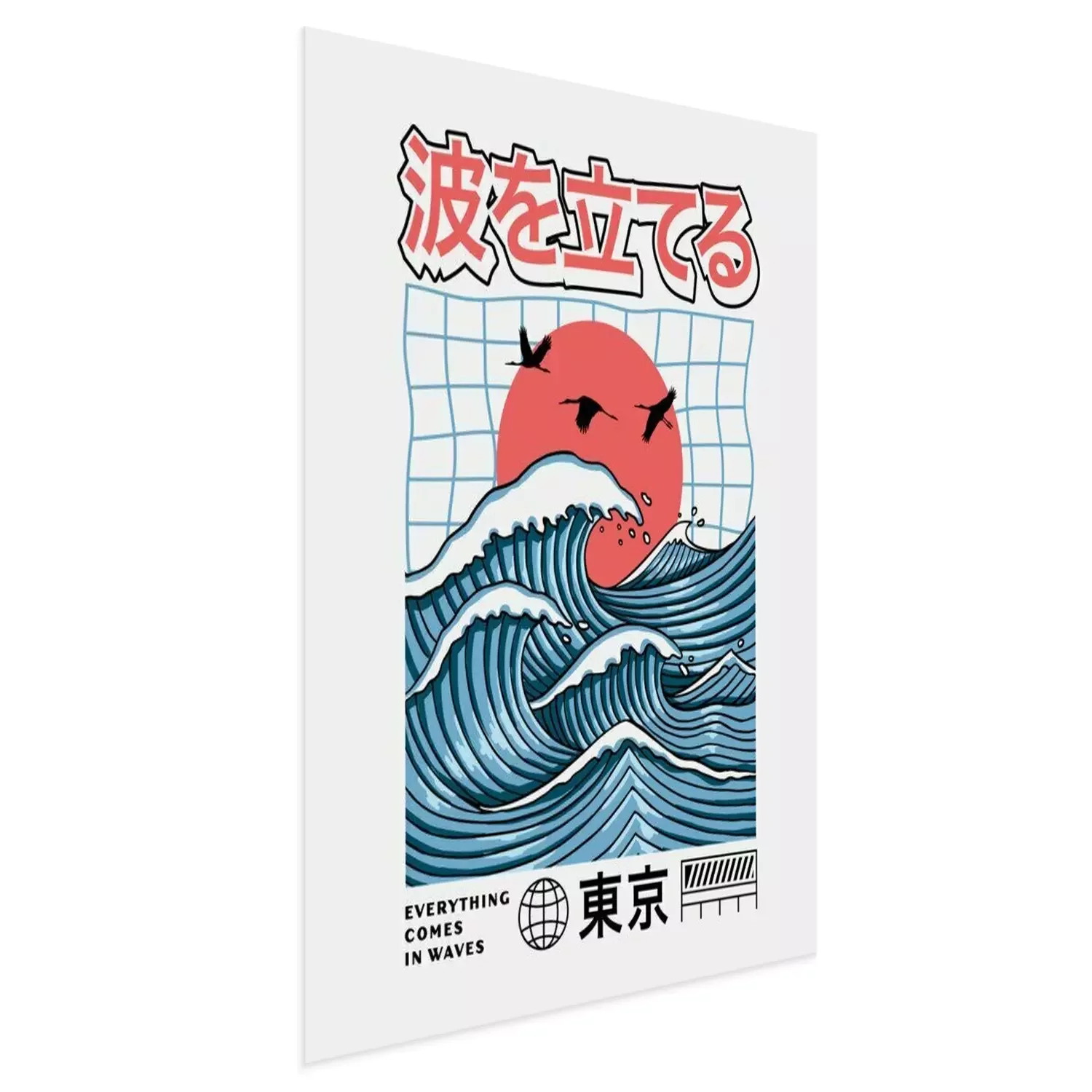 Poster : Big waves with the red sun. Vector graphics for t-shirt prints, posters and other uses. Japanese text translation: Make Waves(above), Tokyo(below).